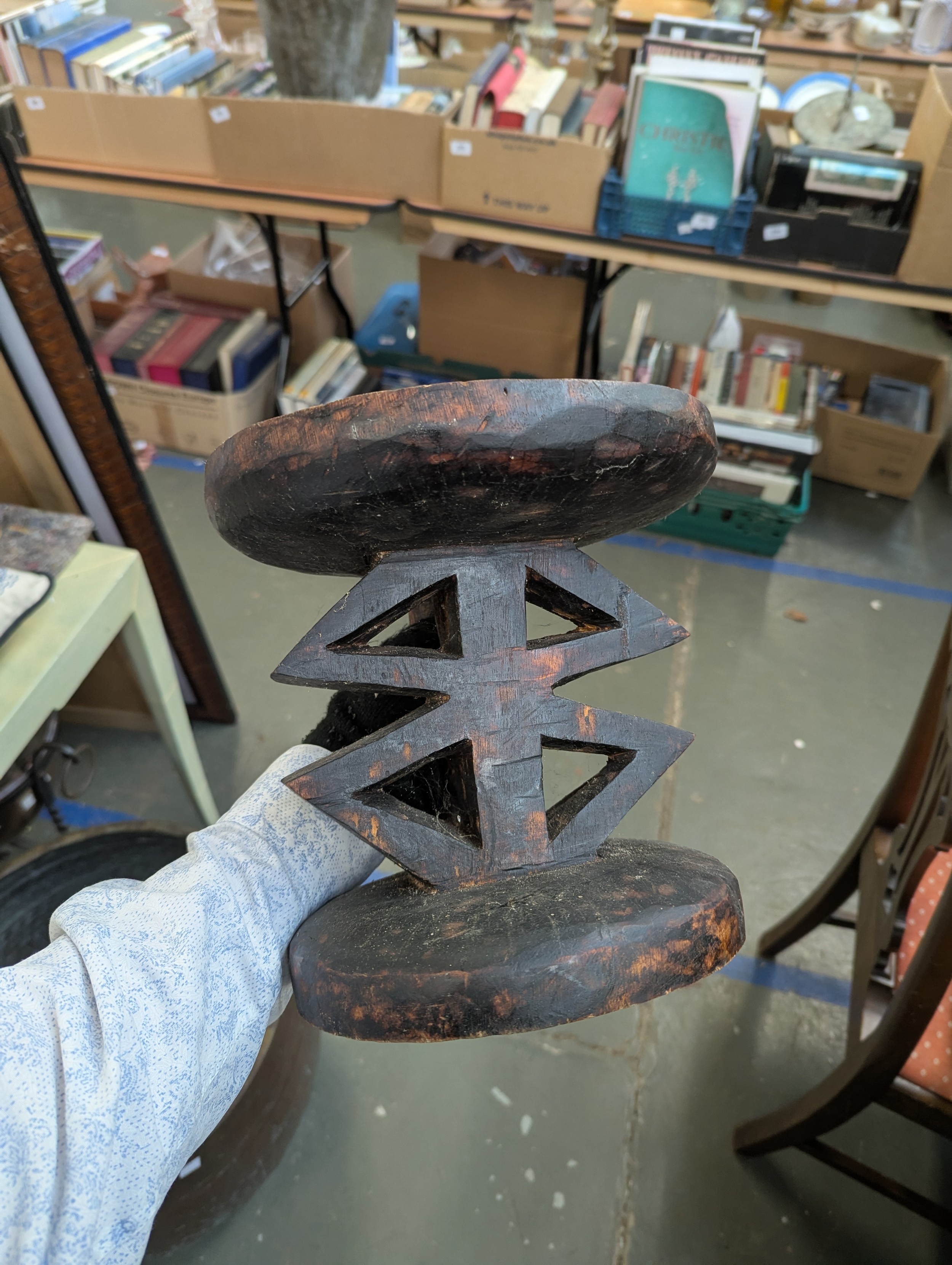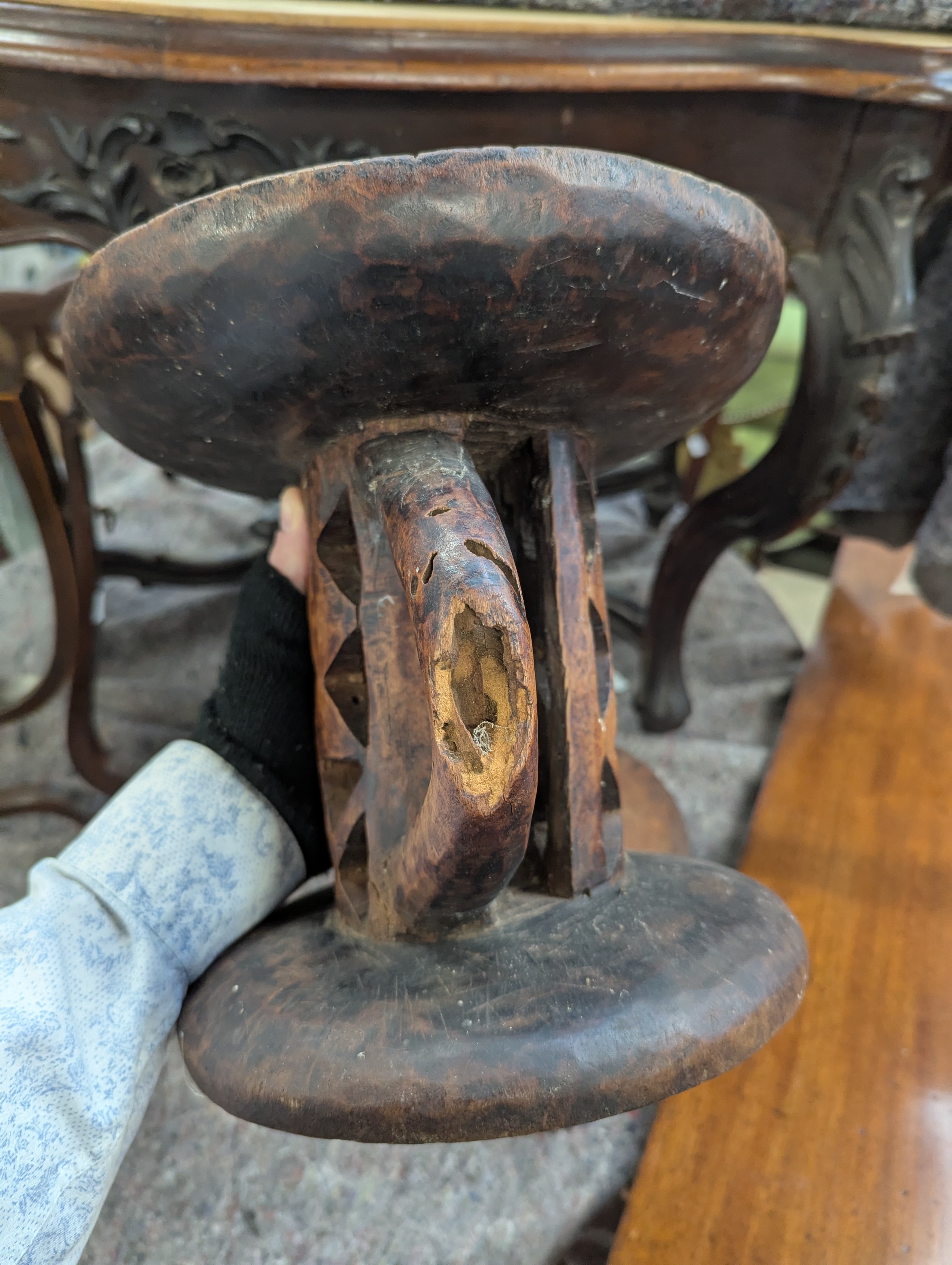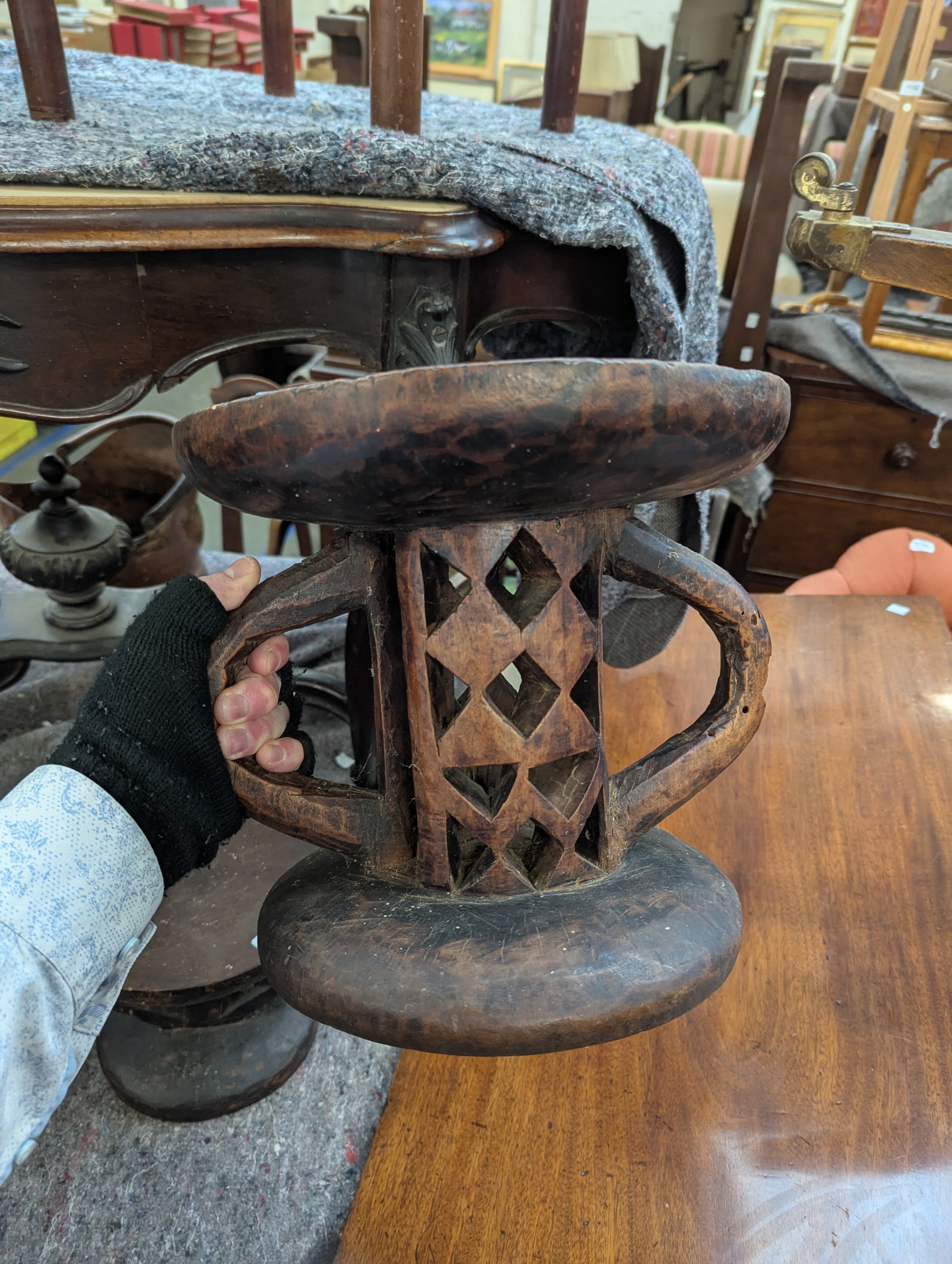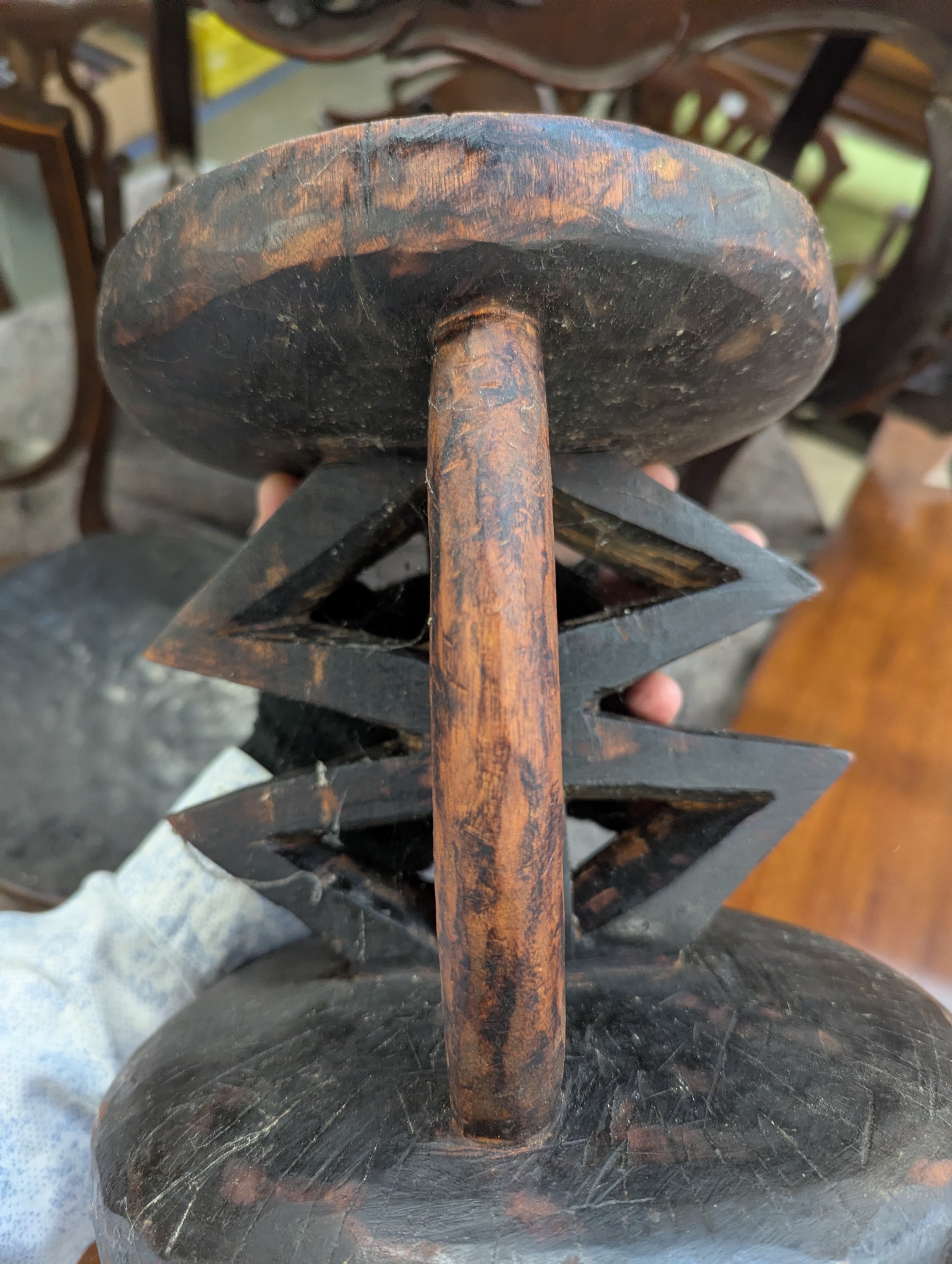 Two carved African tribal stools, possibly Tonga tribe, 23cmH and 26.5cmH