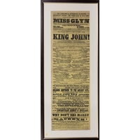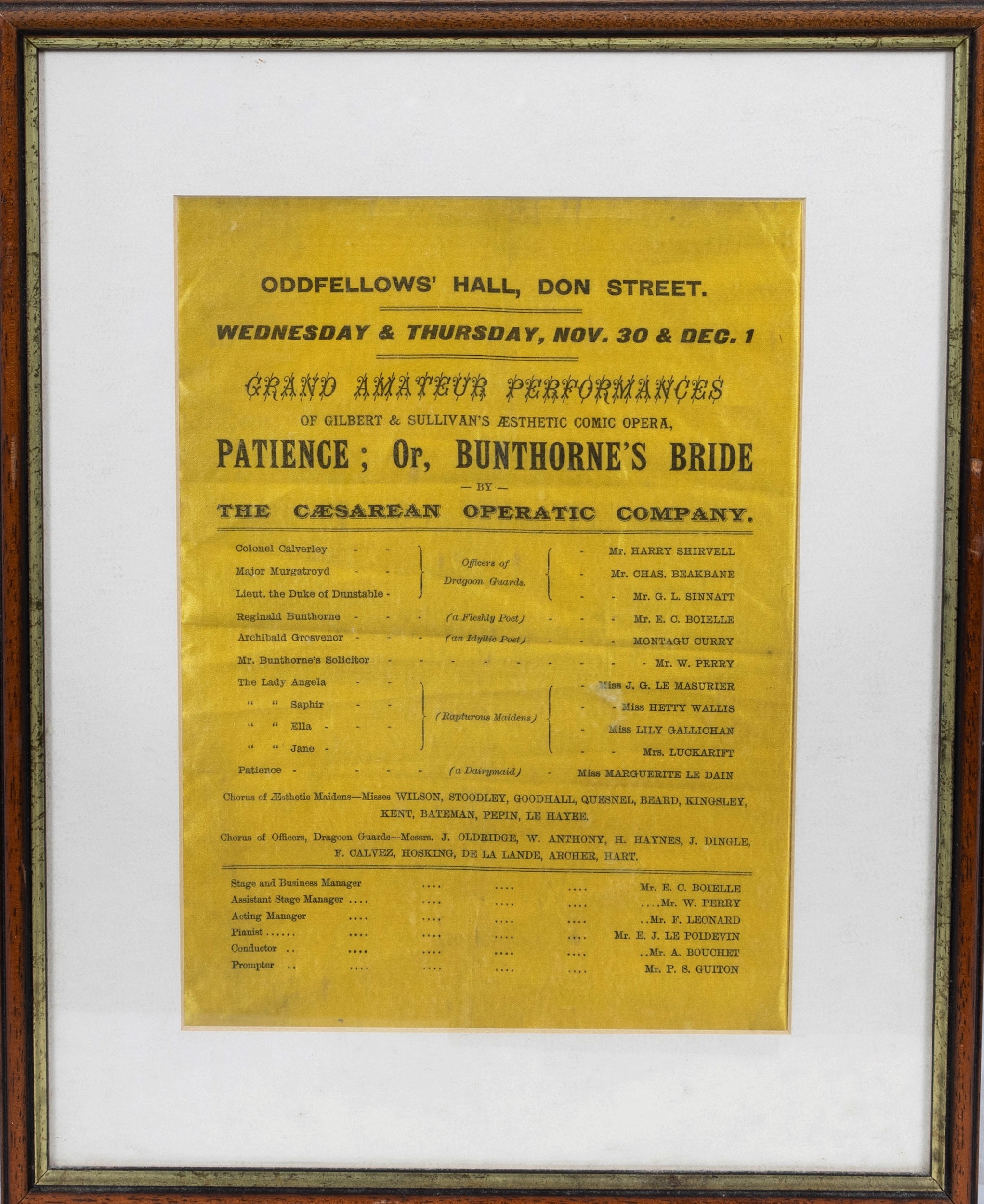 Channel Islands theatre interest - a framed promotional programme early 20th century, printed on yellow silk for Oddfellows Hall, Don Street, Jersey, 30th November and 1st December, Performance of Gilbert and Sullivans Patience or Bunthorns Bride, 10½ x 7½in. (26.7 x 19cm.). *Light folds.