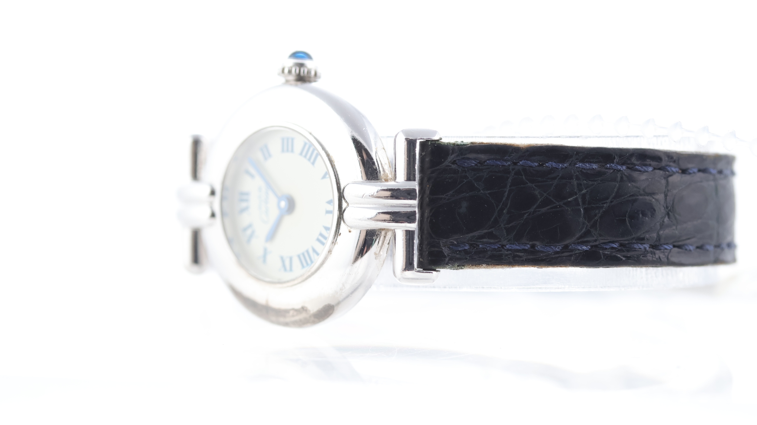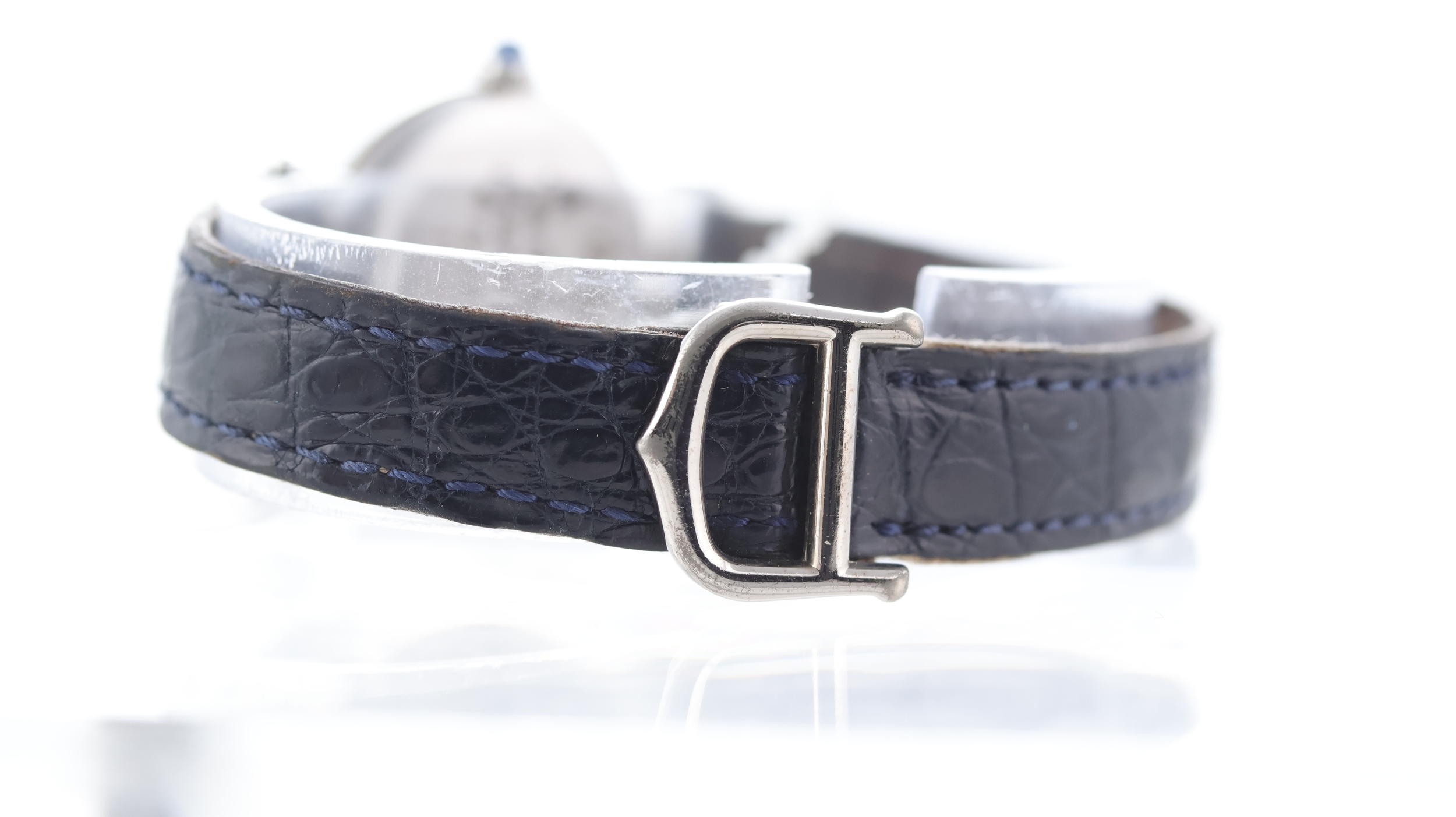 Strap features: Dark blue Cartier strap and stainless steel clasp.