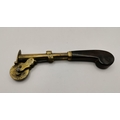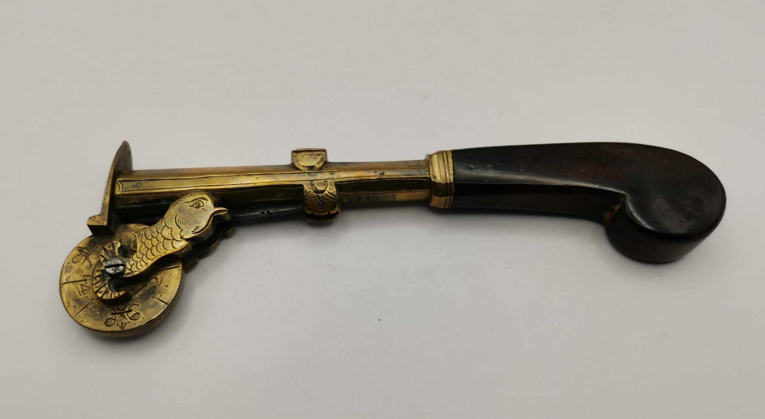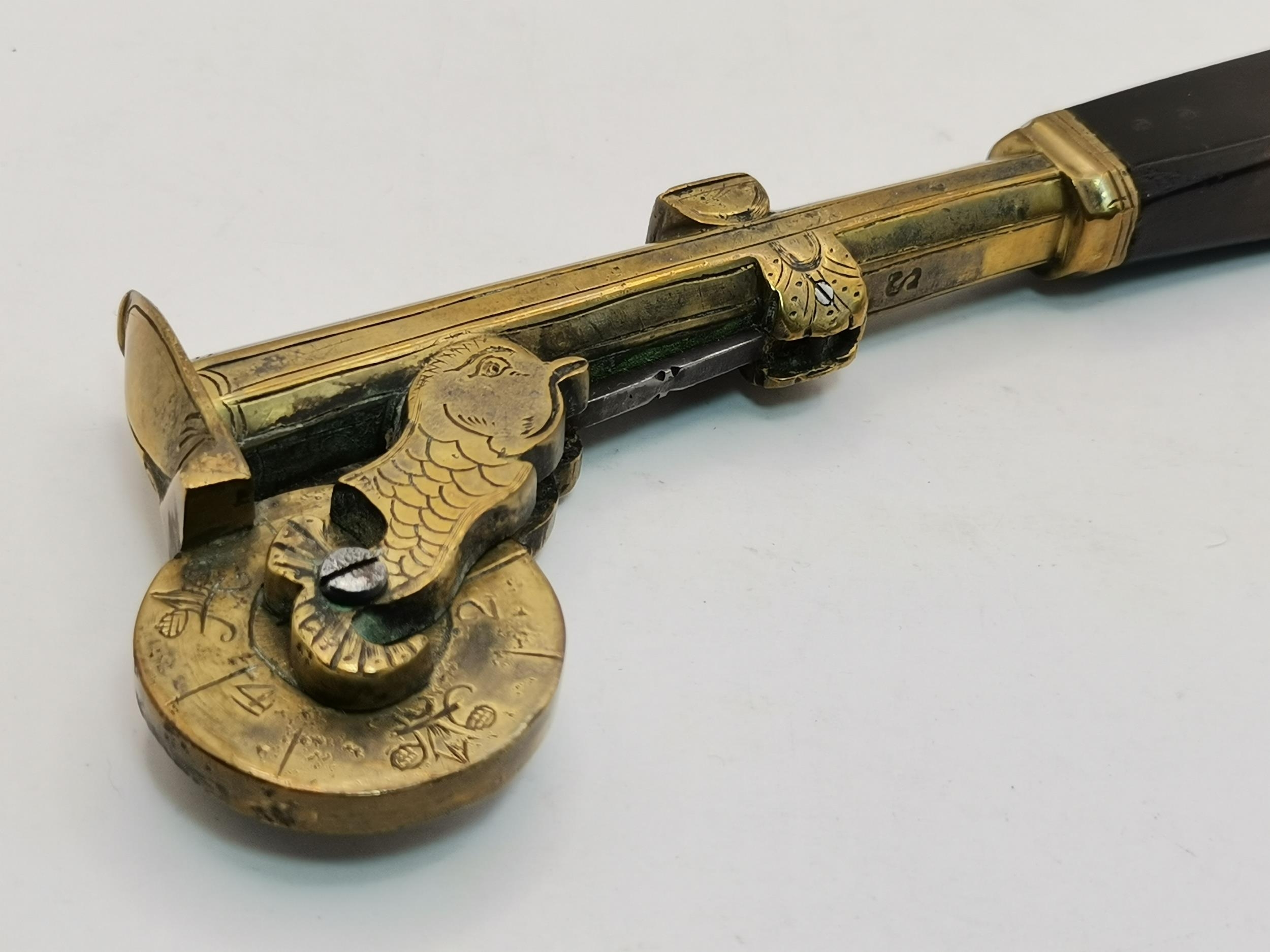 A late 18th/early 19th Century eprouvette or gunpowder tester, the flared octagonal brass barrel stamped S beneath, the numbered dial gauge supported by stylised dolphin lugs, with arched muzzle cover. 19.5cm long overall