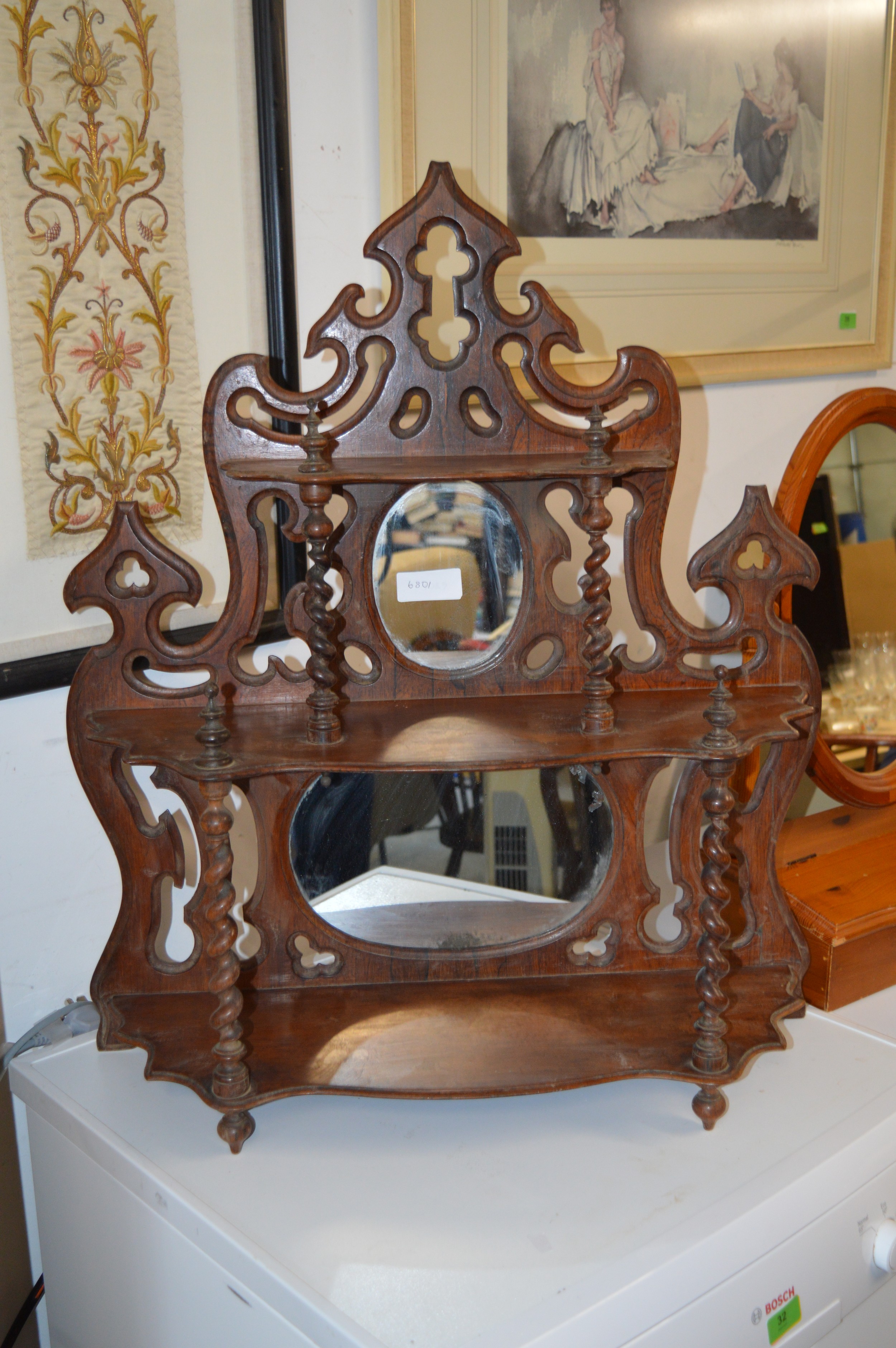 Antique Ornate Two-Tier Table-Top What-Not with Spiral Supports and Pierced Facings (Possibly Ecclesiastical Origins) approx. 36" x 36"