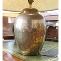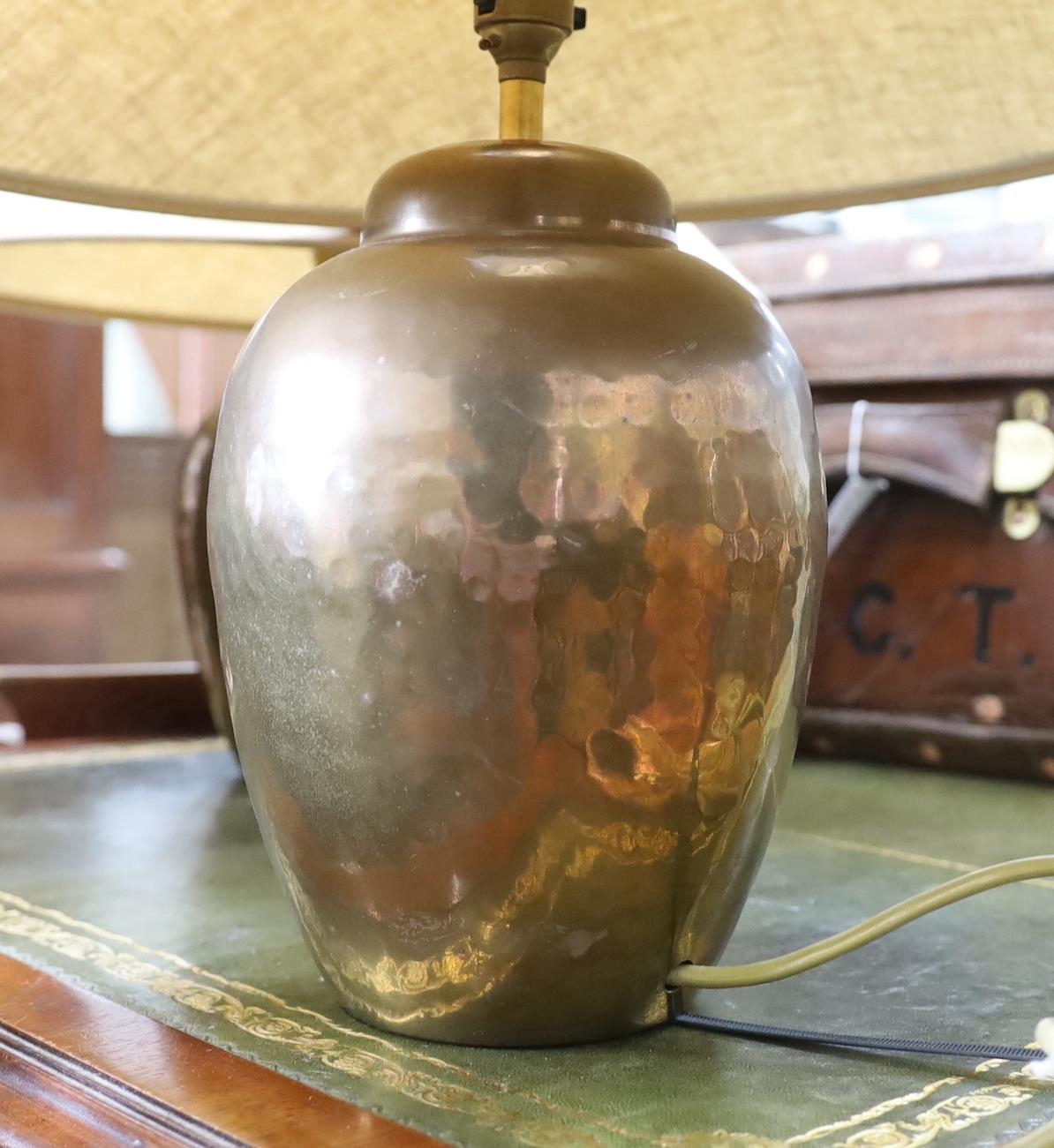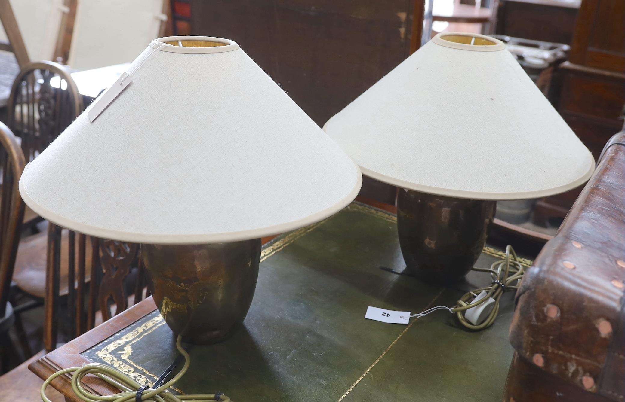 A pair of contemporary copper table lamps, with shades, height including shades 40cm
