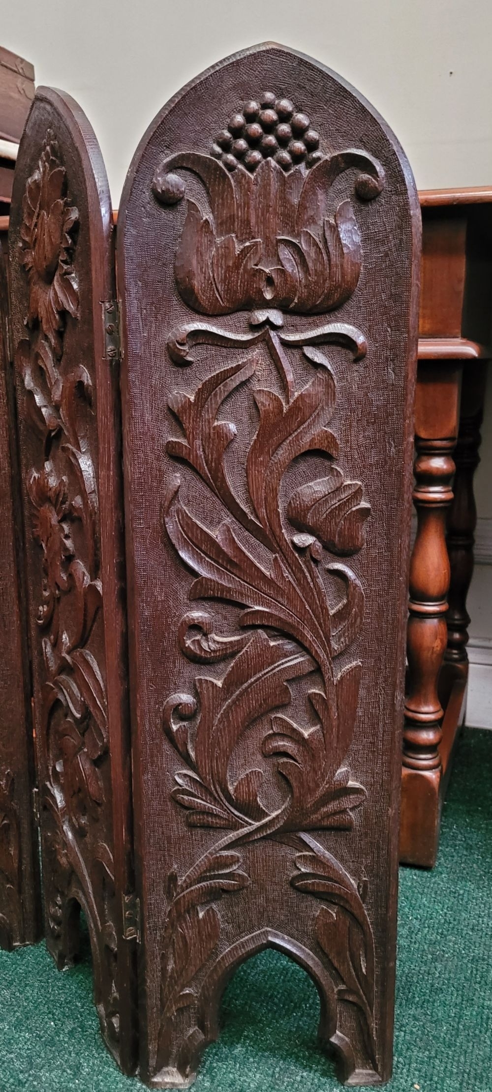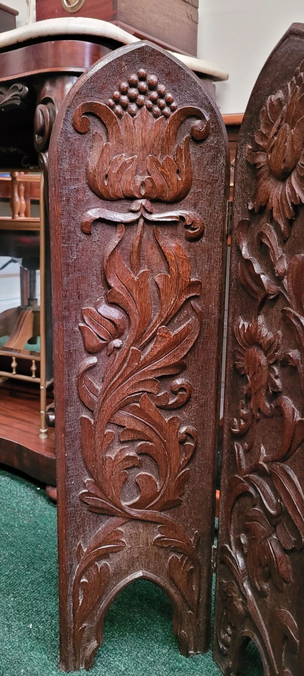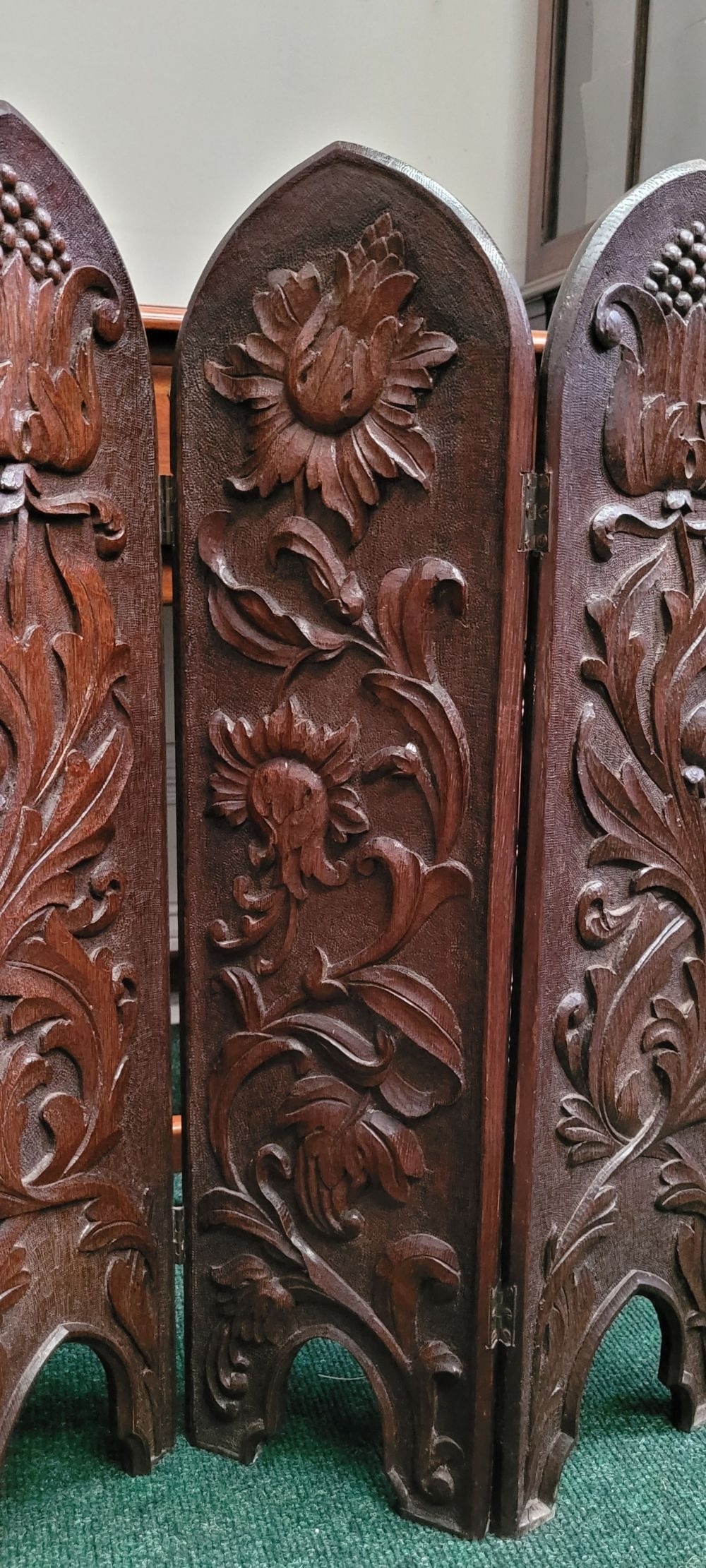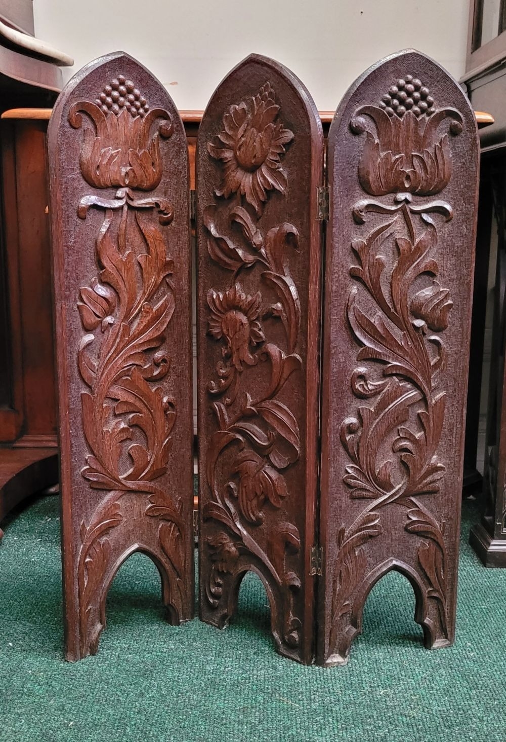 A BEAUTIFUL HAND CARVED FOLDING WOODEN SCREEN, the front of each of the three panels decorated with a large flower blossom and leafy stem, each panel with an arched top and hinges to the side so that it can be folded away. Dimensions fully extended: 77cm tall x 53cm wide.