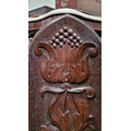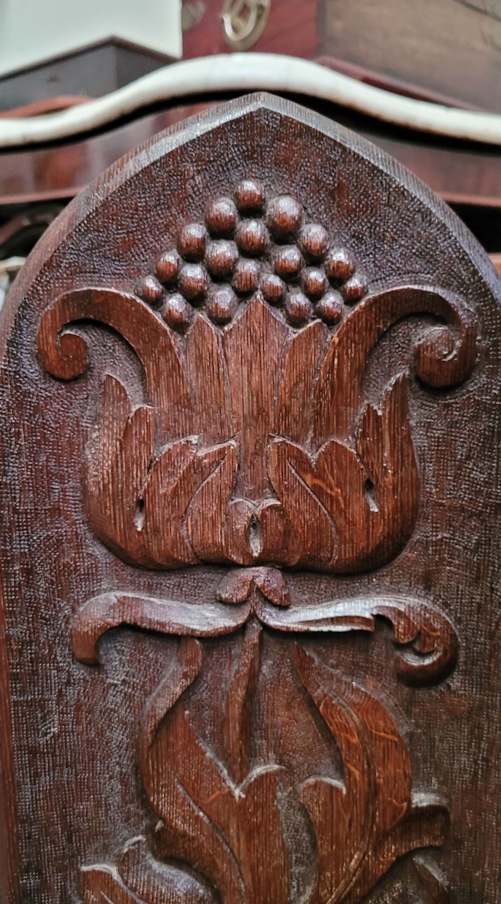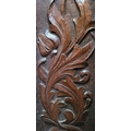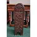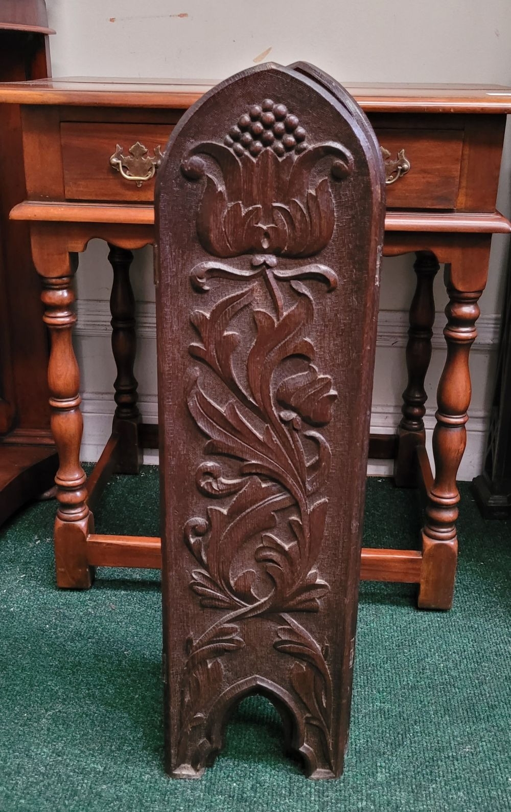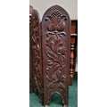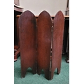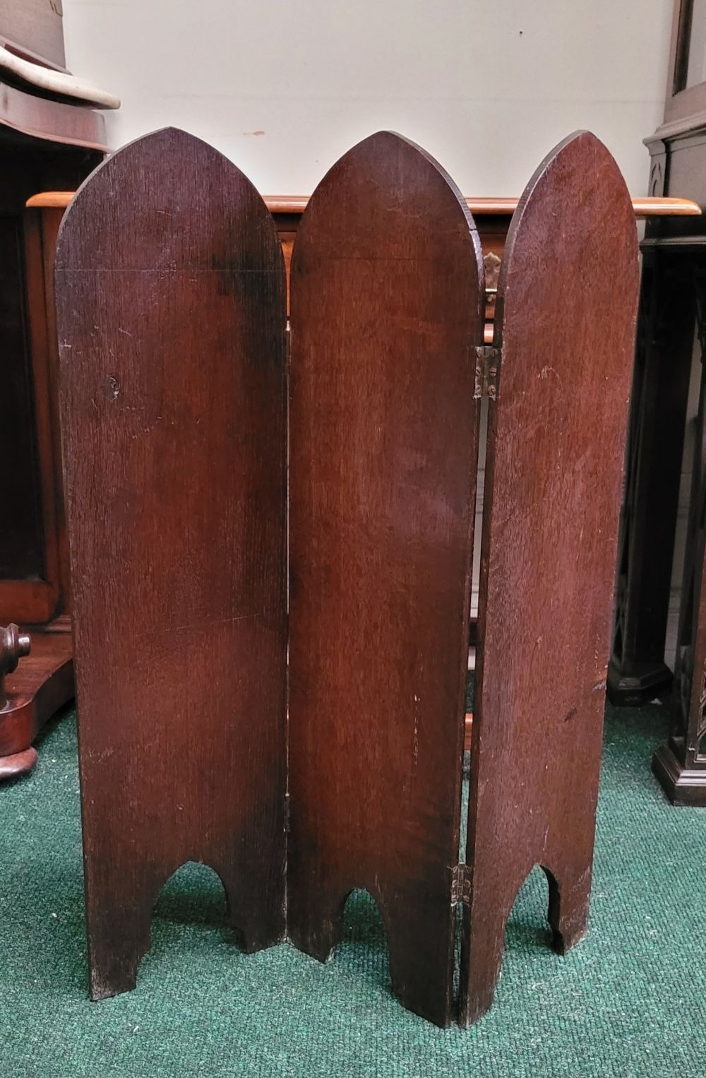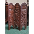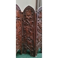 A BEAUTIFUL HAND CARVED FOLDING WOODEN SCREEN, the front of each of the three panels decorated with a large flower blossom and leafy stem, each panel with an arched top and hinges to the side so that it can be folded away. Dimensions fully extended: 77cm tall x 53cm wide.