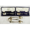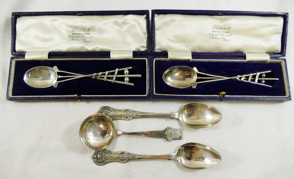 A collection of five Scottish silver spoons, comprised of a pair of Victorian queens pattern teaspoons, Glasgow 1851, maker's mark 'JD', two St. Mungo Golf Club presentation spoons, Glasgow 1924 by Robert Scott, 13cm long, each with fitted case, and a modern Glasgow University souvenir caddy spoon, Edinburgh 1983, 11cm long, in original packaging, combined weight 2.9ozt, 90.2g