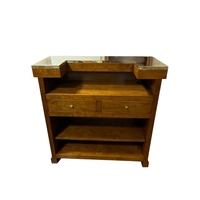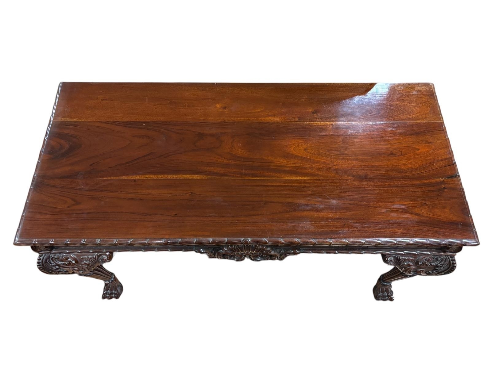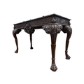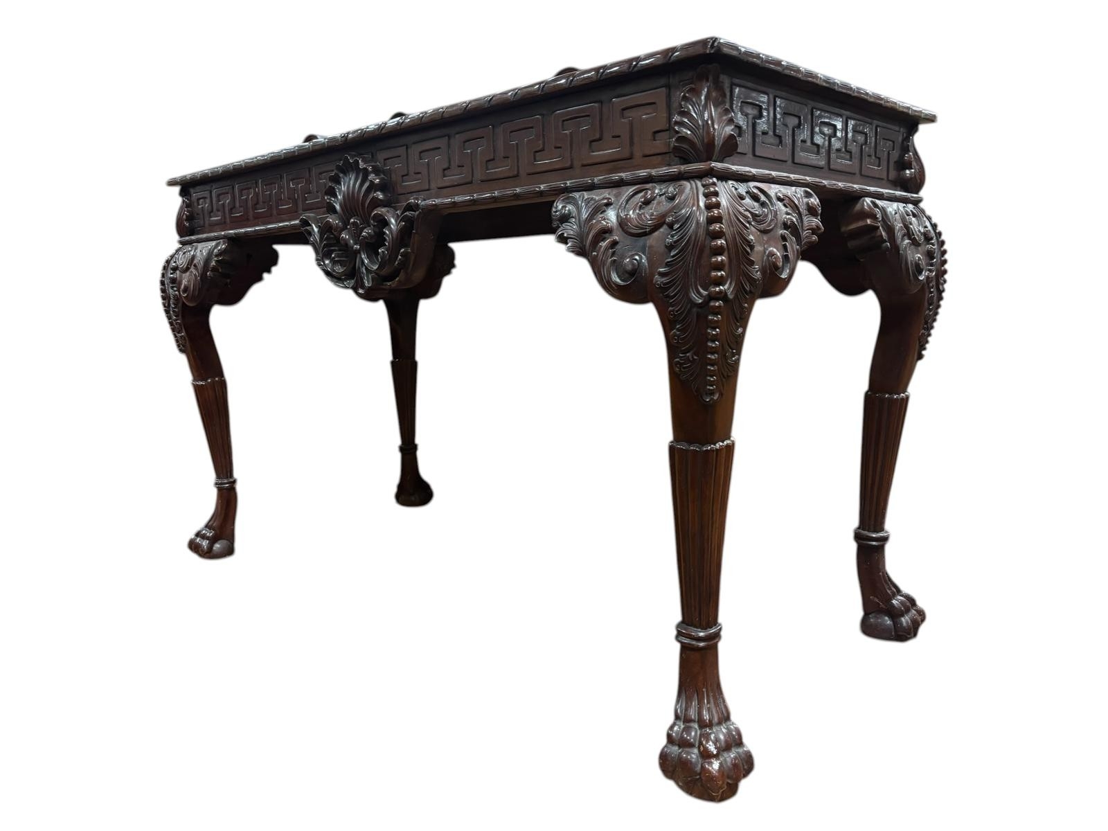 A CHIPPENDALE STYLE MAHOGANY CONSOLE TABLE of rectangular outline the shaped top with glazed panel above a Greek key frieze centred by a pierced foliate and shell carving on lobed and turned legs with claw feet 81cm (h) x 137cm (w) x 63cm (d)
