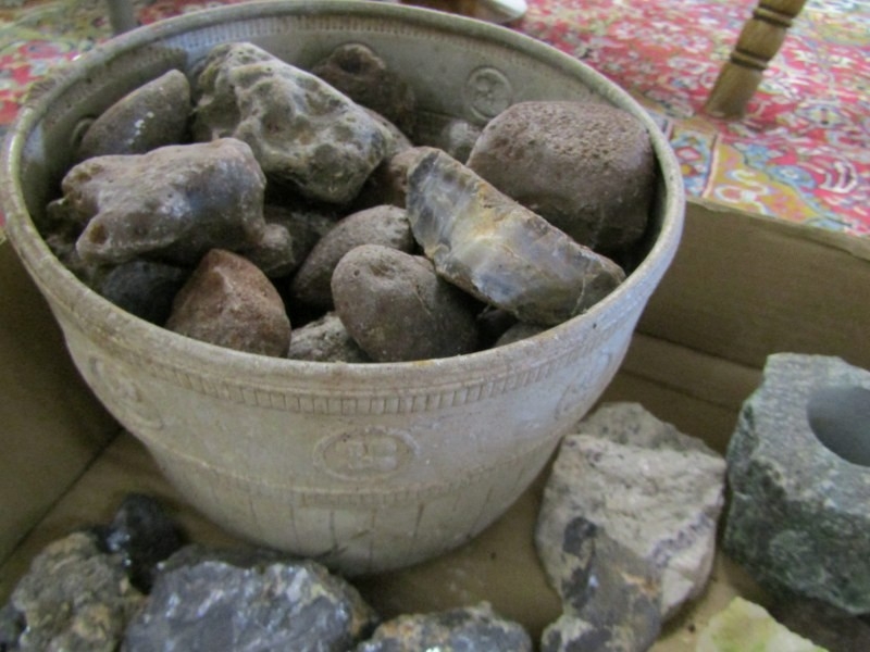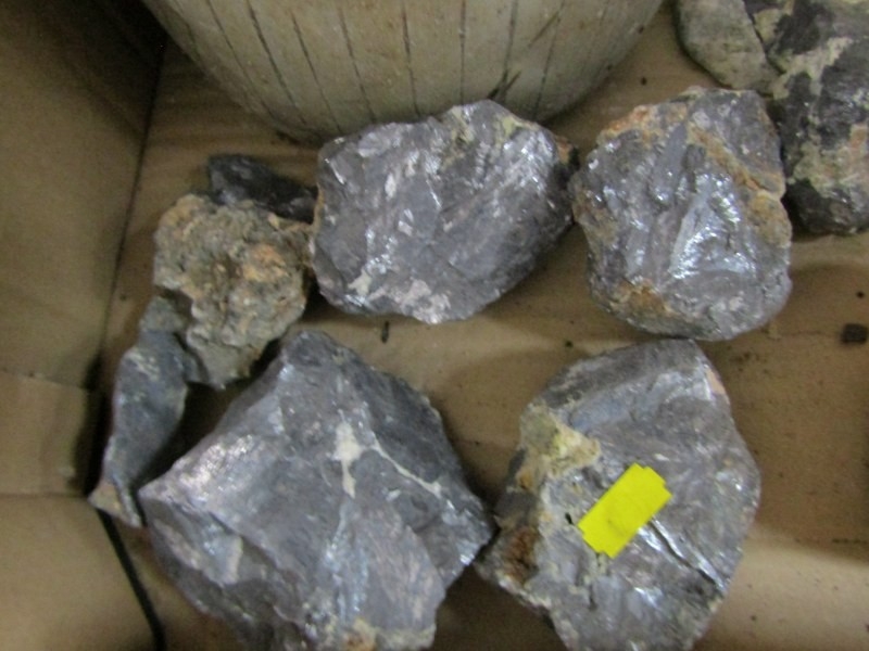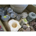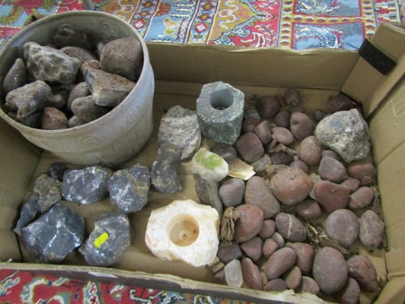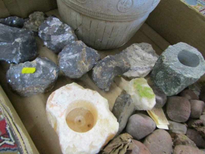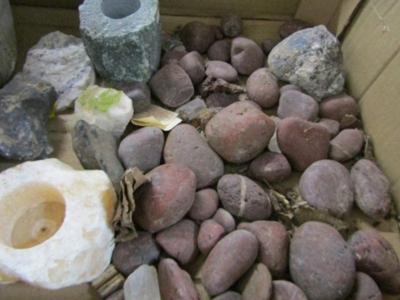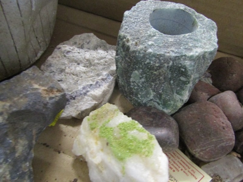 STONES/MINERALS, box of uncut stones and minerals to include pyromorphite, etc