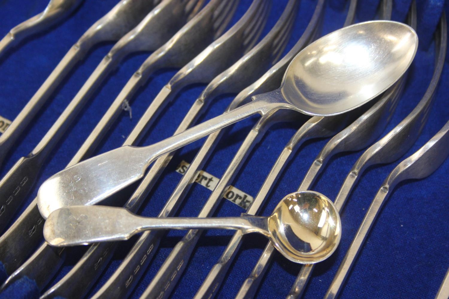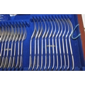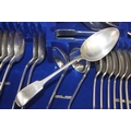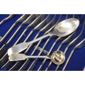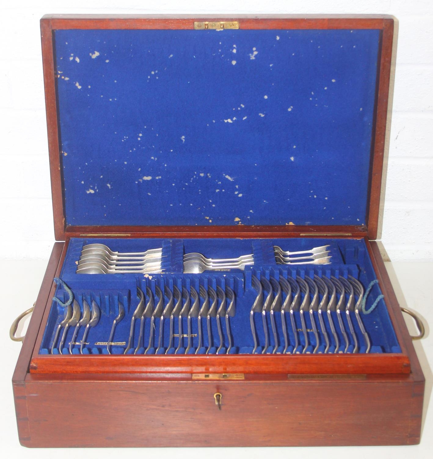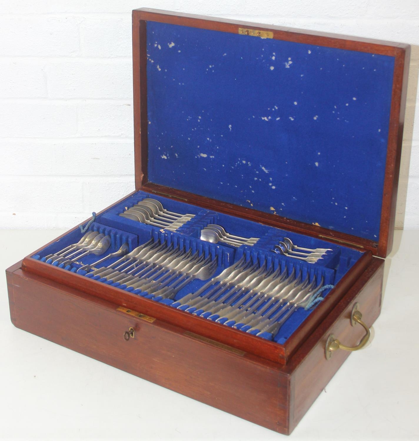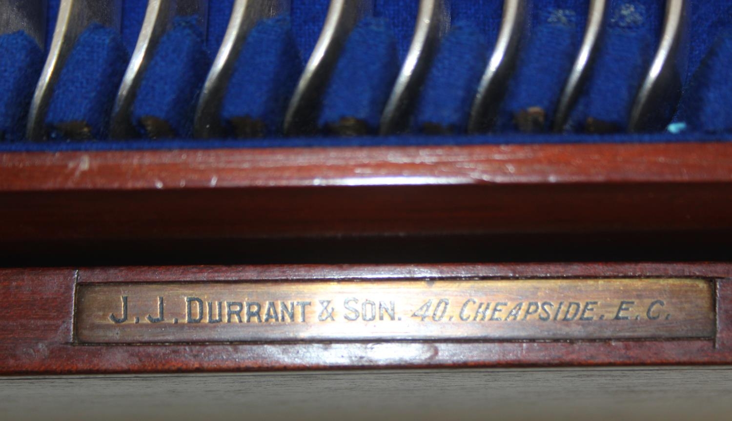 An antique silver plated cutlery set, the majority of a 12 person setting, with a few pieces missing and some replacements, the majority of the set made by the Atkin Brothers and retailed by Durrant of London