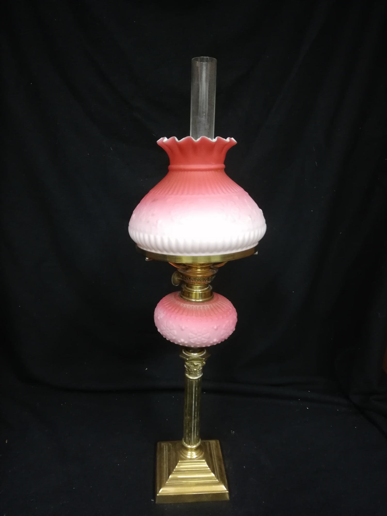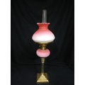 Oil lamp w/ brass column, cranberry glass font w/ a/f cranberry glass shade total 29" high