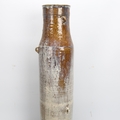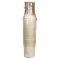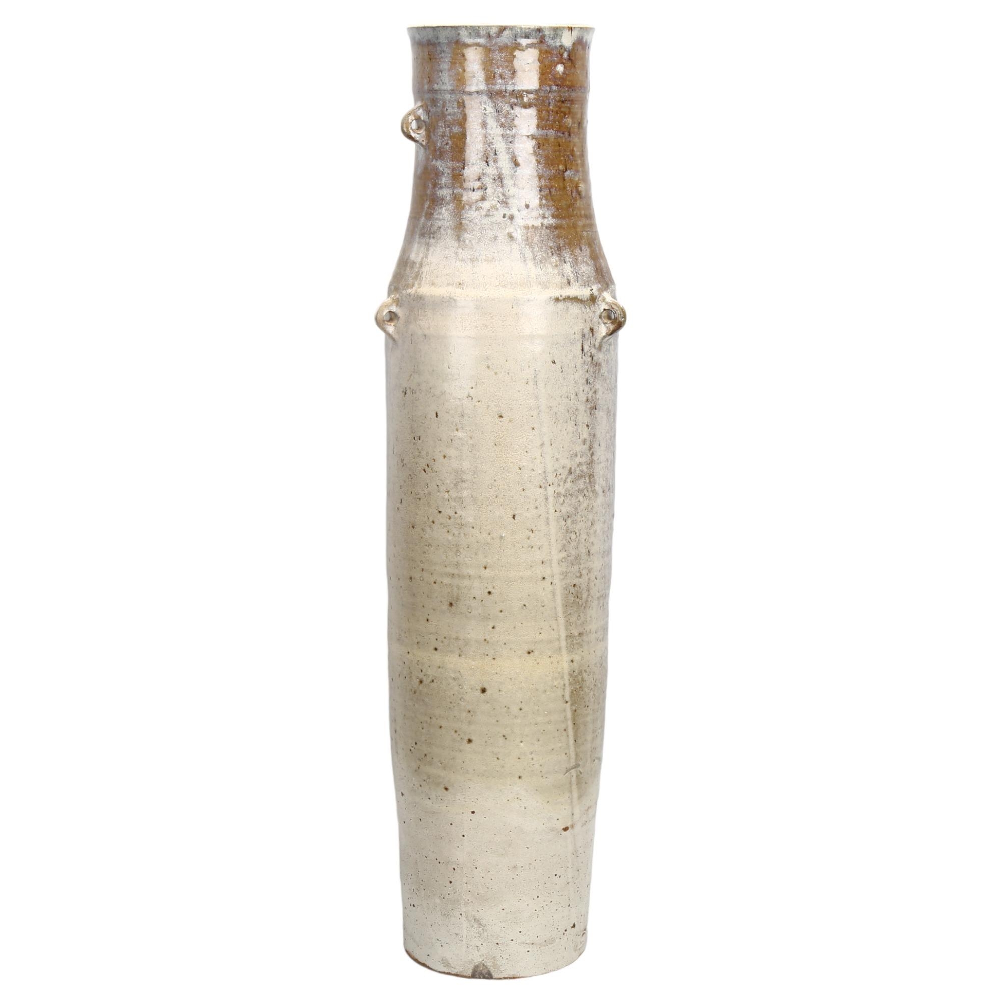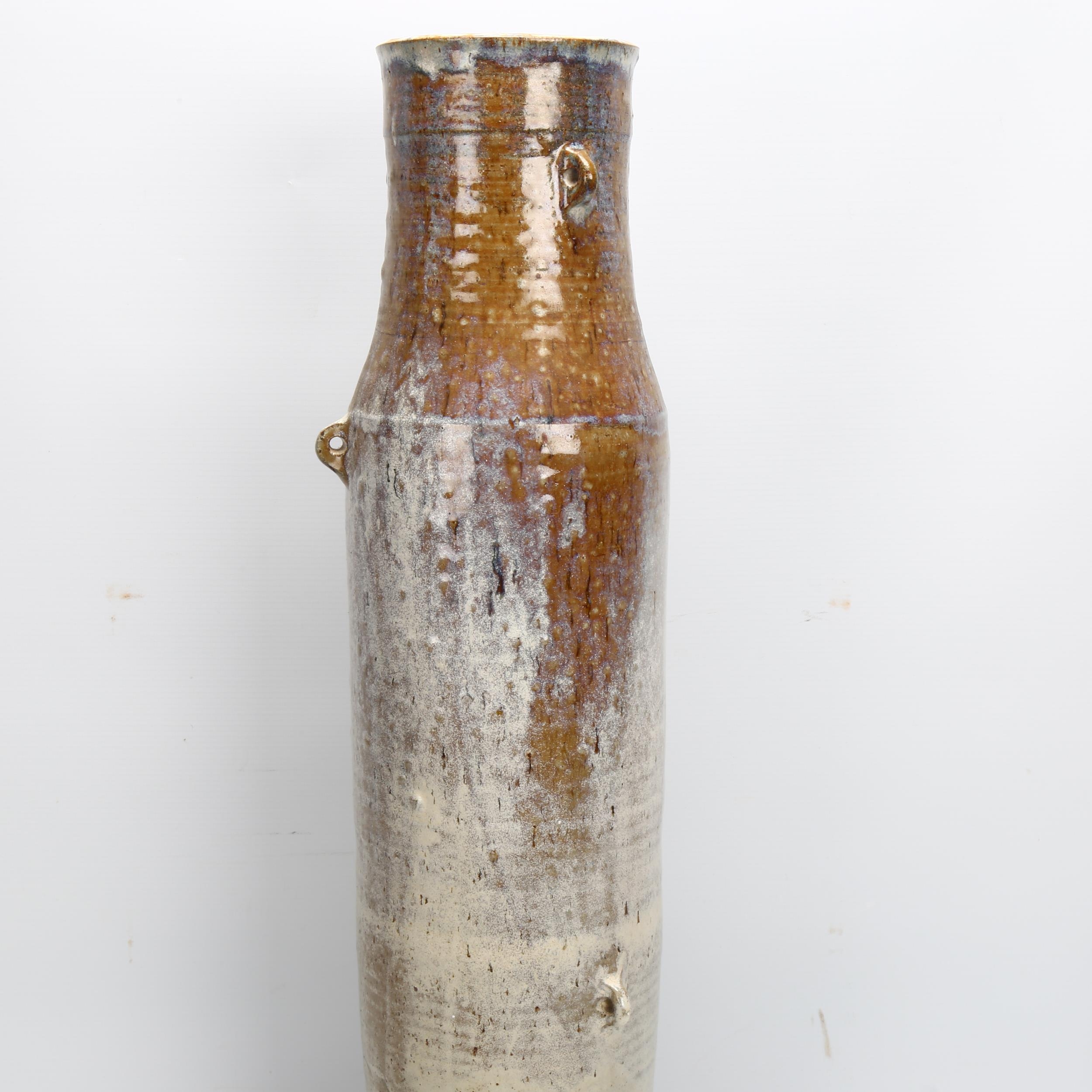 A tall studio pottery vessel with Jun/ash glazes and lugs, marked with fish and JD to base, height 61cm