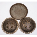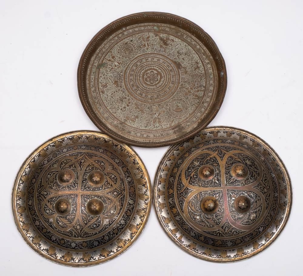 Two Indo-Persian steel dhals: of circular outline with inlaid niello enamel decoration and four circular bosses, each 28cm diameter, together with a brass dish. (3).