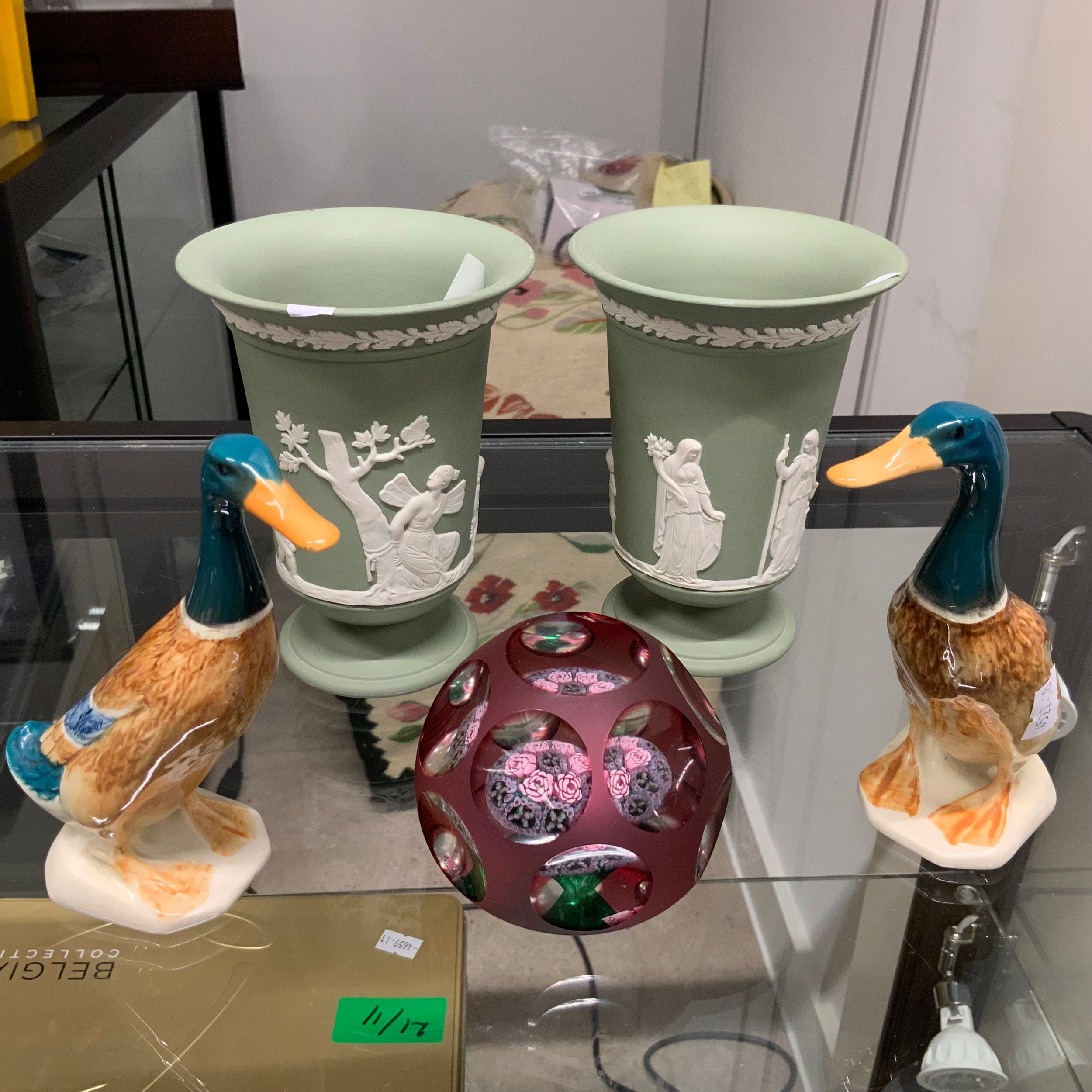 A pair of Beswick ducks, model 756-2, along with a millefiori paperweight and a pair of Wedgwood Jasper ware vases.