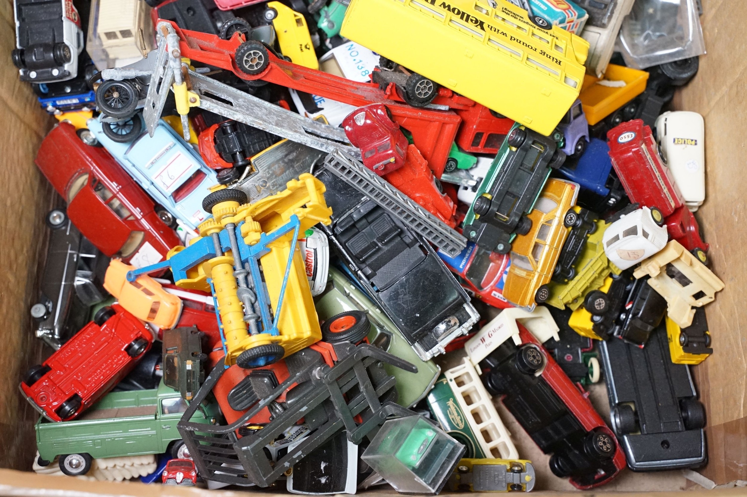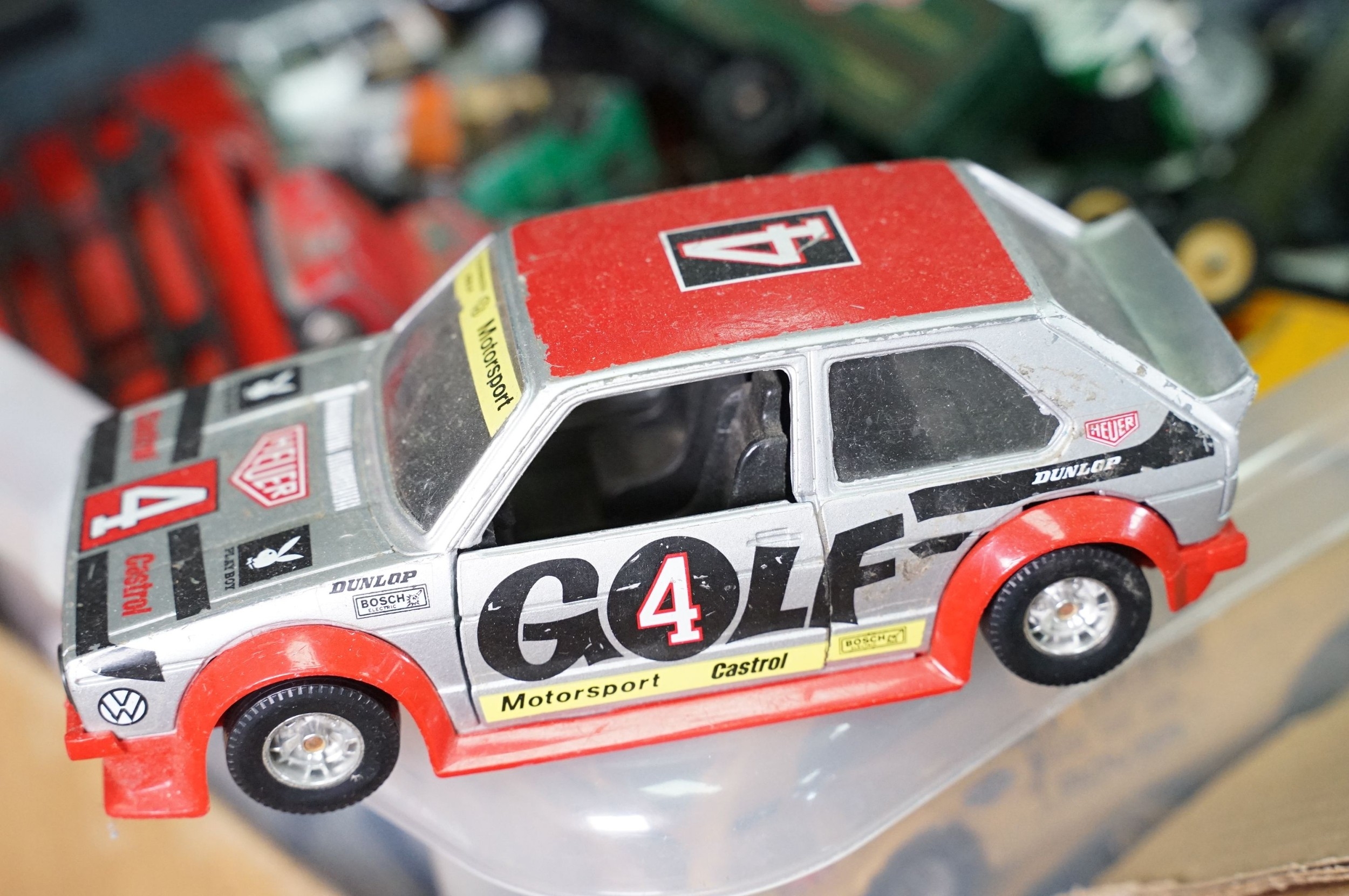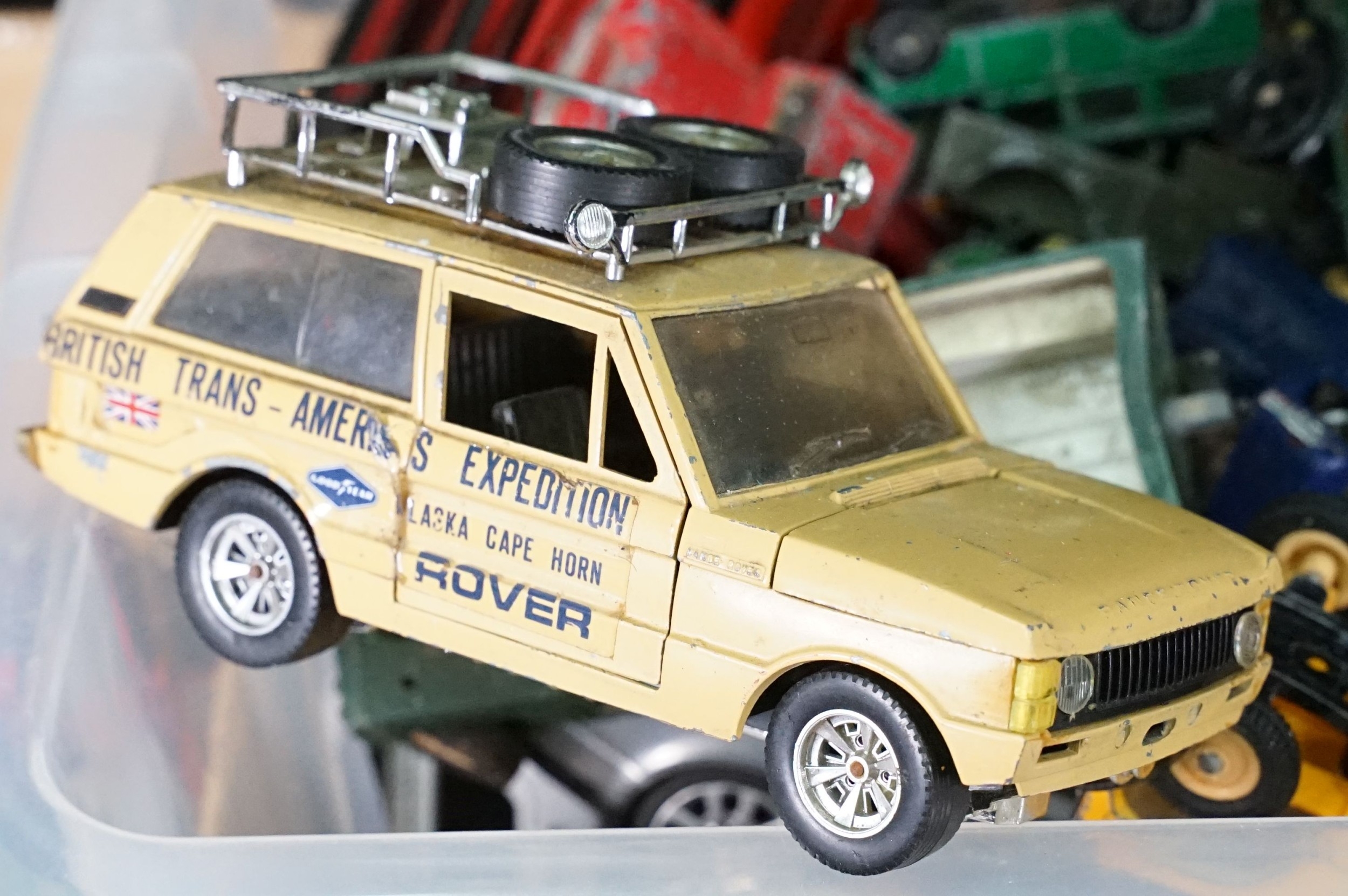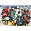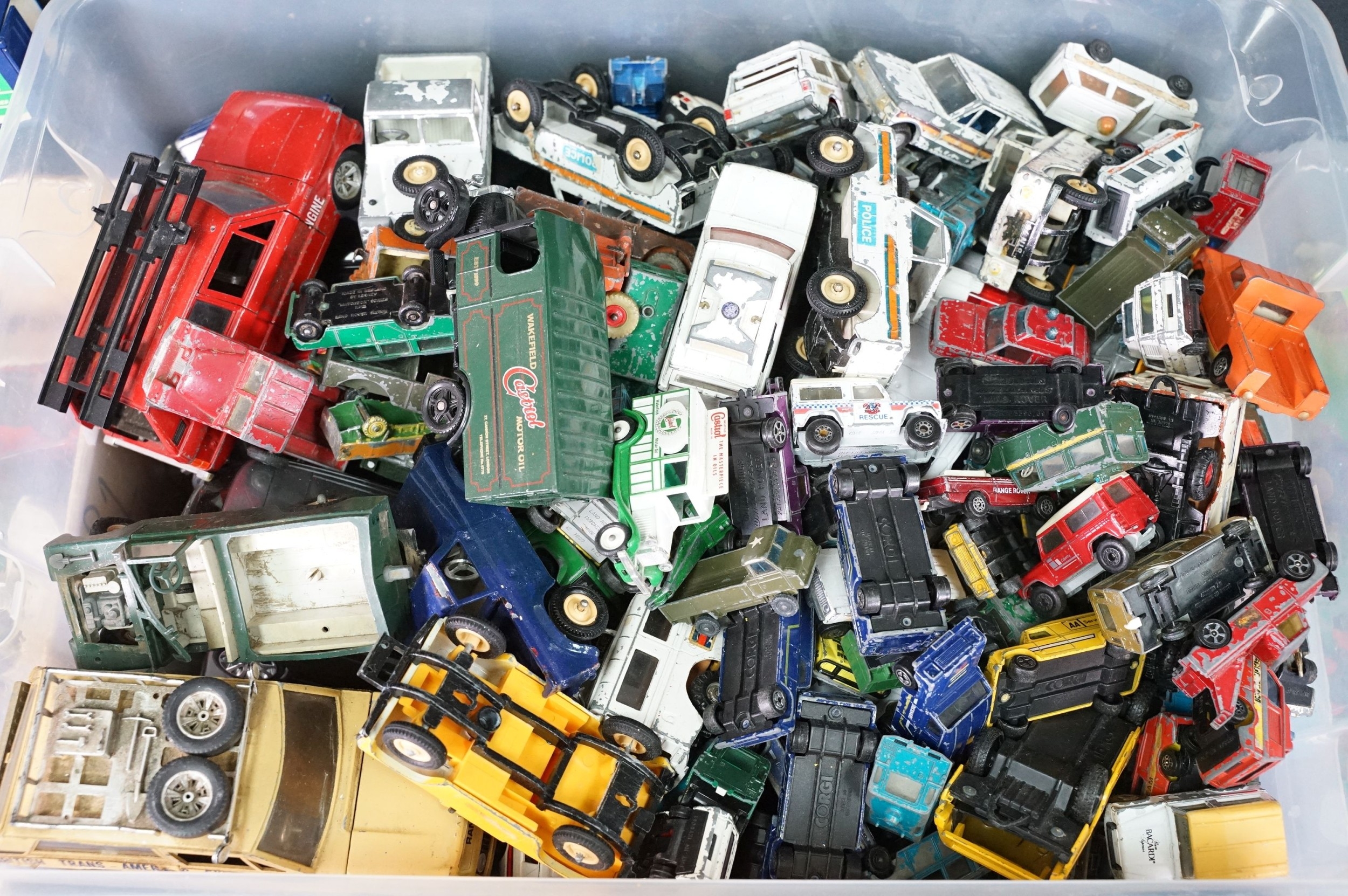 Large quantity of play worn diecast & plastic models circa 1970s onwards to include Matchbox, Corgi, Majorette, Britains etc including Land Rover and Range Rover examples (4 boxes)