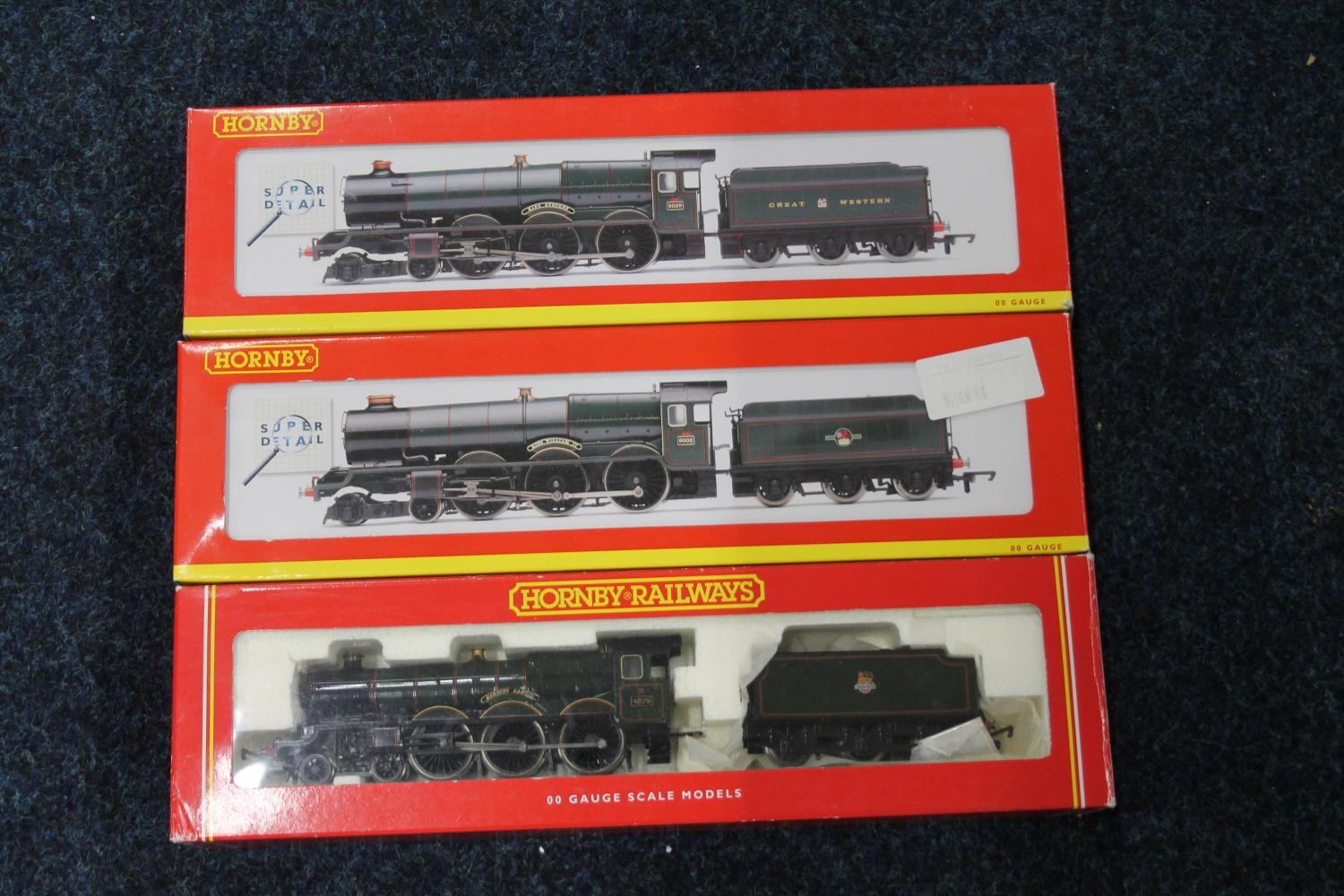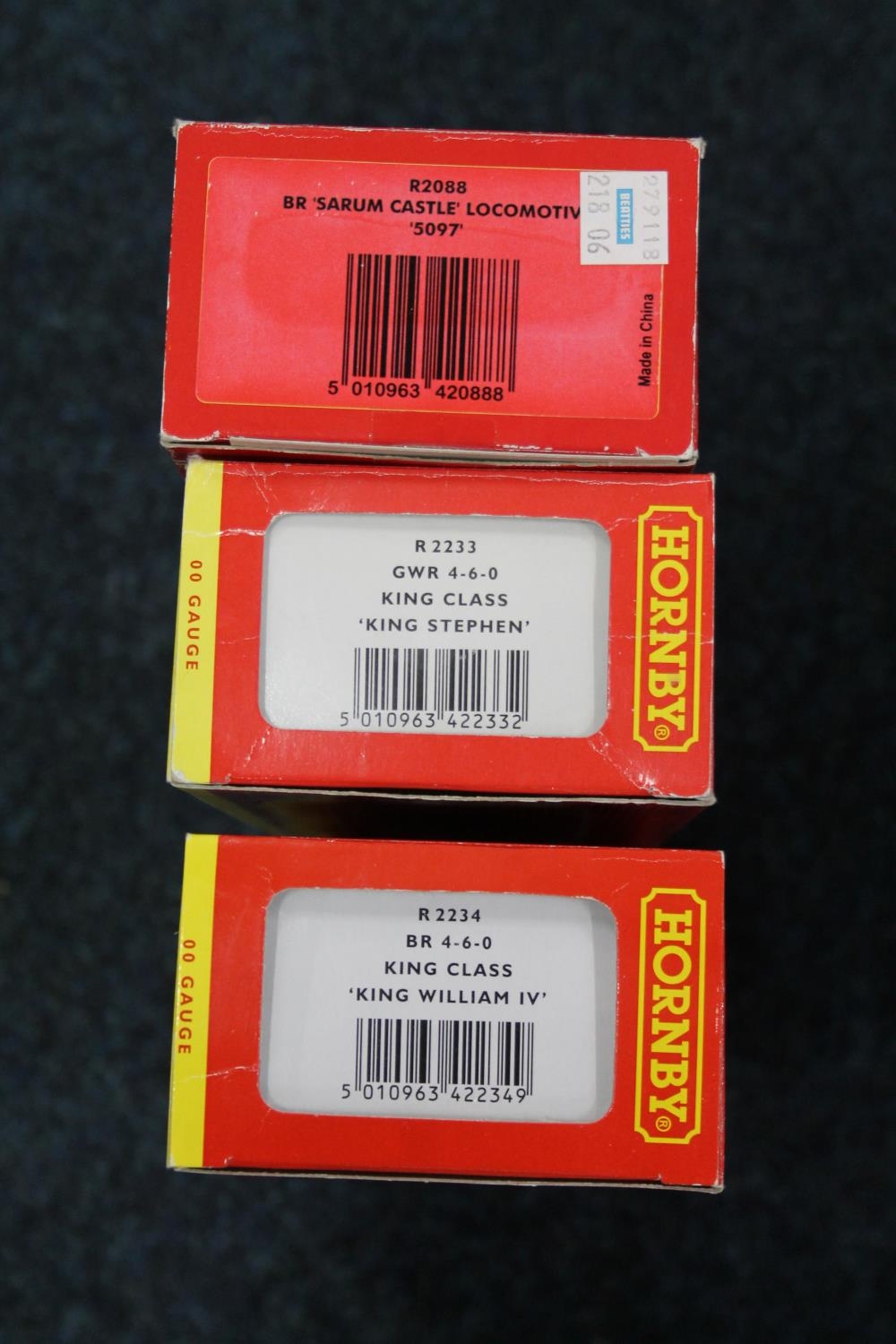 Hornby OO gauge model railways locomotives to include R2233 4-6-0 King Class King Stephen (renamed King Edward I) tender locomotive 6024 BR green, R2088 4-6-0 Sarum Castle (renamed Cardiff Castle) tender locomotive 4075 BR green and R2234 4-6-0 King Class King William IV tender locomotive 6002 GW green, each boxed. (3)
