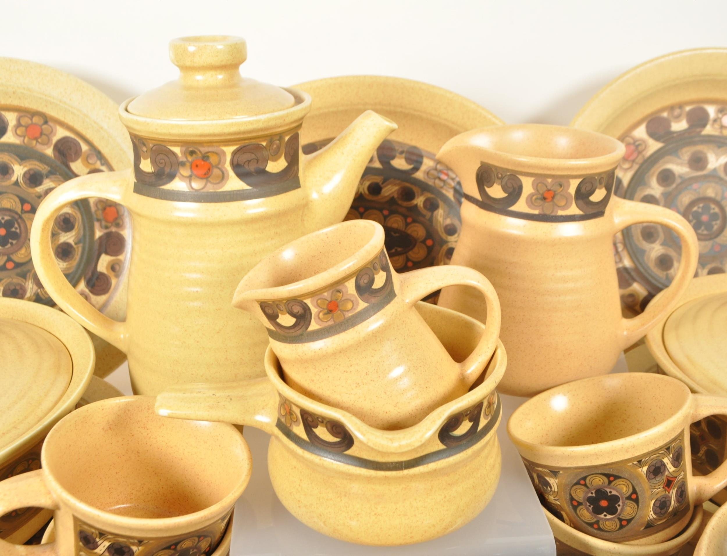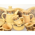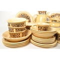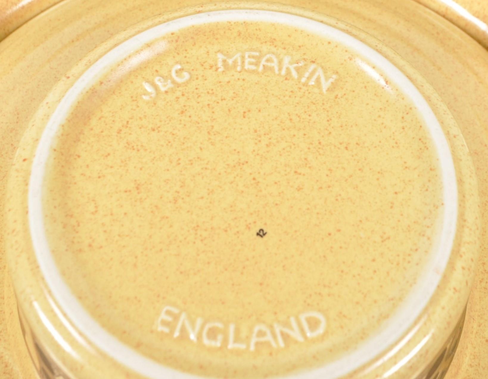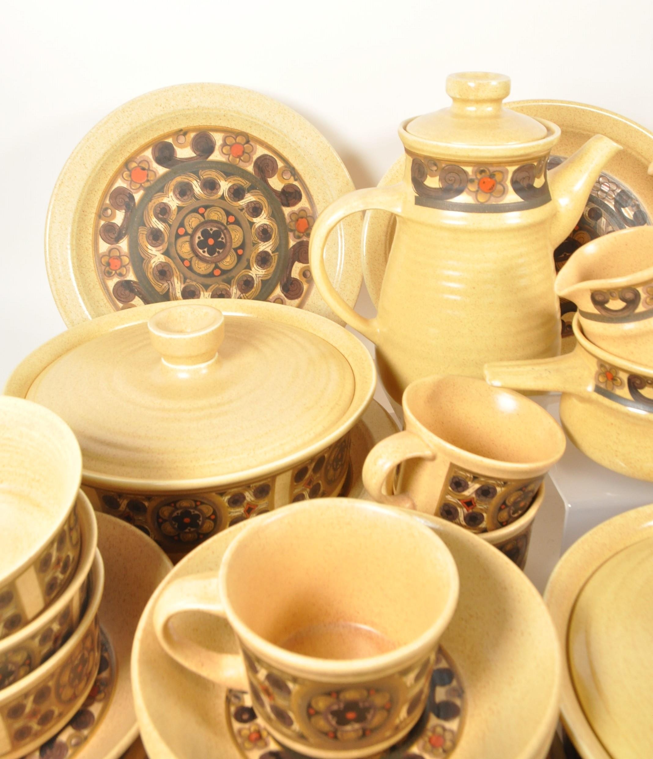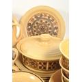 J & G Meakin - Late 20th century vintage pottery dinner service in the Aquarius pattern. Including lidded serving dishes, coffee pot, coffee cups, small plates, dinner plates, small bowls, jug, and more. The design features a beige / yellow background with a geometric floral pattern in orange and brown tones. Makers marks to the underside of each piece.
