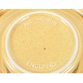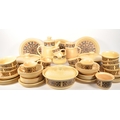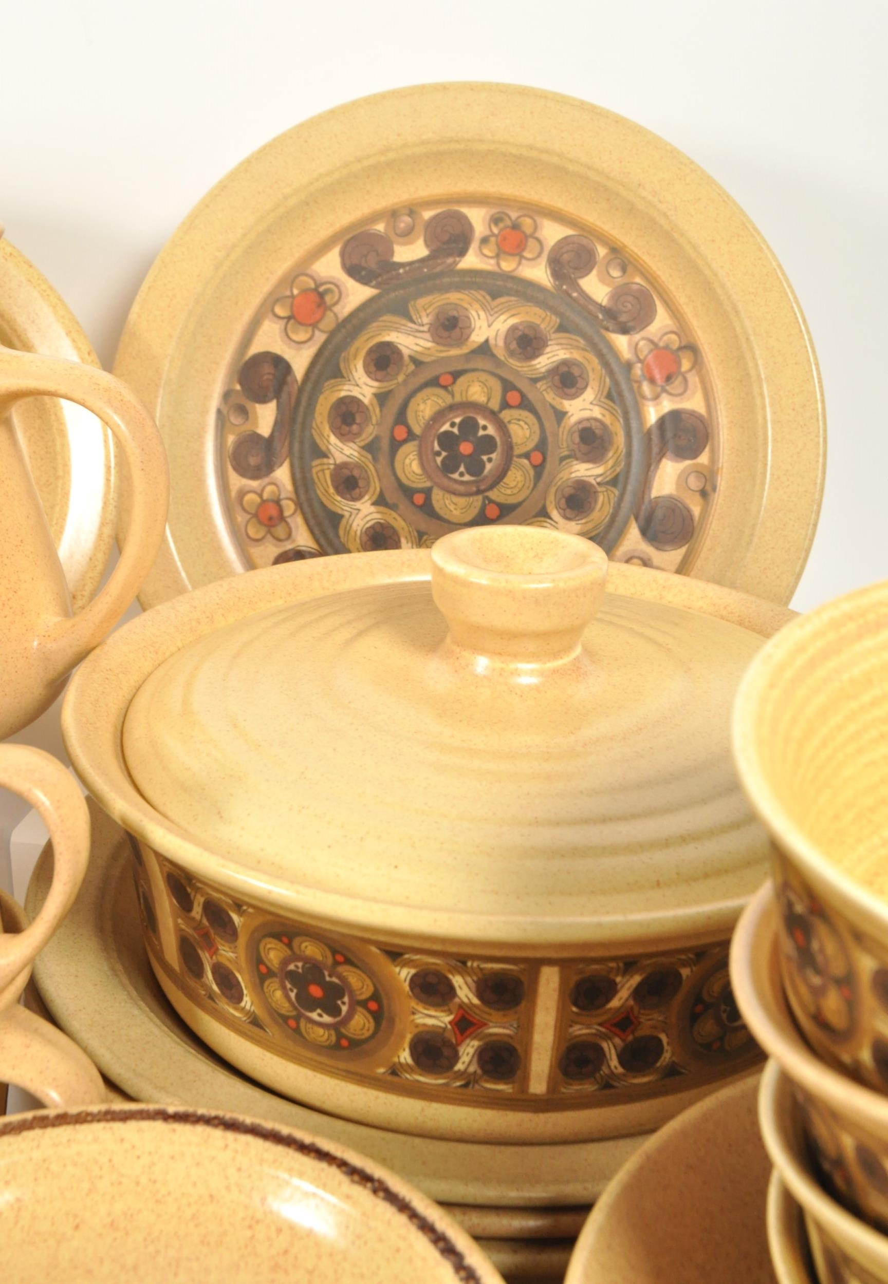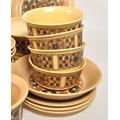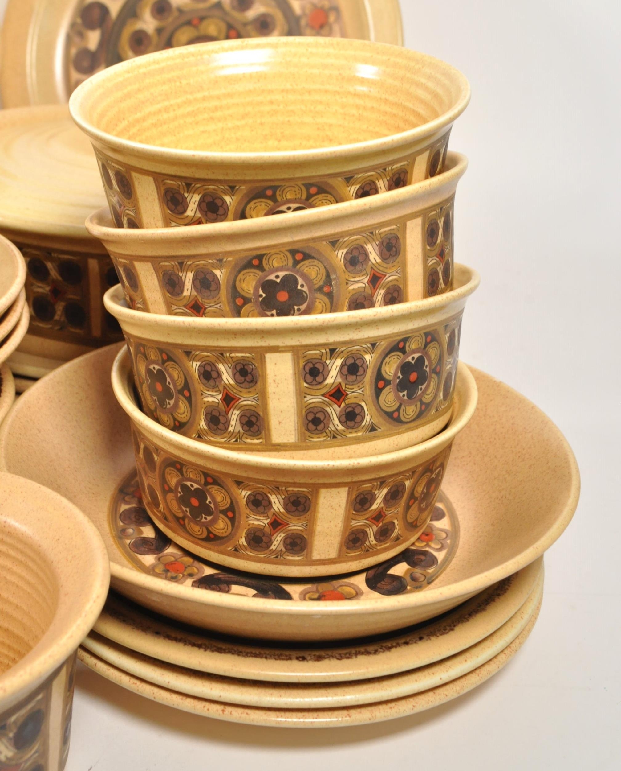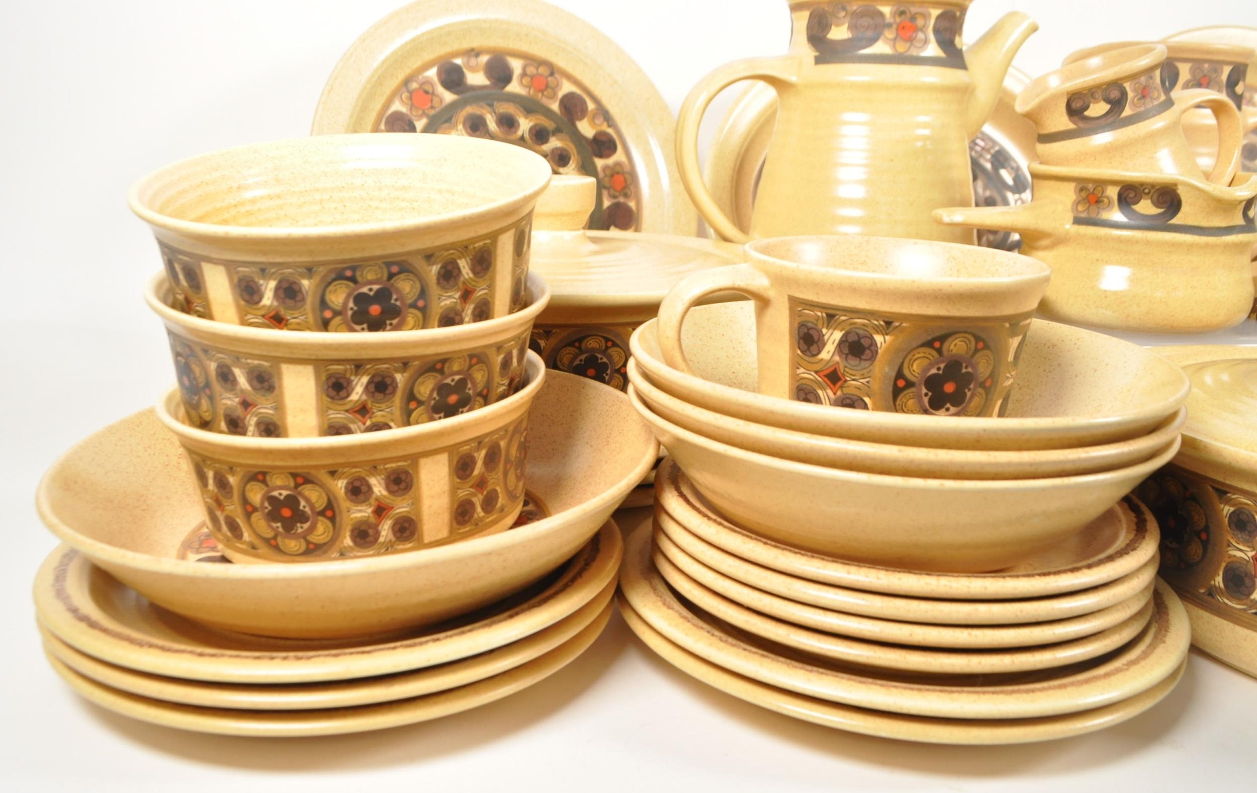 J & G Meakin - Late 20th century vintage pottery dinner service in the Aquarius pattern. Including lidded serving dishes, coffee pot, coffee cups, small plates, dinner plates, small bowls, jug, and more. The design features a beige / yellow background with a geometric floral pattern in orange and brown tones. Makers marks to the underside of each piece.