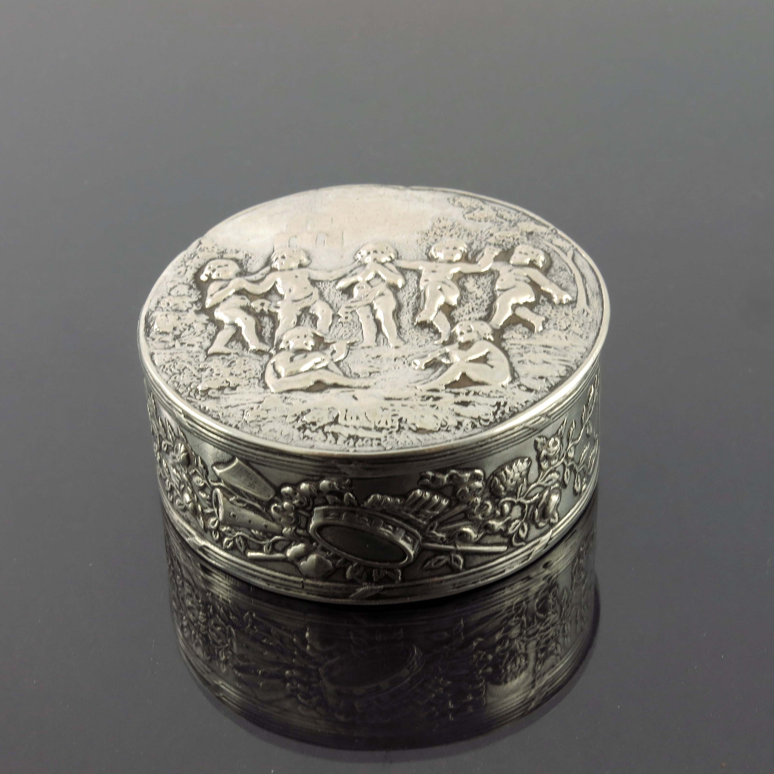 A 19th century German silver snuff box, circa 1890, circular form, embossed and chased with an allegorical Bacchanalian scene of putti to the lid, 5.8cm diameter, 1.77ozt