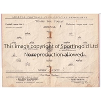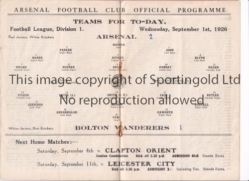 ARSENAL Programme for the home League match v Bolton Wanderers 1/9/1926, staples rusted away and scores entered. Generally good