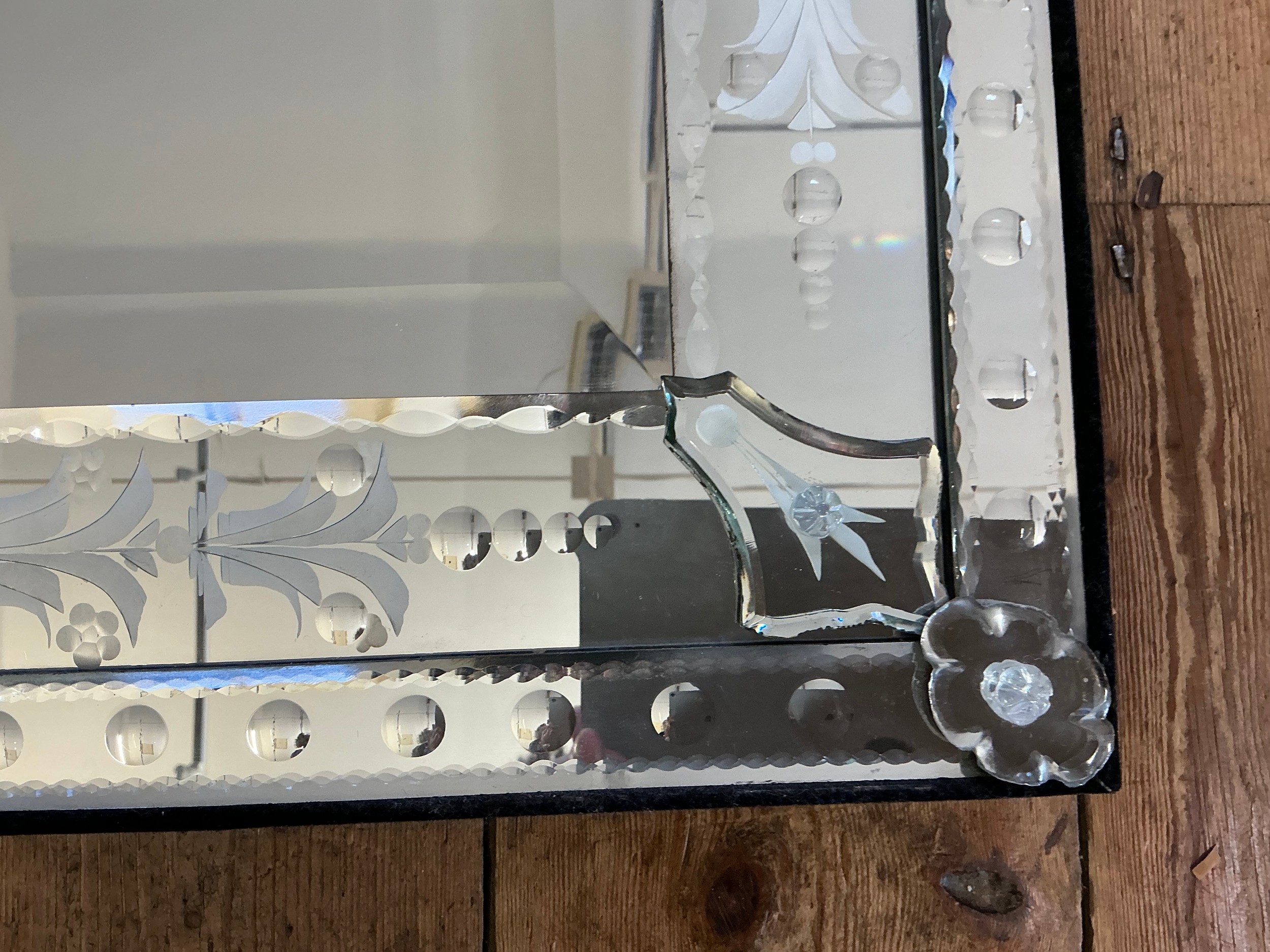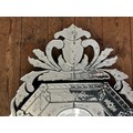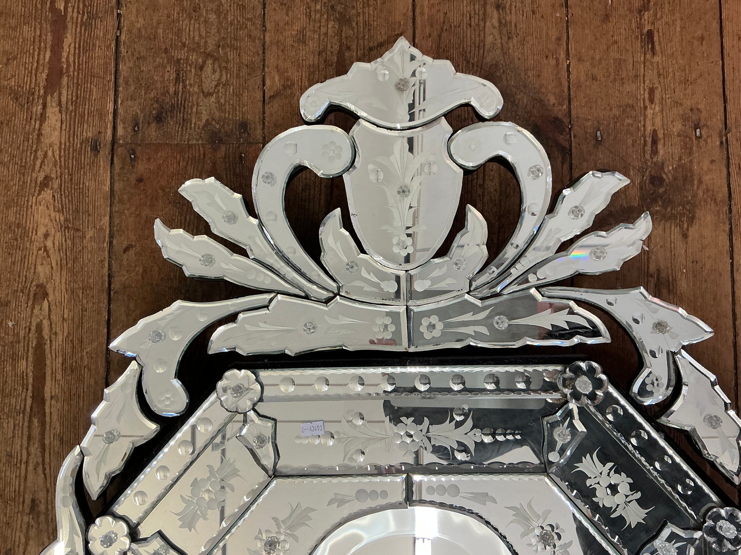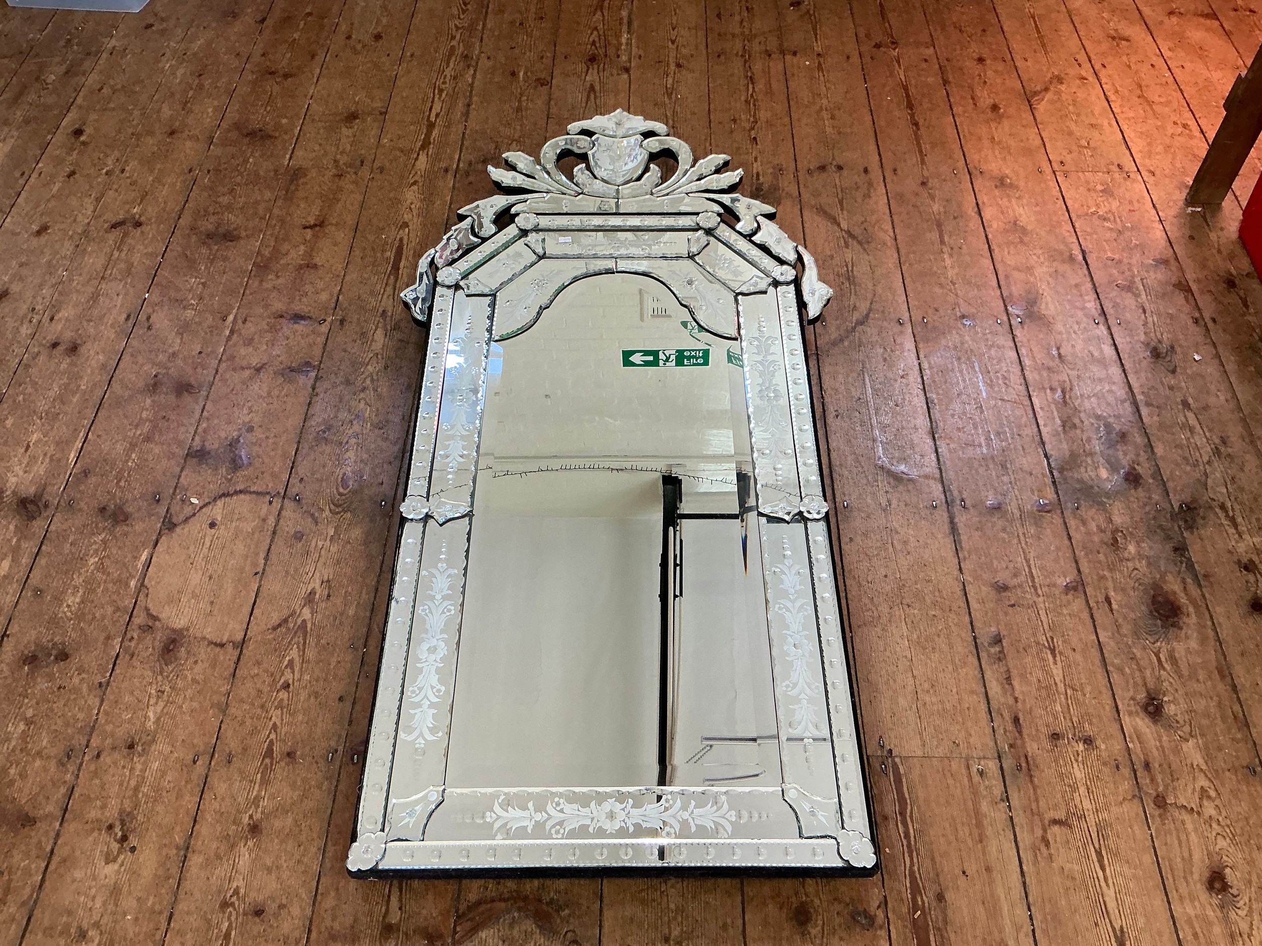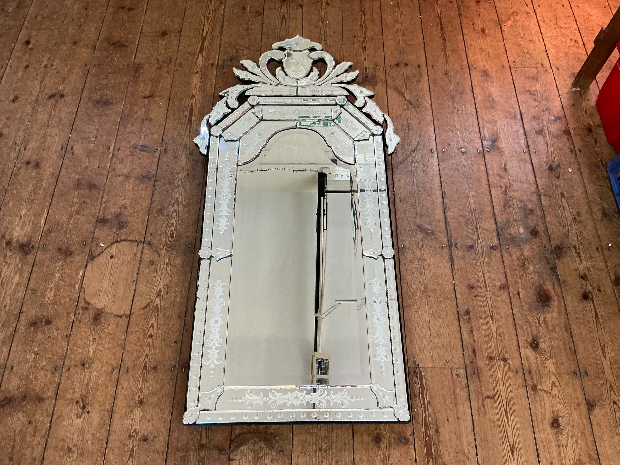 An Italian design Cut Glass Venetian Effect Mirror with engraved Frosted Decoration. Measuring: 143cms x 72cms.