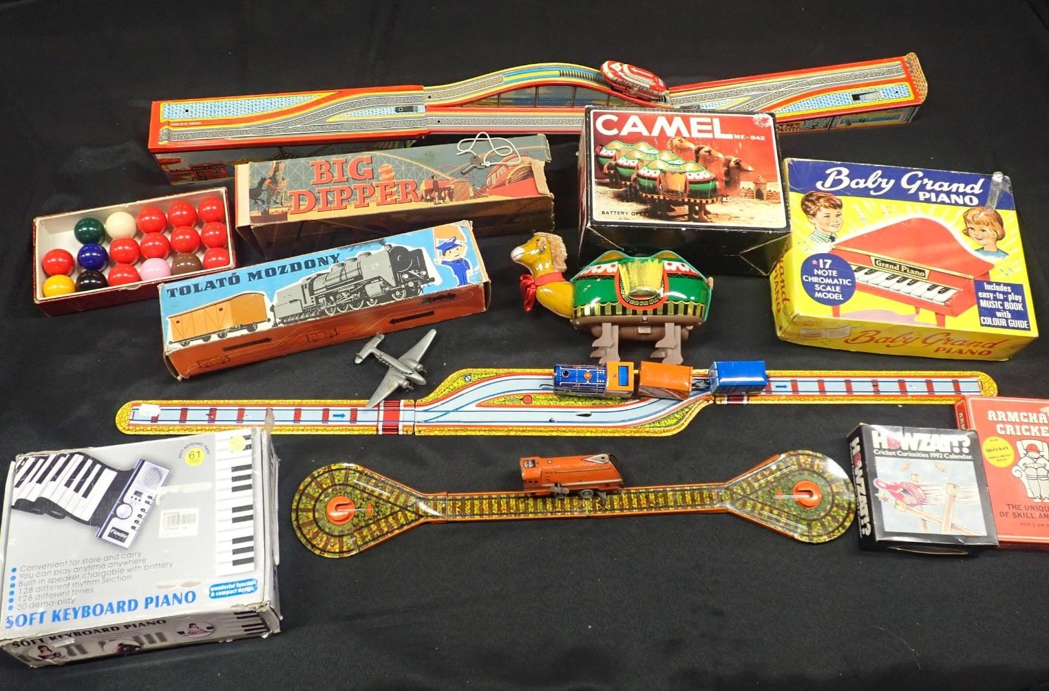 possibly by Mettoy, a similar Hungarian toy railway, a Mettoy railway toy, a toy piano and other toys and games, and a soft keyboard piano (untested)