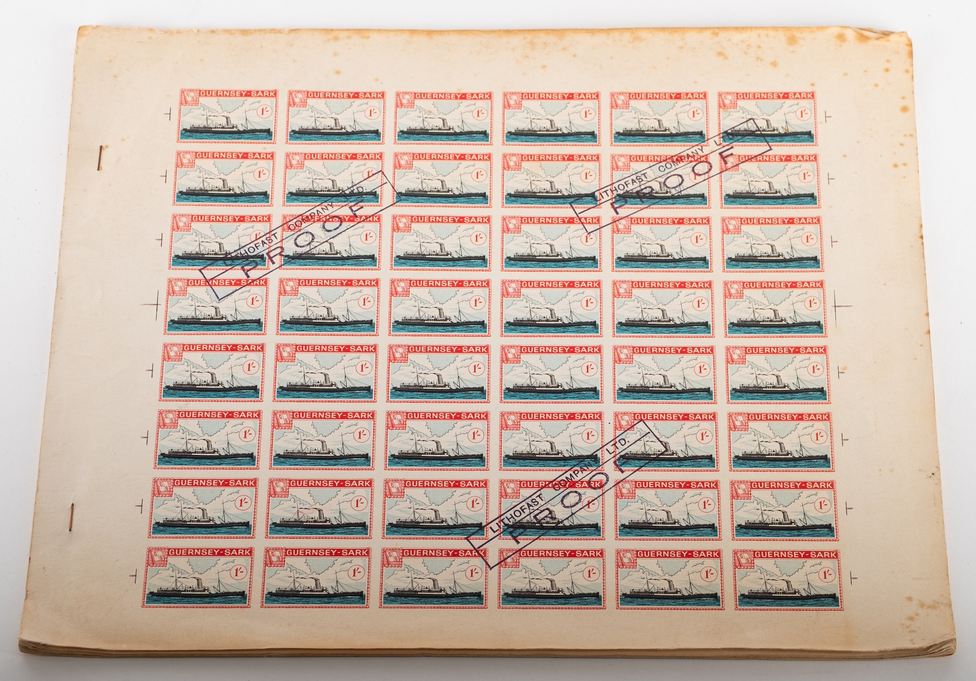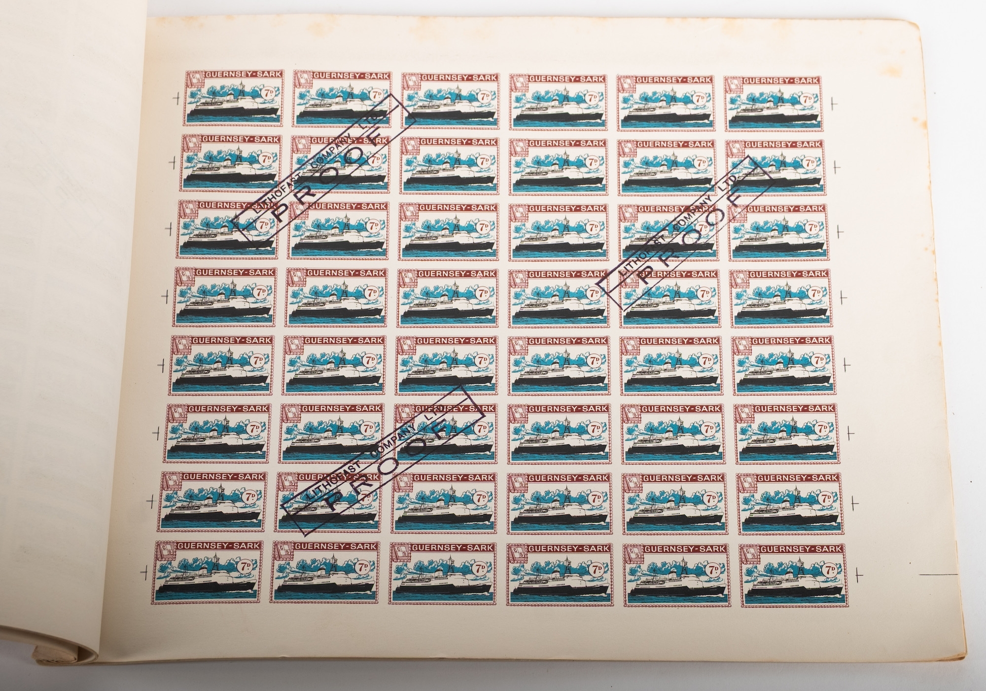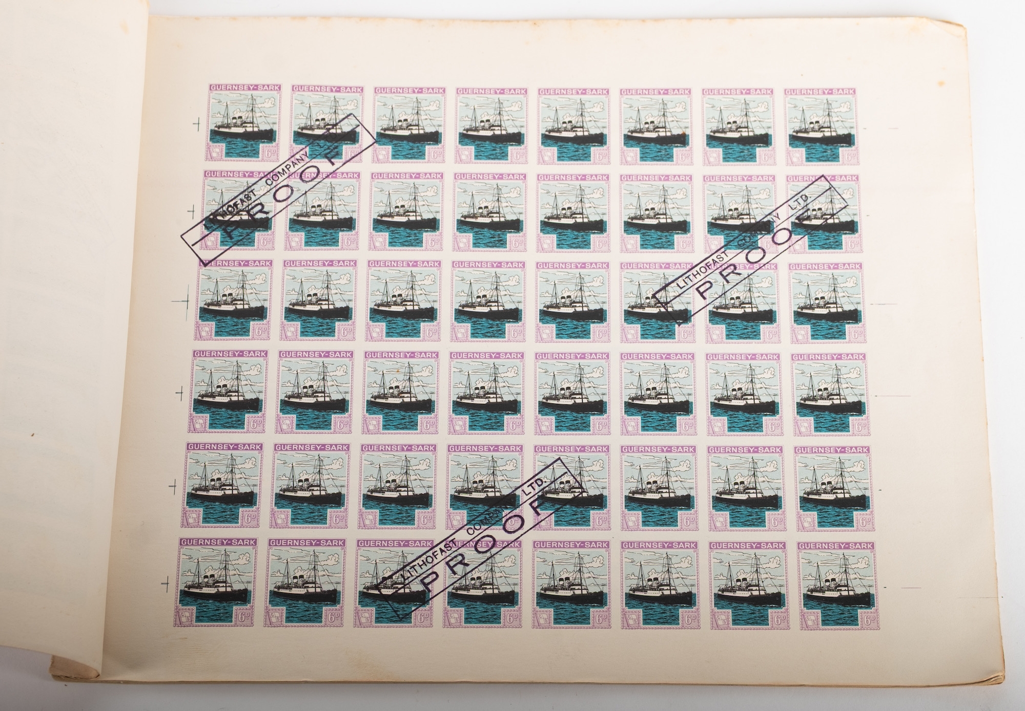 Guernsey - Sark - Alderney. A book of 12 complete sheets of proofs stamped ''Lithofast Company Ltd PROOF''. Some foxing and bends.