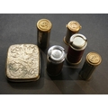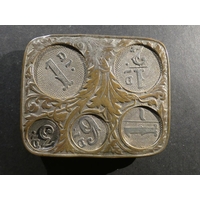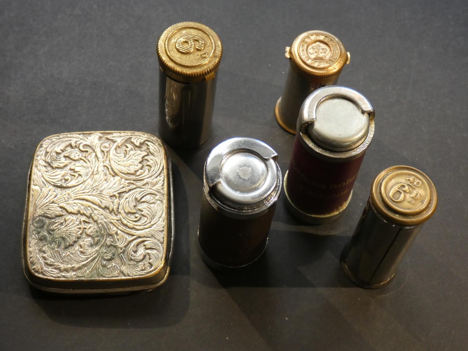 COIN HOLDERS. Small collection of Edwardian & later spring-loaded coin holders, one to hold various denominations 3d to 2/6, 68mm x 57mm x 14mm, nickel-plated brass with ornate floral decoration, loop attachment missing, plus 5 others, single denomination “pillar-box” form, for silver 3d, 6d or 2x Sovereign (could be used for modern £1). Mixed, generally good condition. (6)