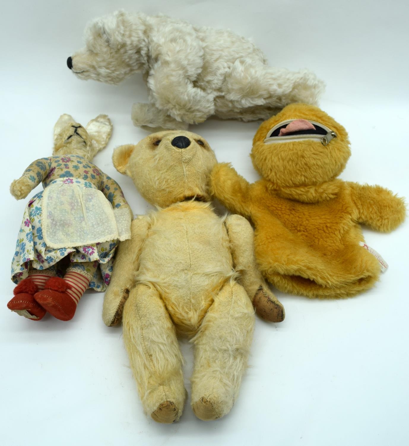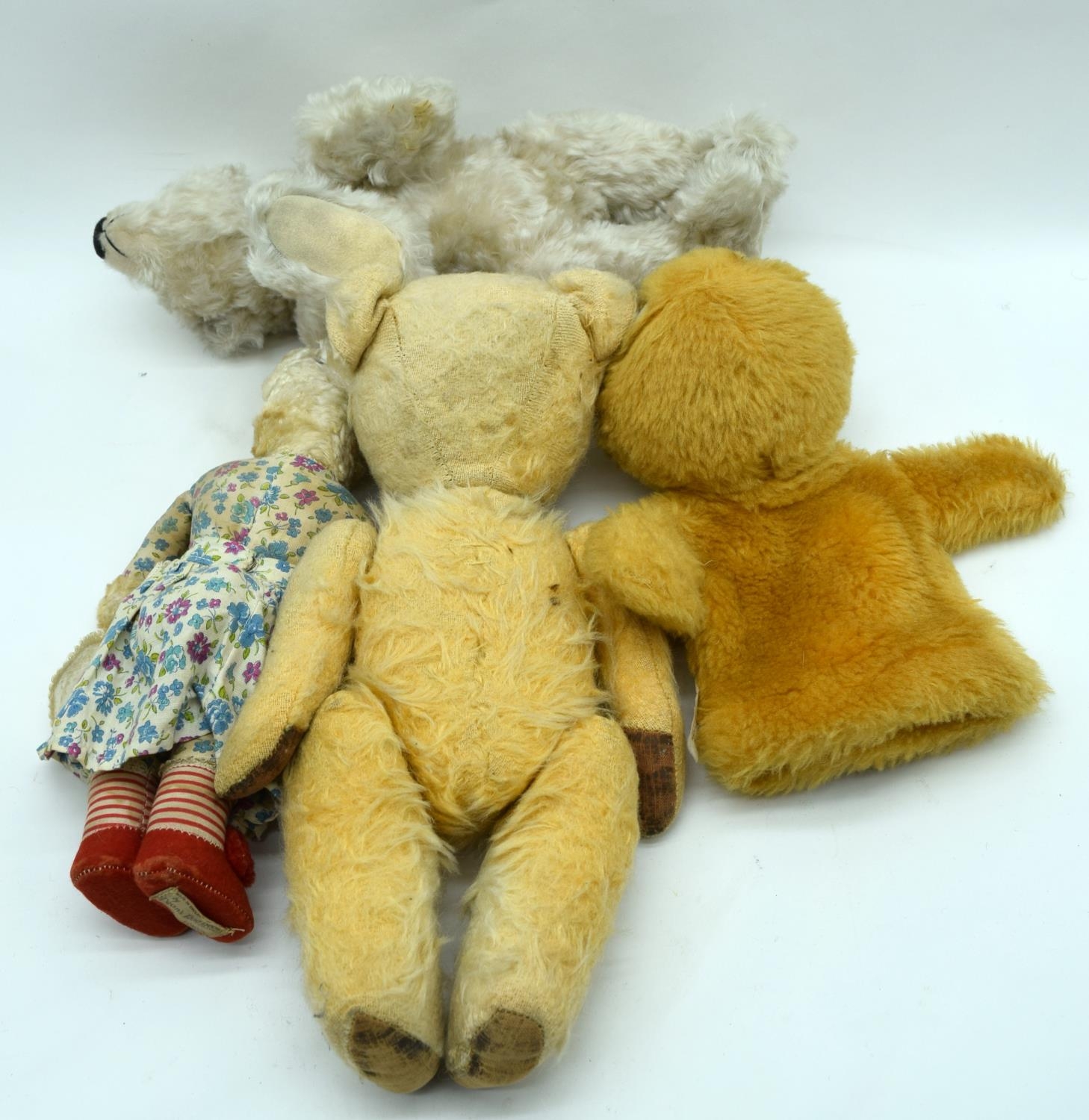 A collection of vintage soft toys and teddys Deans rag book, etc 34cm (4).