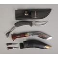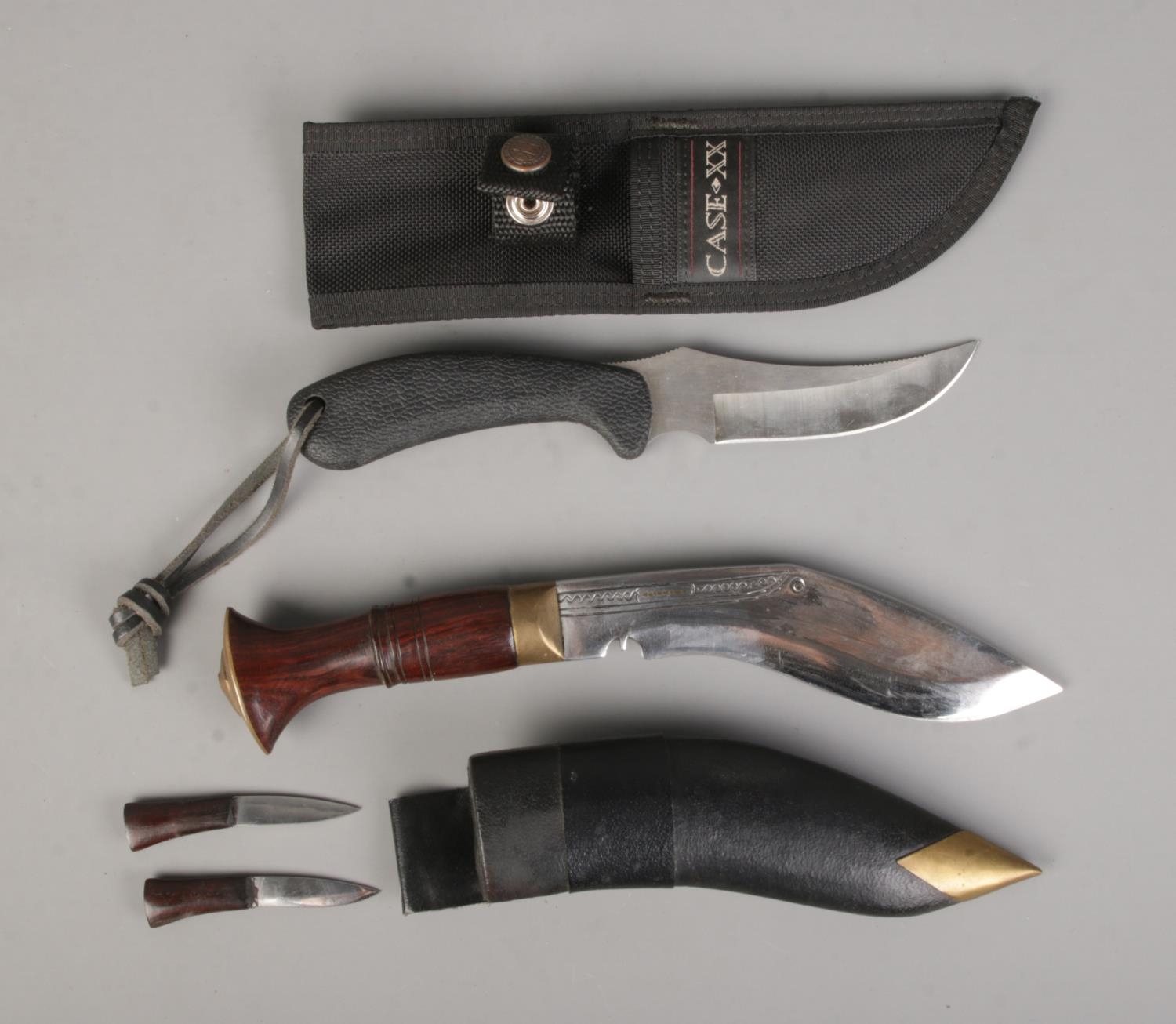 Two small knives to include Case XX hunting knife with matching sheath along with Kukri in scabbard housing two smaller accompanying knifes.
