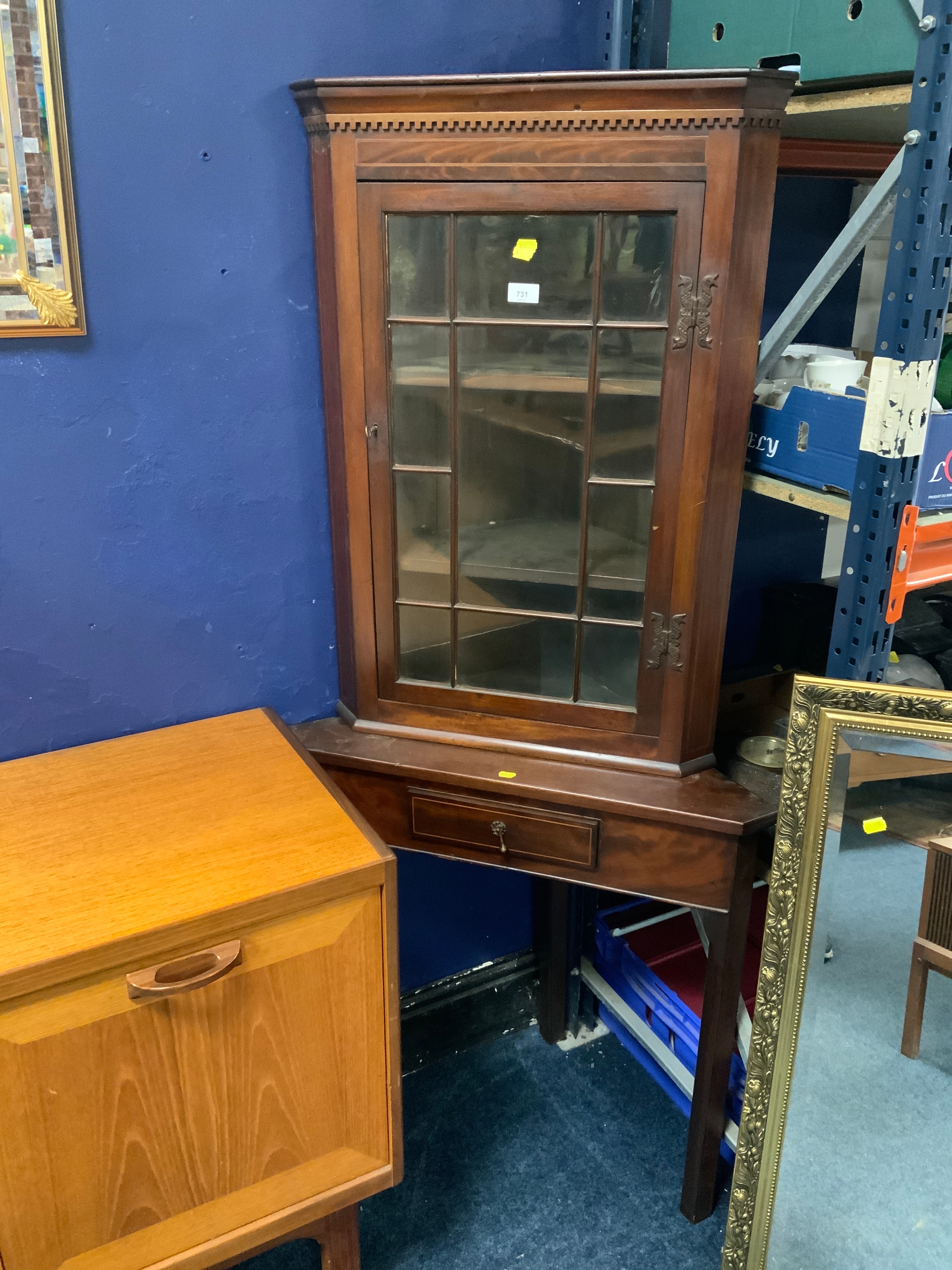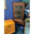 An antique mahogany inlaid corner cabinet on stand