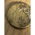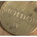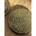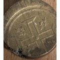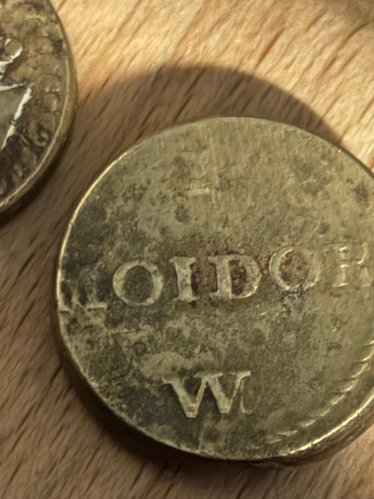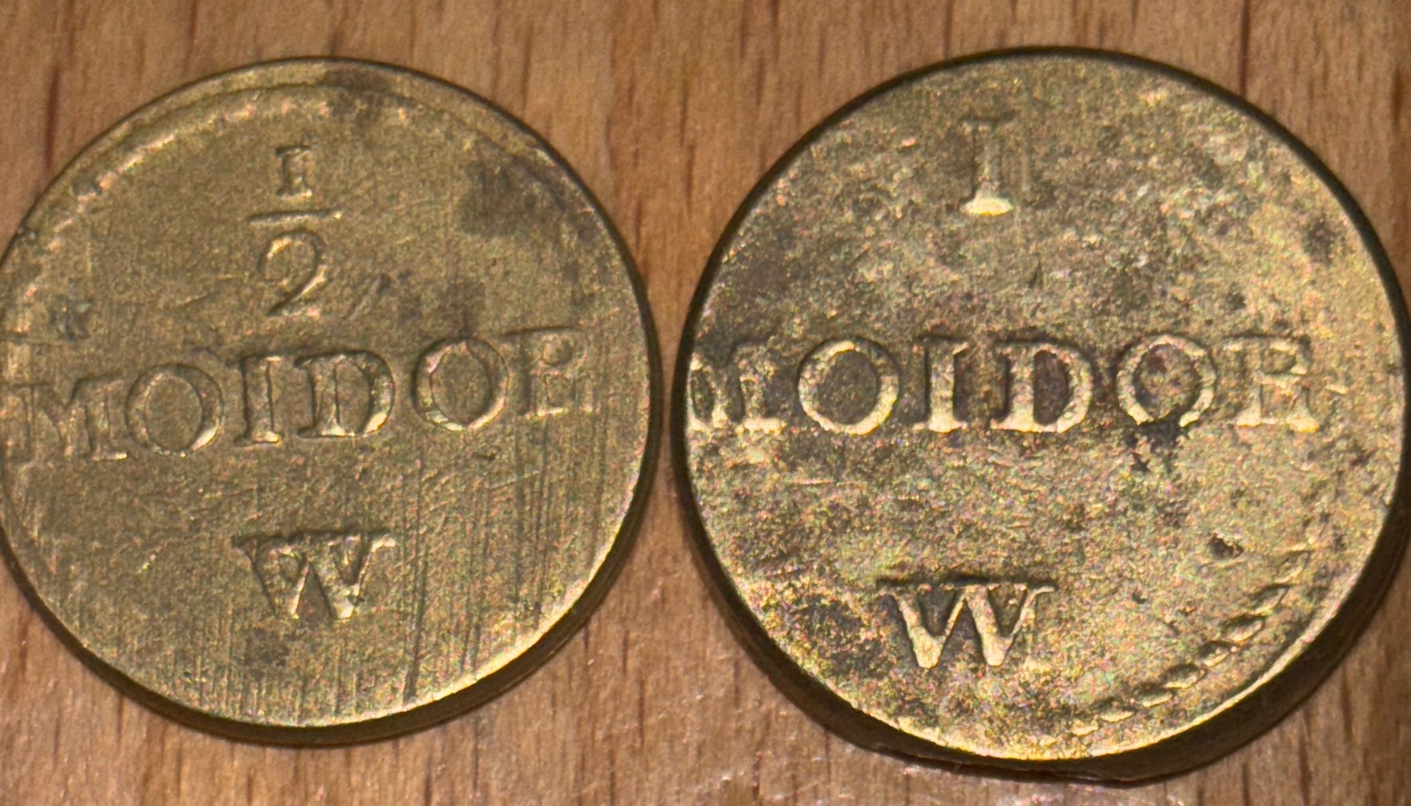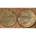Pair of 17th–18th Century Portuguese Gold Coin Weights — Moidore & Half Moidore A matched pair of antique brass coin weights for Portuguese gold Moidore coins, widely used in Britain during the late 17th and 18th centuries for international trade. These merchant weights were employed to verify the correct standard of circulating gold coinage and to detect clipping or underweight pieces. Comprising: • 1 Moidore weight — stamped “1 MOIDOR” with maker’s mark W • ½ Moidore weight — stamped “½ MOIDOR” with maker’s mark W Both examples display attractive aged patina, clear period lettering, and honest handling wear consistent with commercial use. Such weights were essential tools for bankers, merchants, and goldsmiths dealing in foreign gold coin. Material: Brass Date: Late 17th to mid-18th century Origin: Britain (for Portuguese trade coinage) Condition: Very good for type, with legible stamps and pleasing age tone A desirable pair of early trade artefacts, ideal for collectors of numismatics, maritime commerce, or Georgian-period mercantile history.