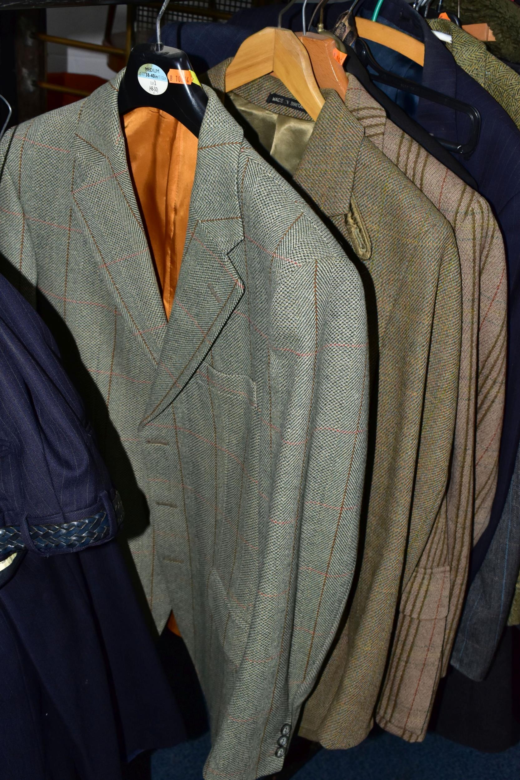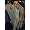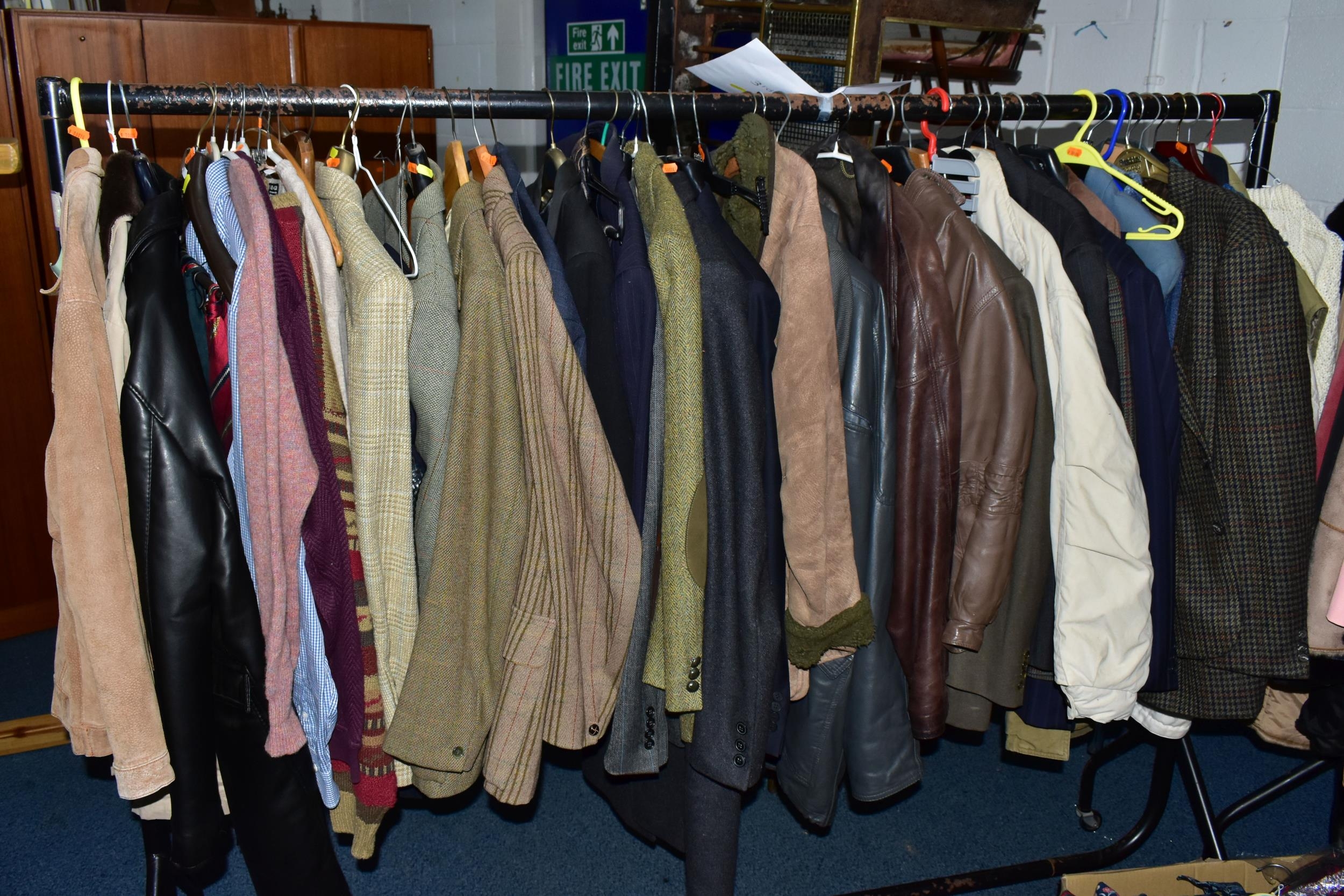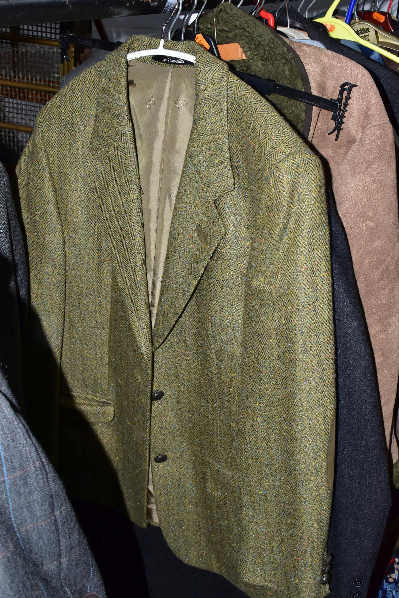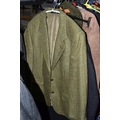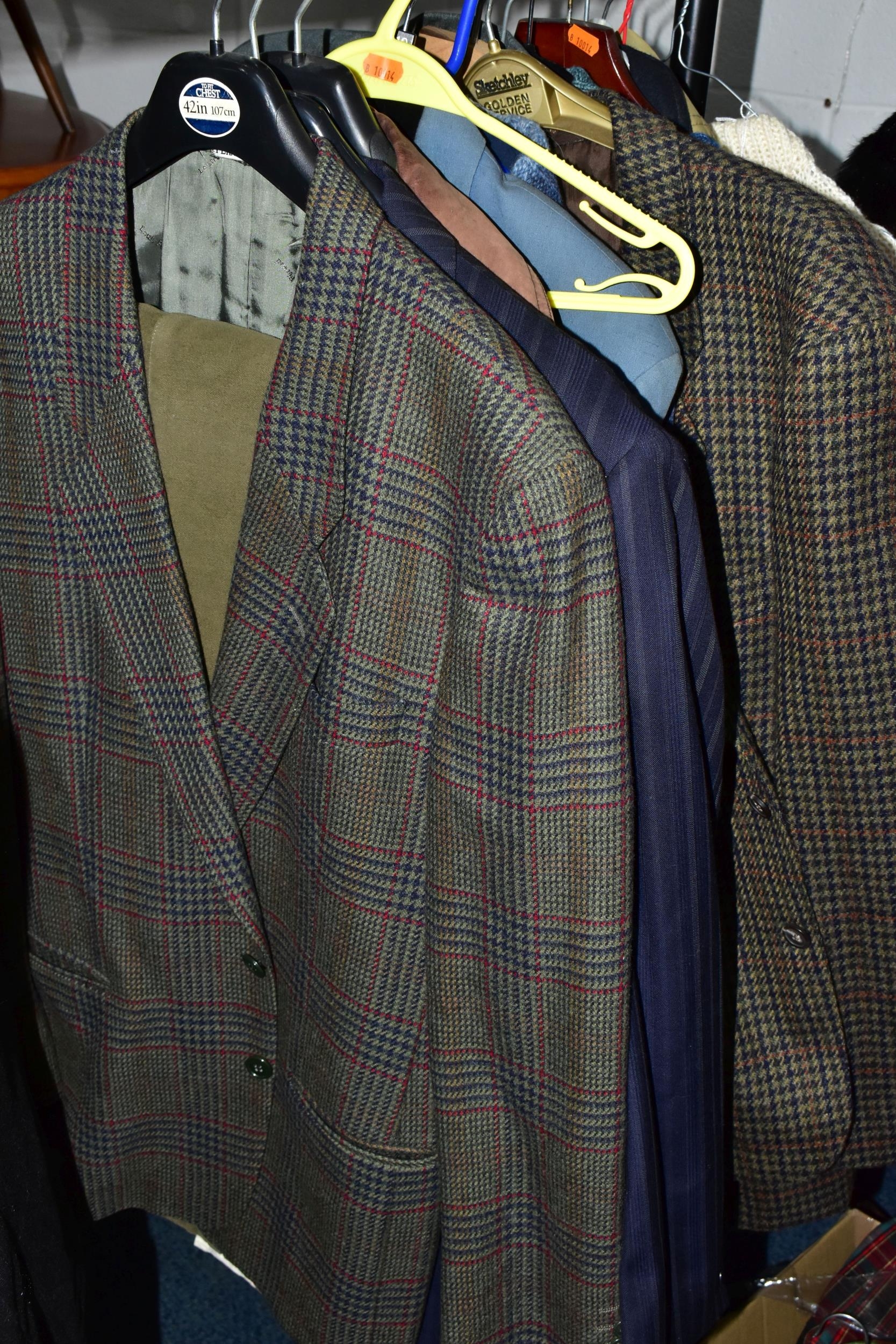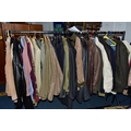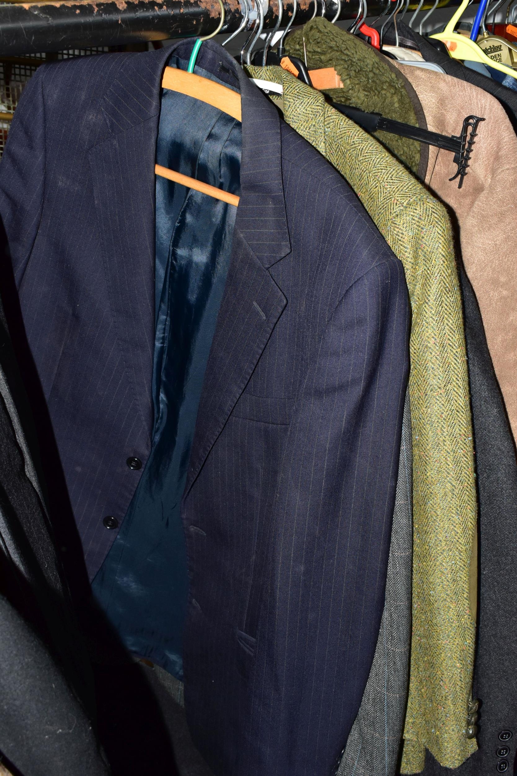 ONE RAIL OF GENTLEMEN'S CLOTHING, to include suits, tweed jackets, sheepskin coat, sweaters, dinner suit, etc. (1 rail)