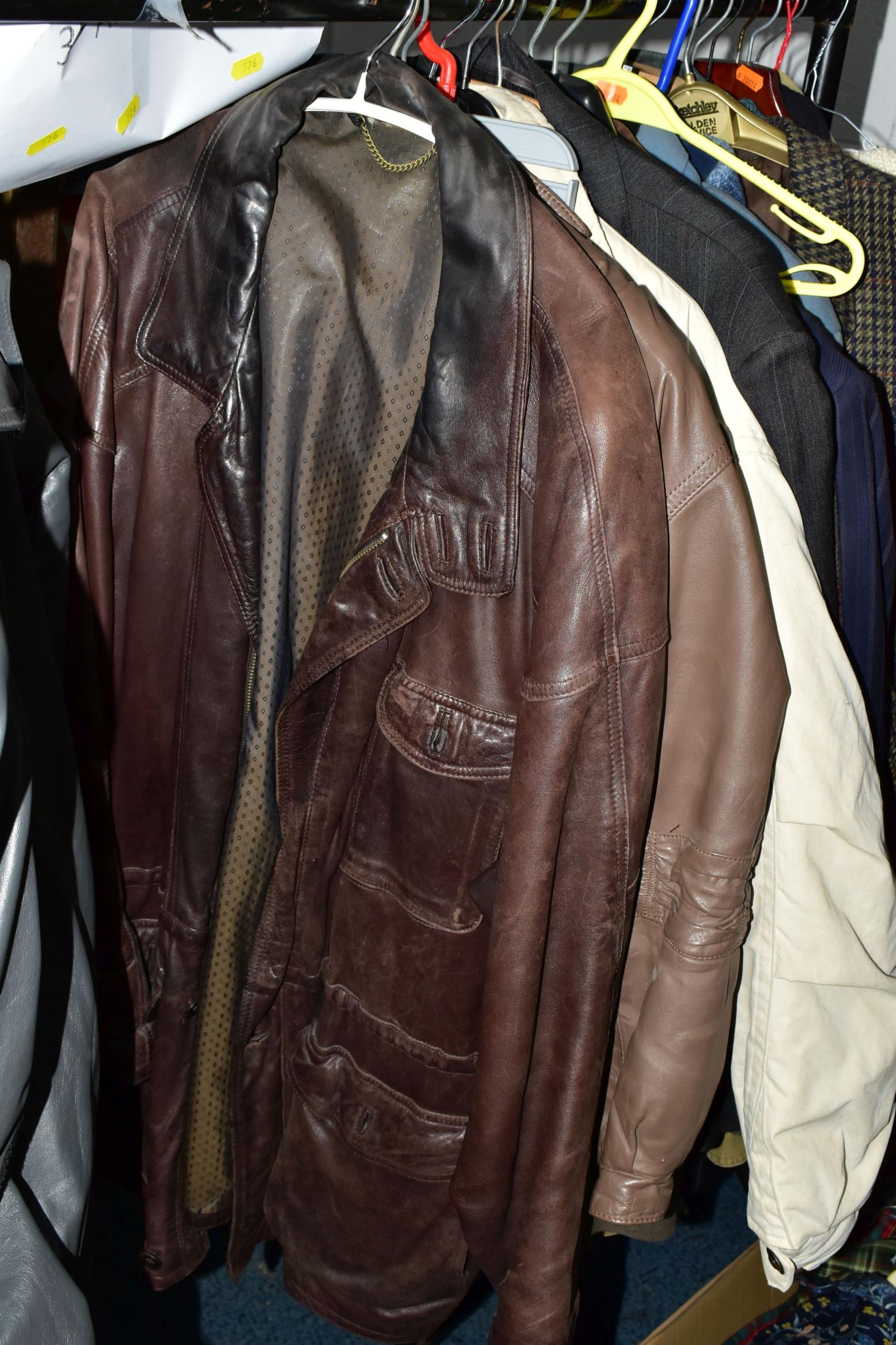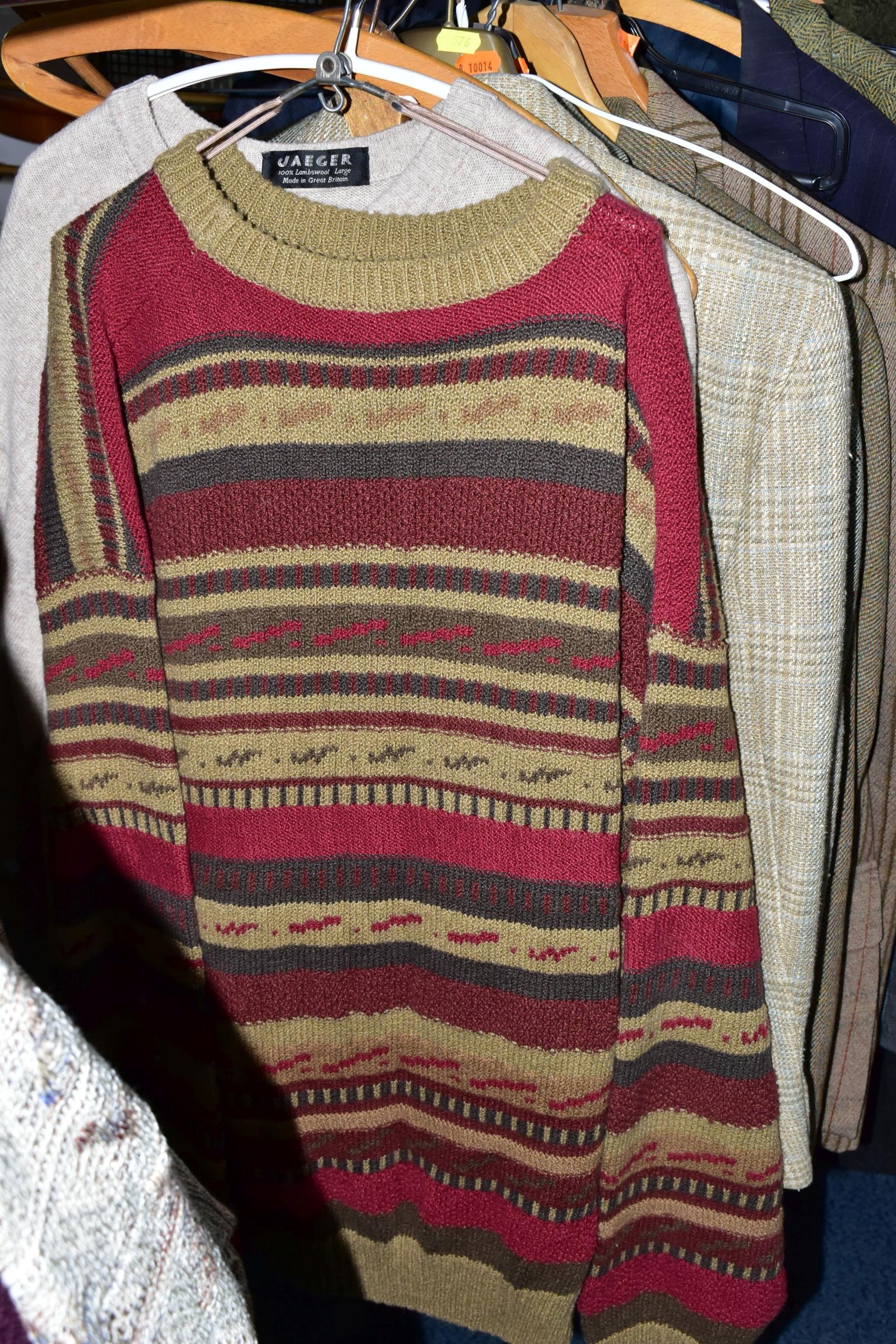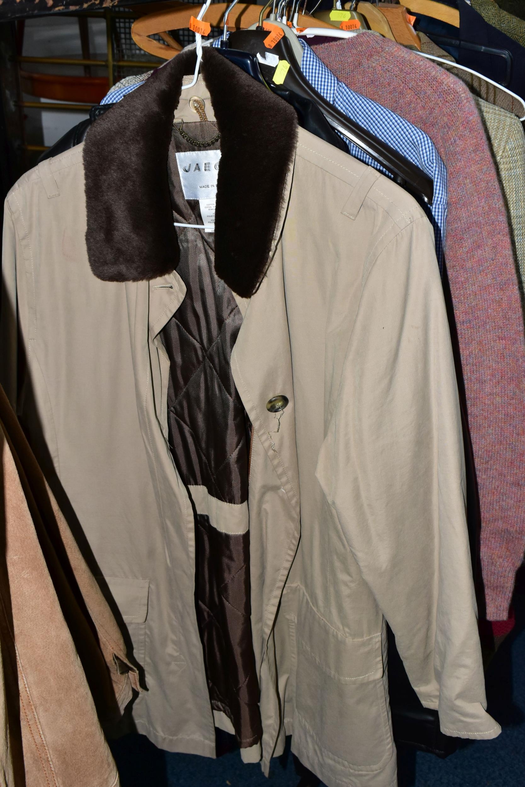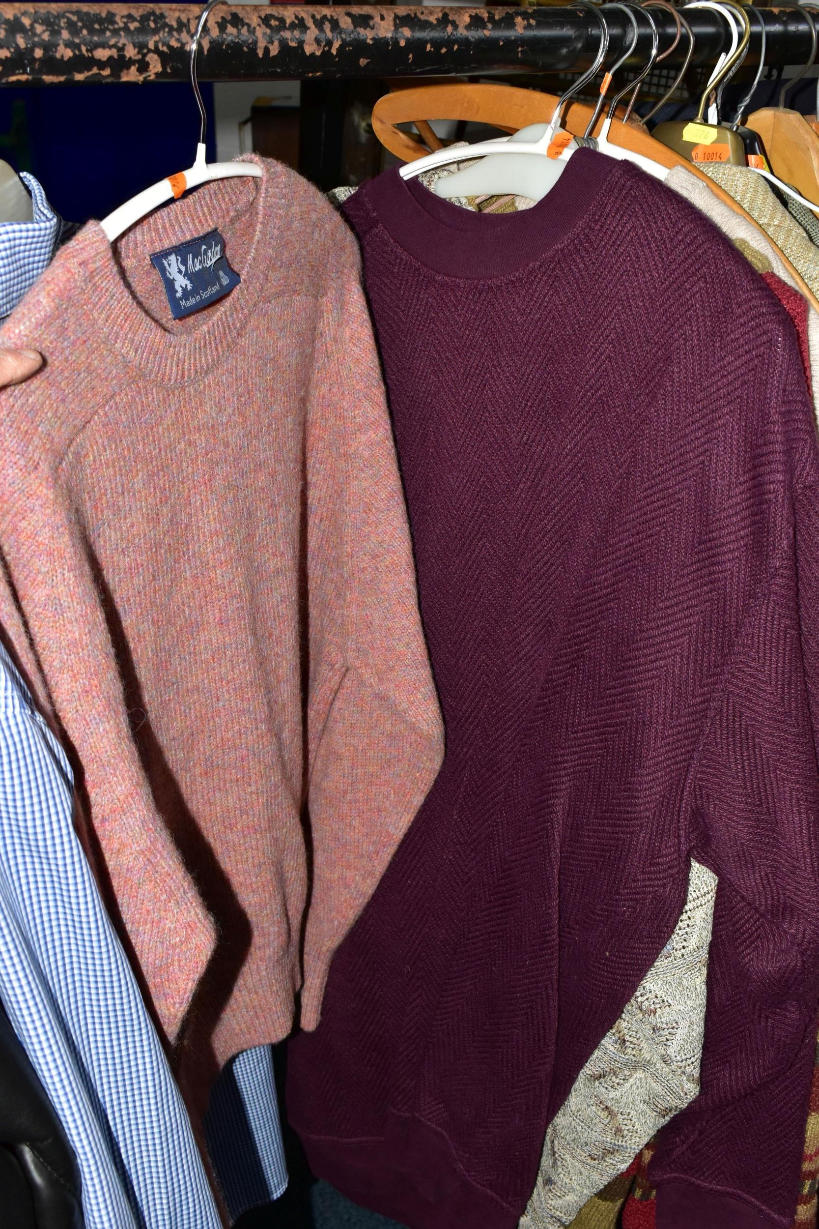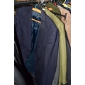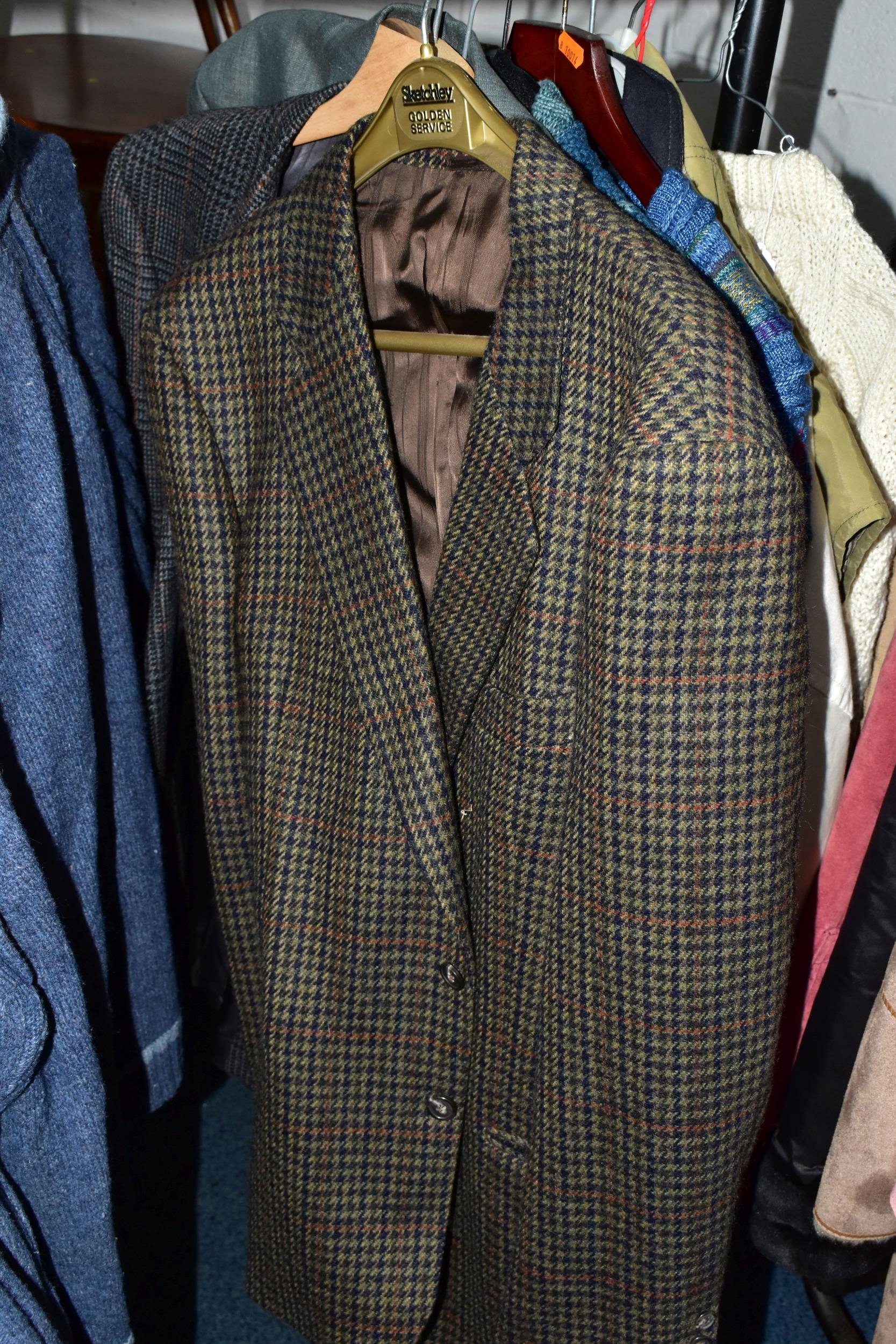 ONE RAIL OF GENTLEMEN'S CLOTHING, to include suits, tweed jackets, sheepskin coat, sweaters, dinner suit, etc. (1 rail)