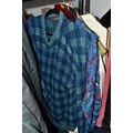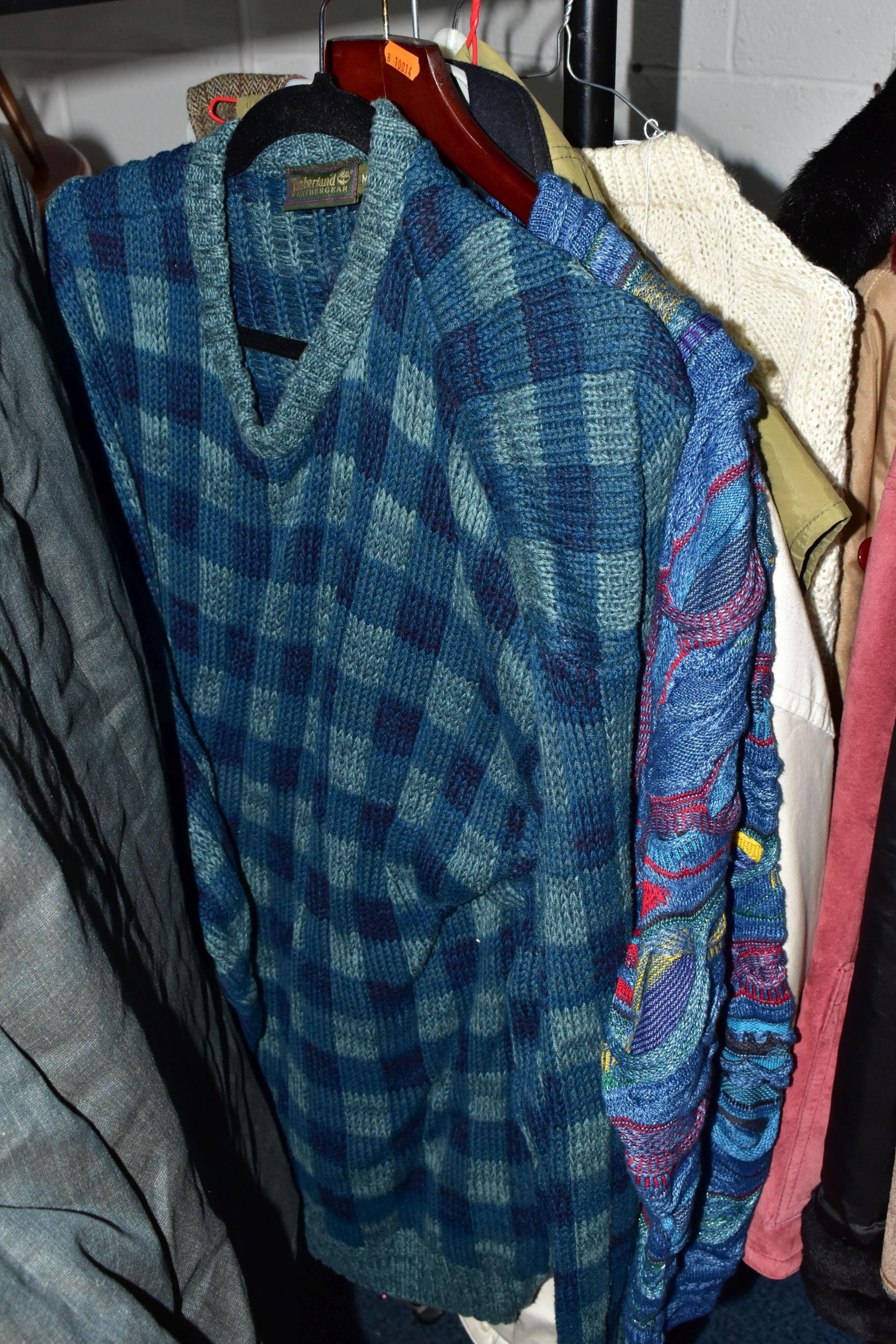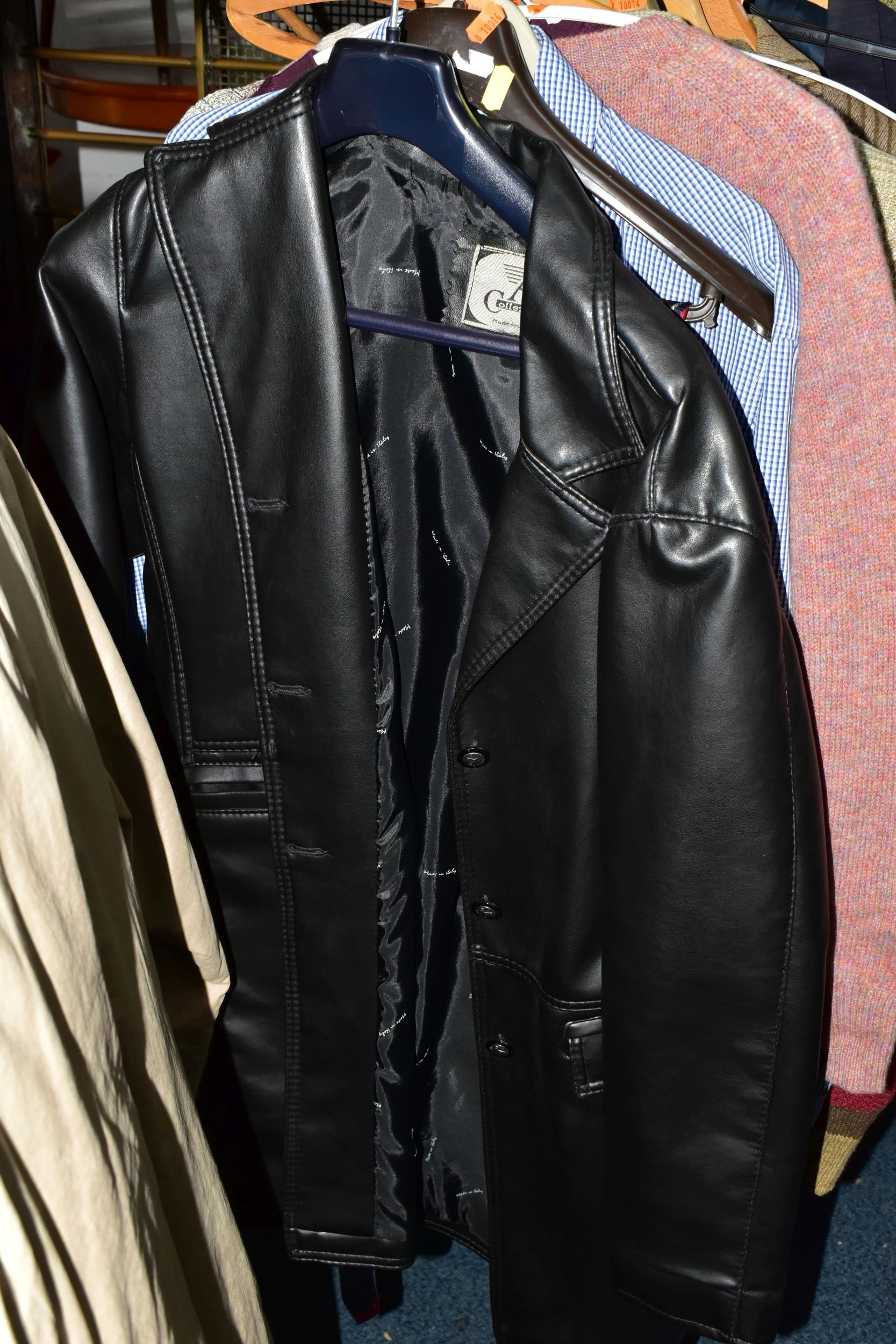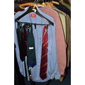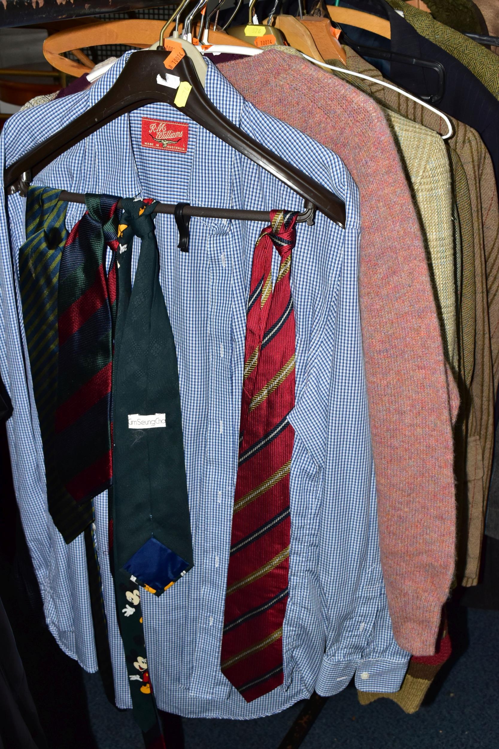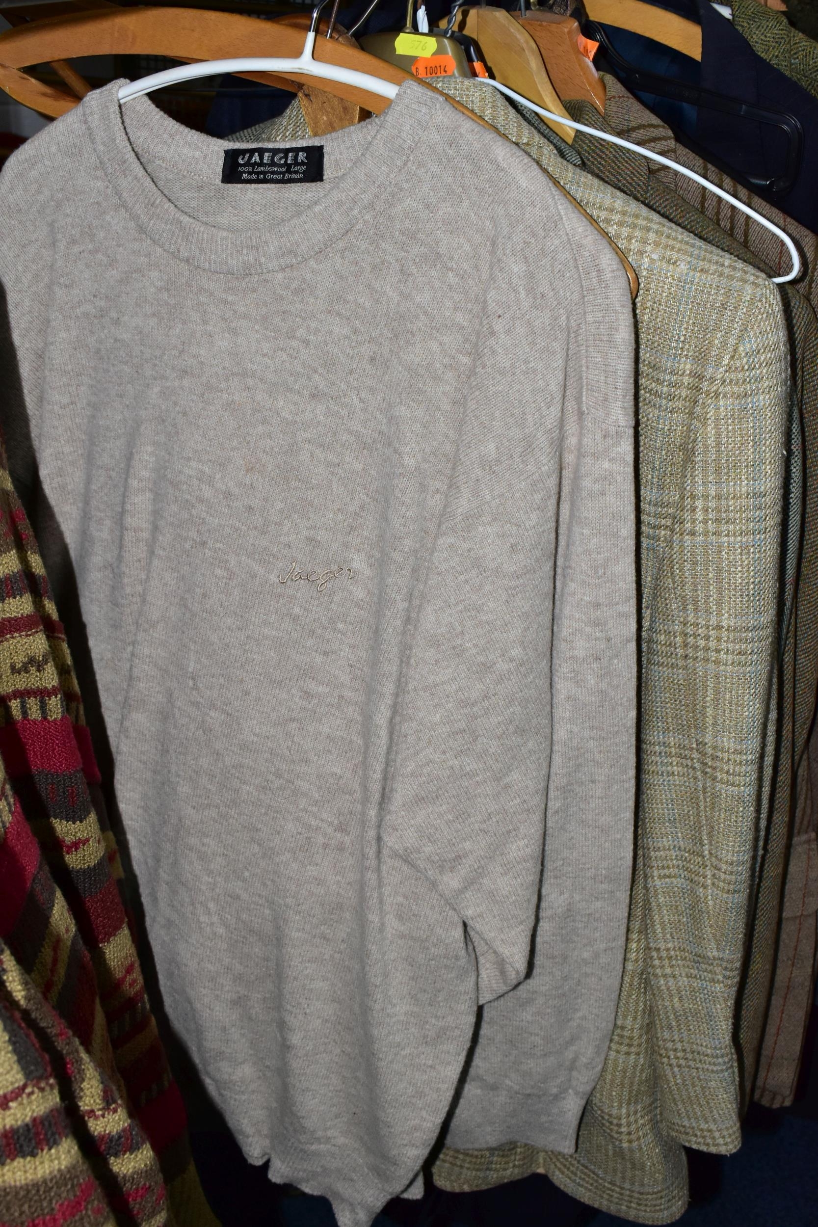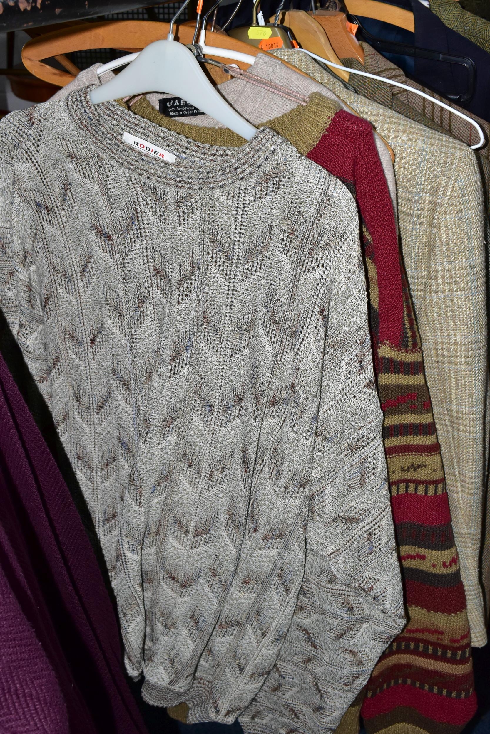ONE RAIL OF GENTLEMEN'S CLOTHING, to include suits, tweed jackets, sheepskin coat, sweaters, dinner suit, etc. (1 rail)