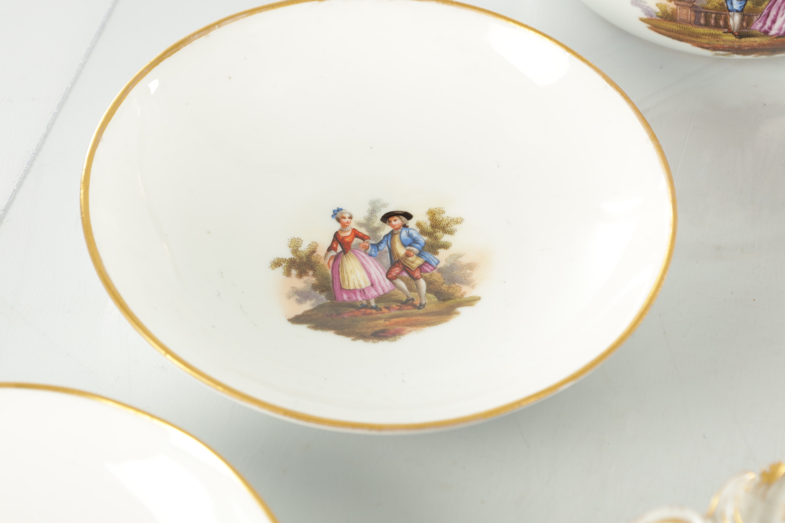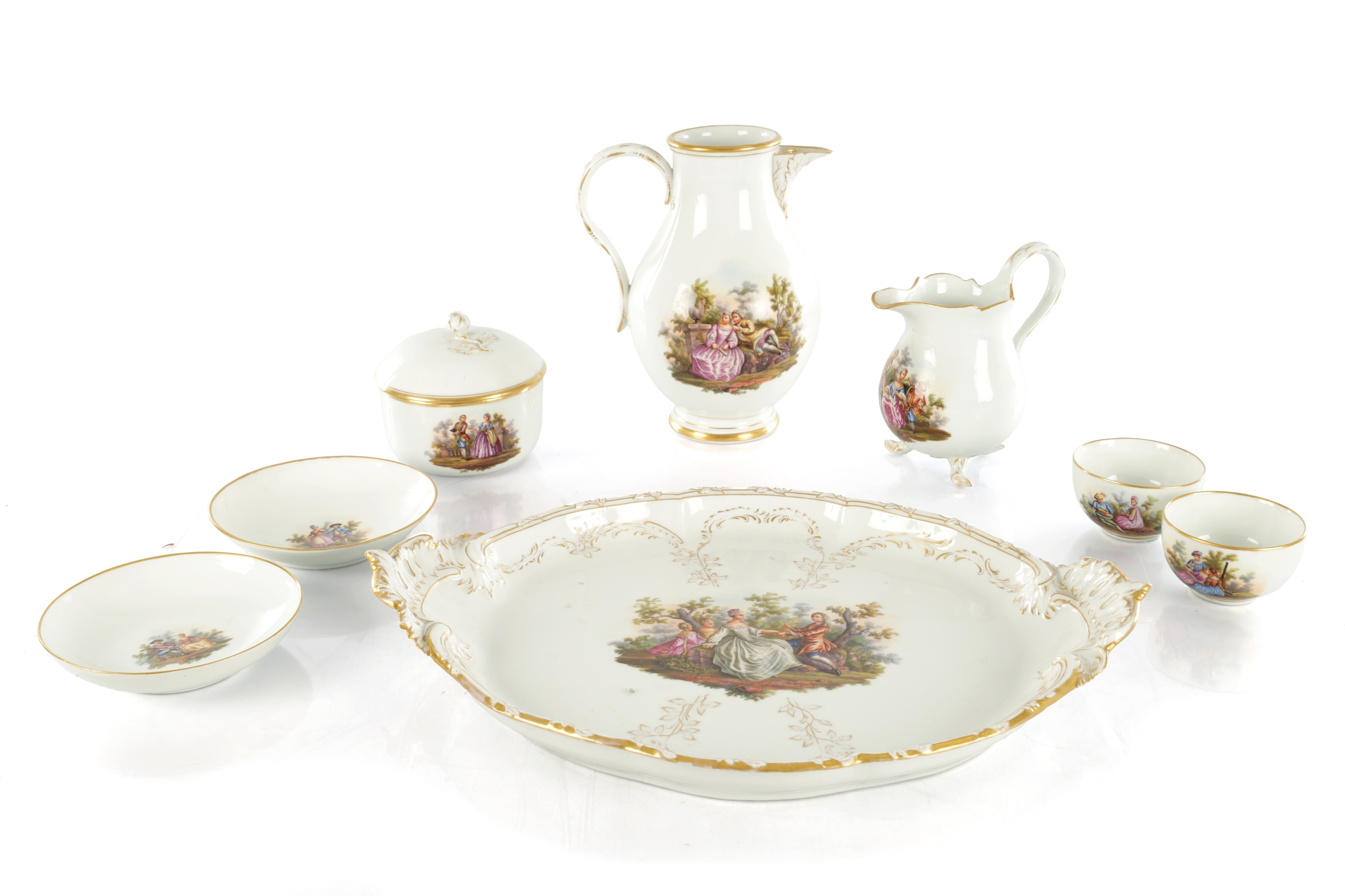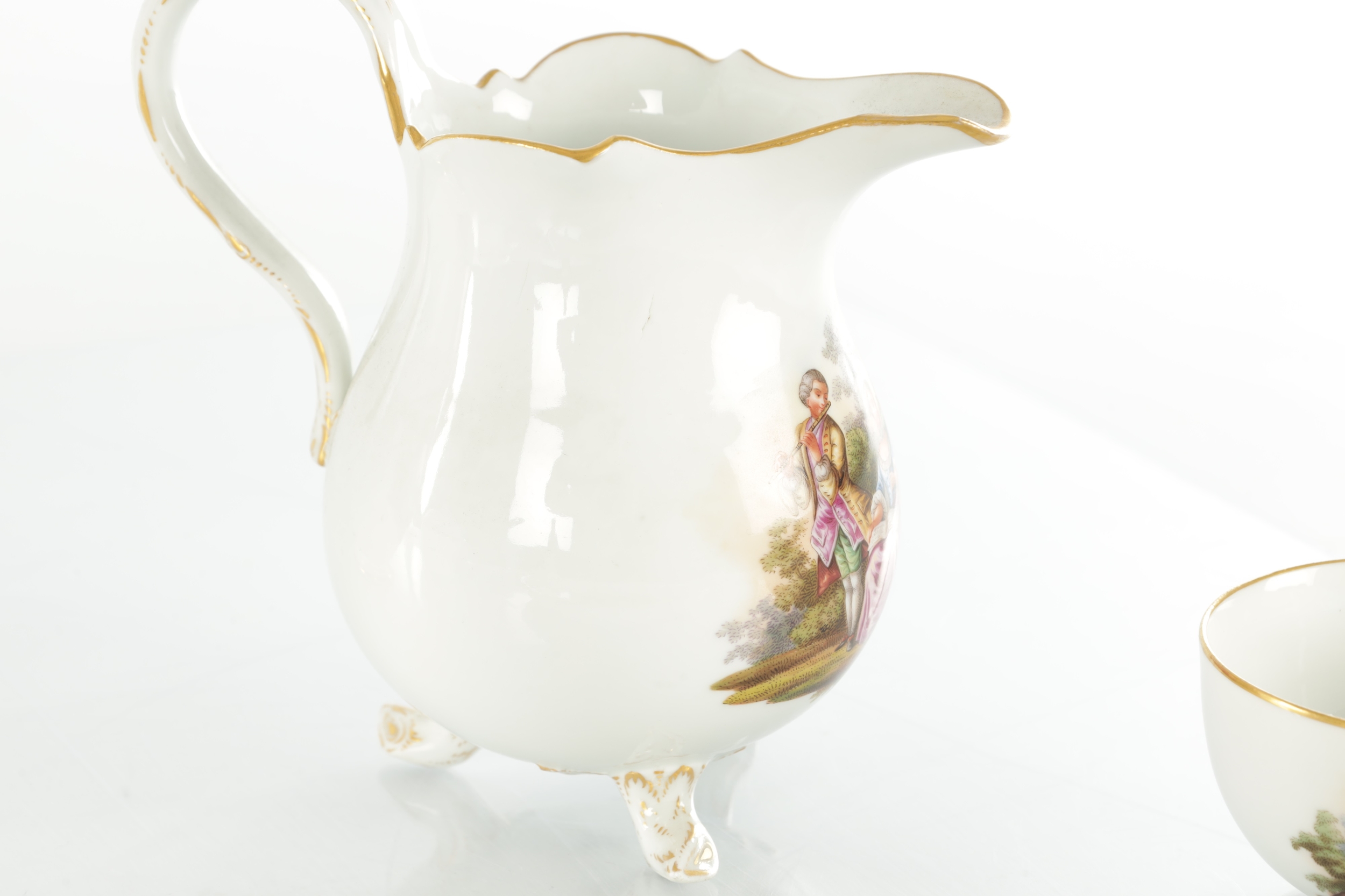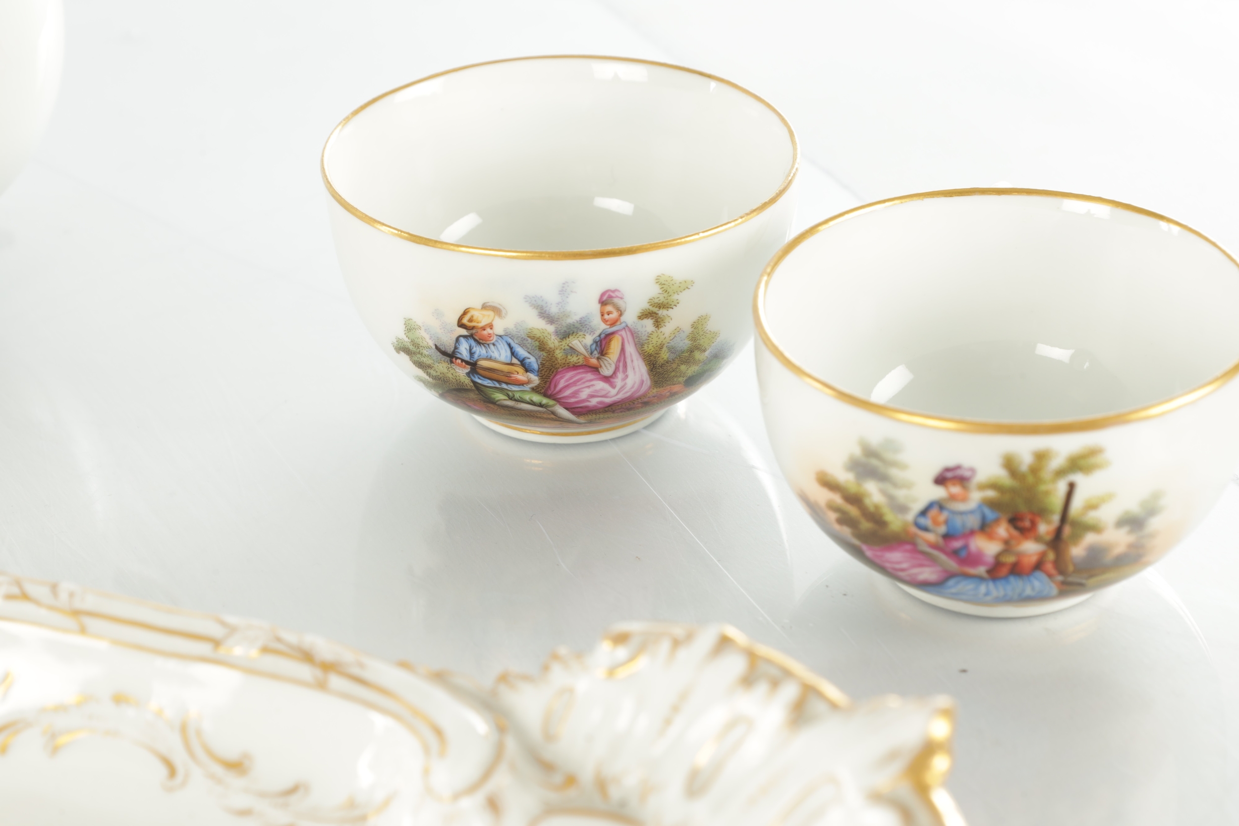AN EARLY 20TH CENTURY MEISSEN PORCELAIN TETE A TETE SET with classical figural panels and gilt edge decoration comprising of a coffee can, two cups and saucers, milk jug, lidded sugar bowl and tray (tray 43cm wide )