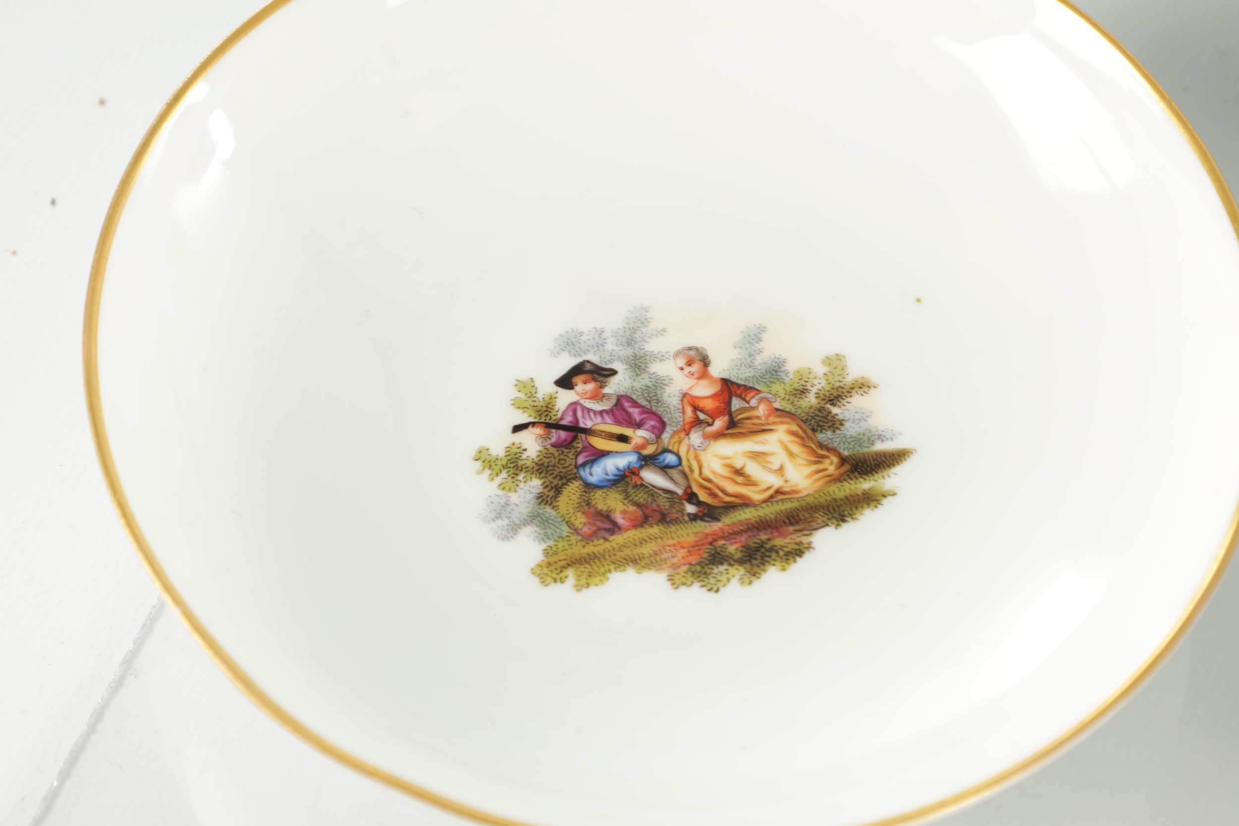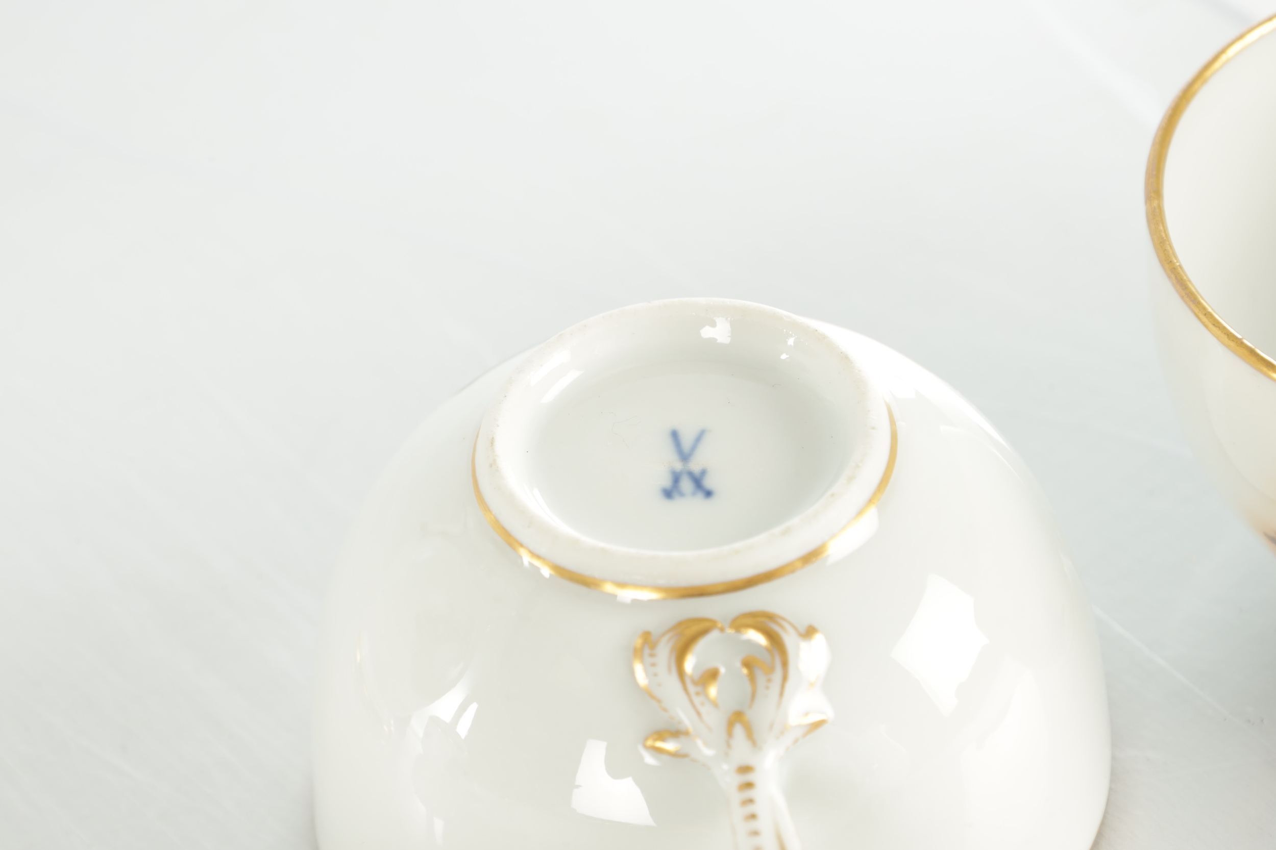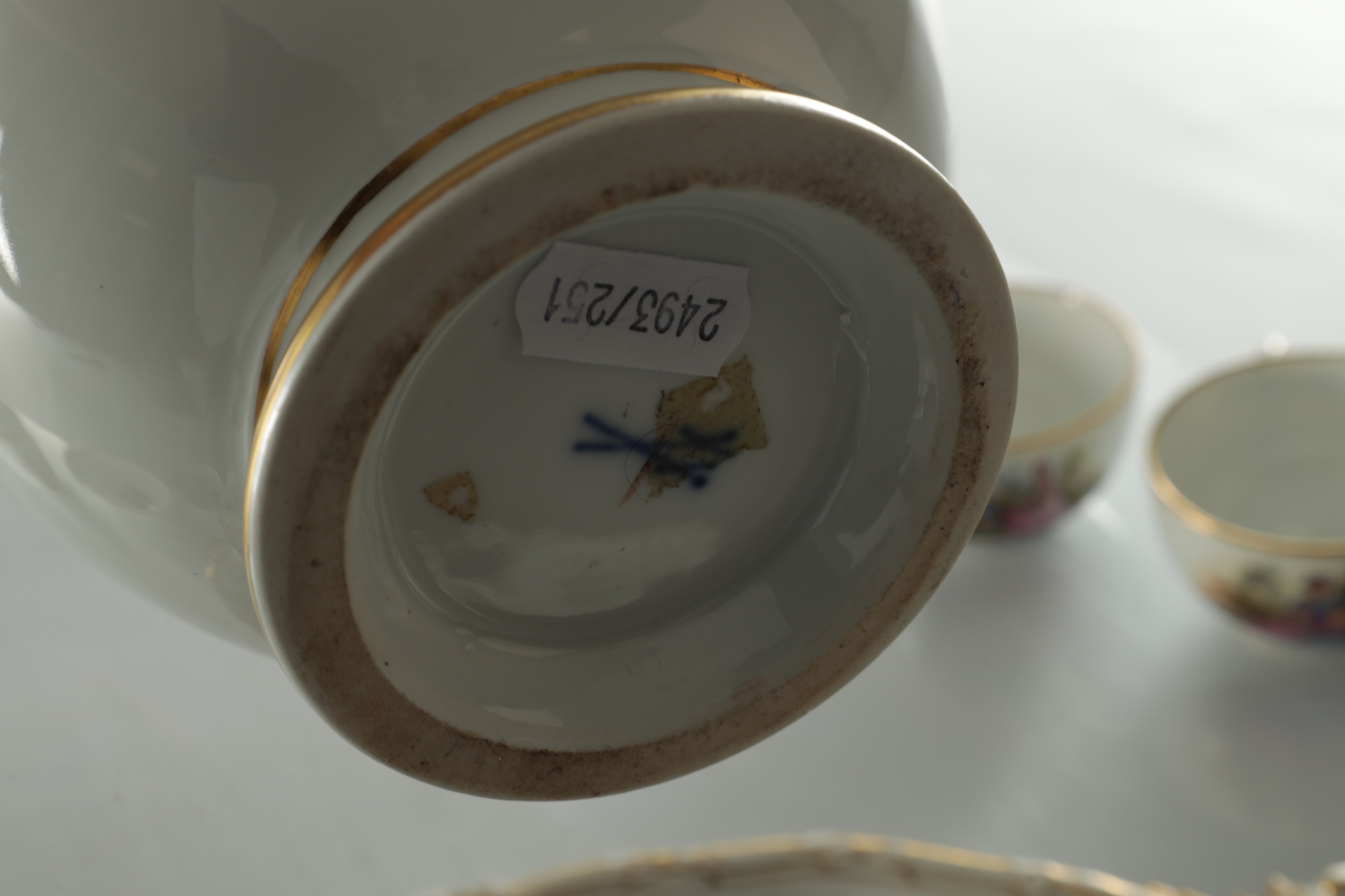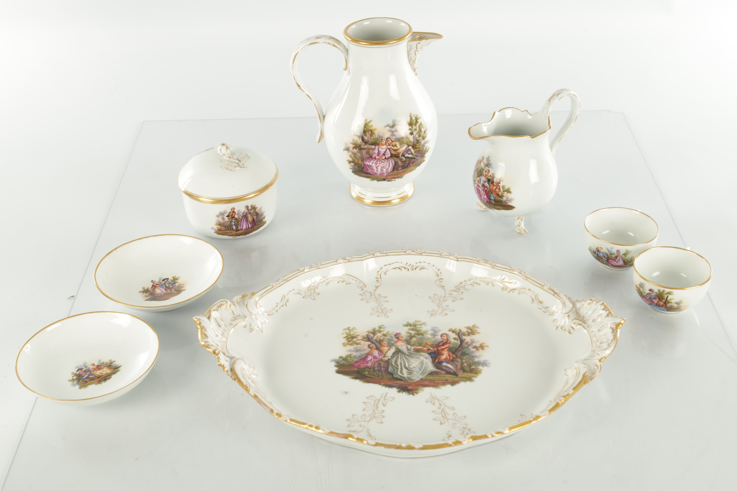 AN EARLY 20TH CENTURY MEISSEN PORCELAIN TETE A TETE SET with classical figural panels and gilt edge decoration comprising of a coffee can, two cups and saucers, milk jug, lidded sugar bowl and tray (tray 43cm wide )