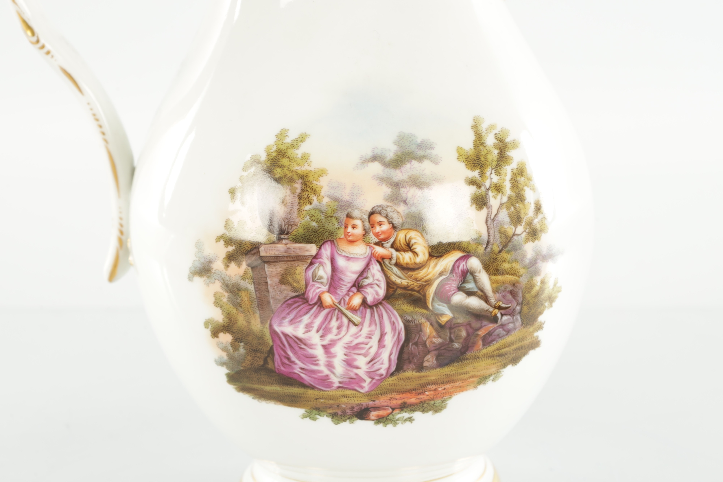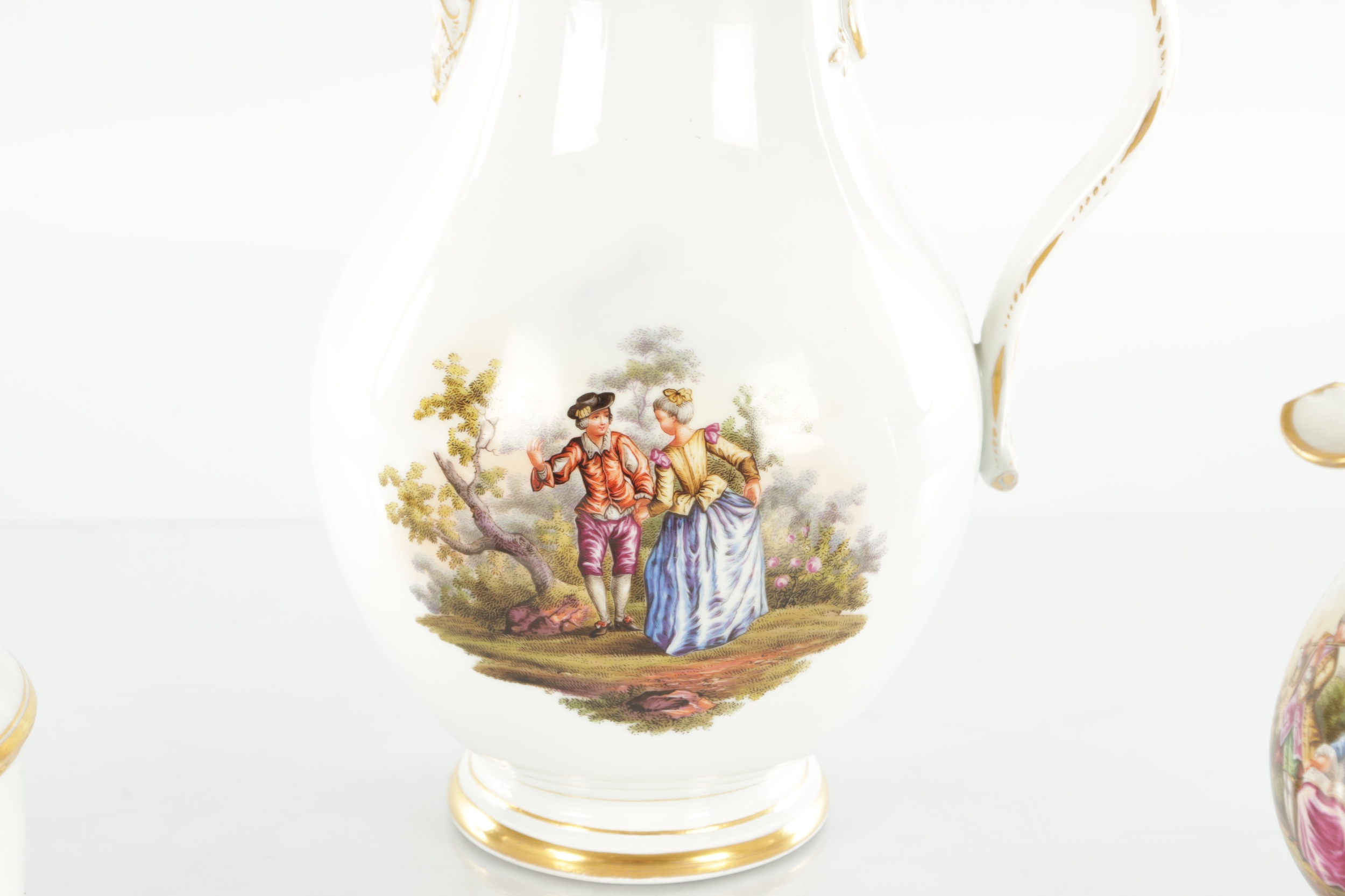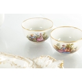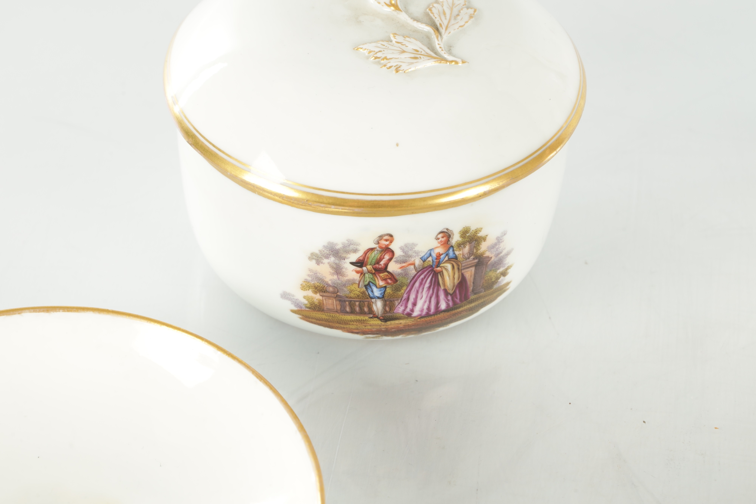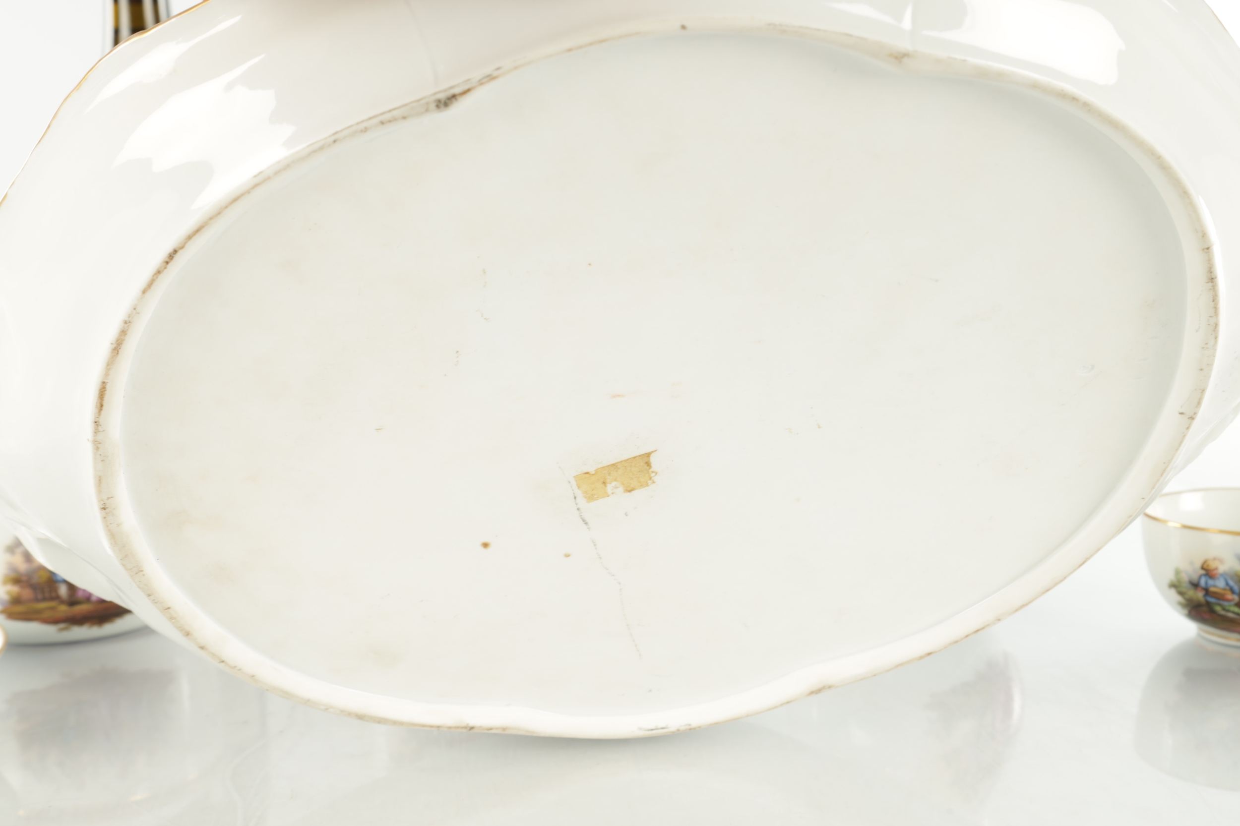 AN EARLY 20TH CENTURY MEISSEN PORCELAIN TETE A TETE SET with classical figural panels and gilt edge decoration comprising of a coffee can, two cups and saucers, milk jug, lidded sugar bowl and tray (tray 43cm wide )