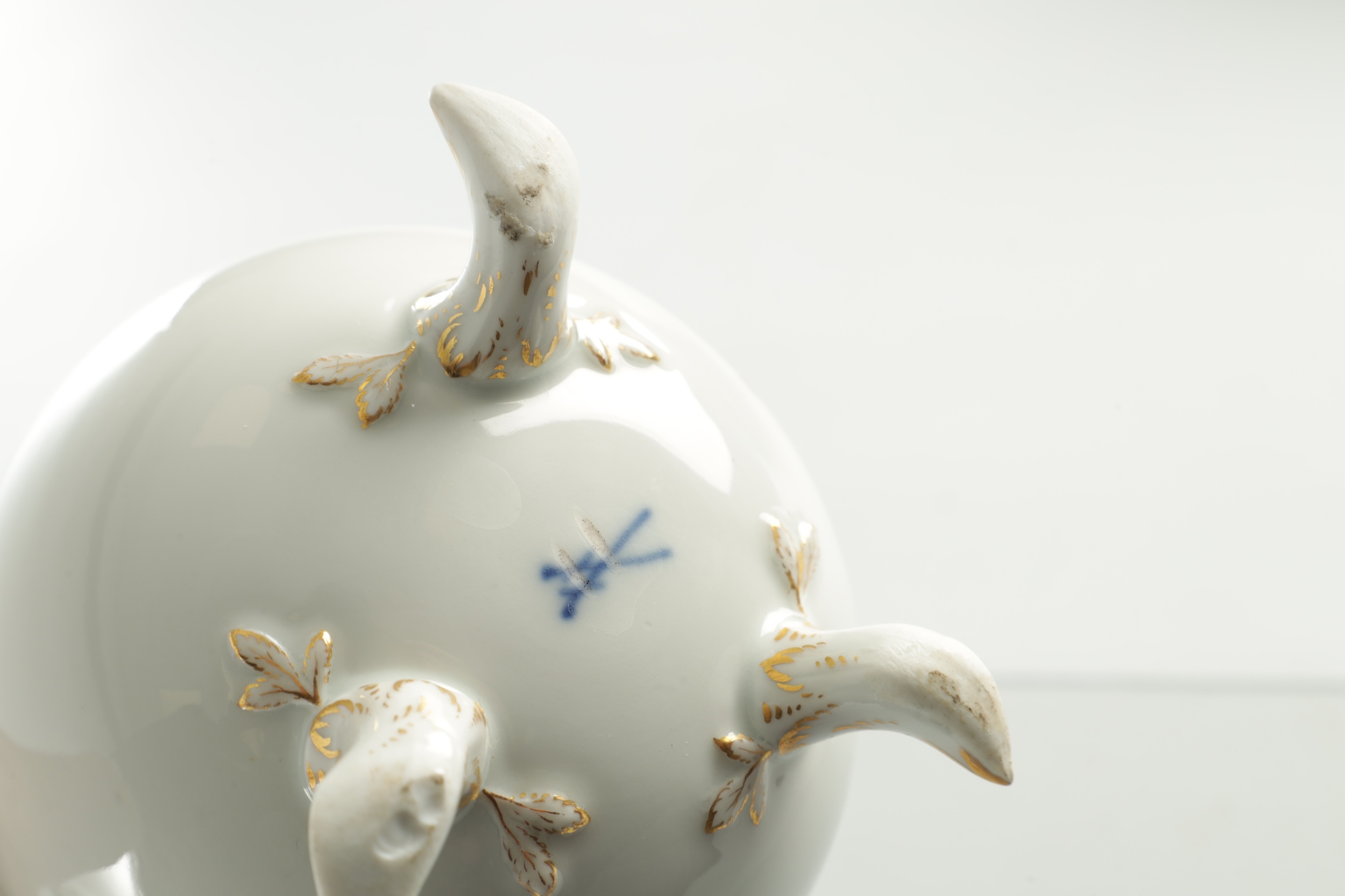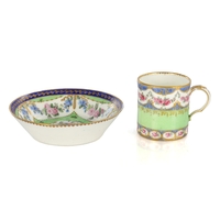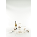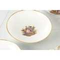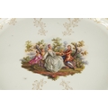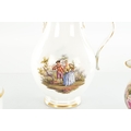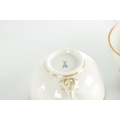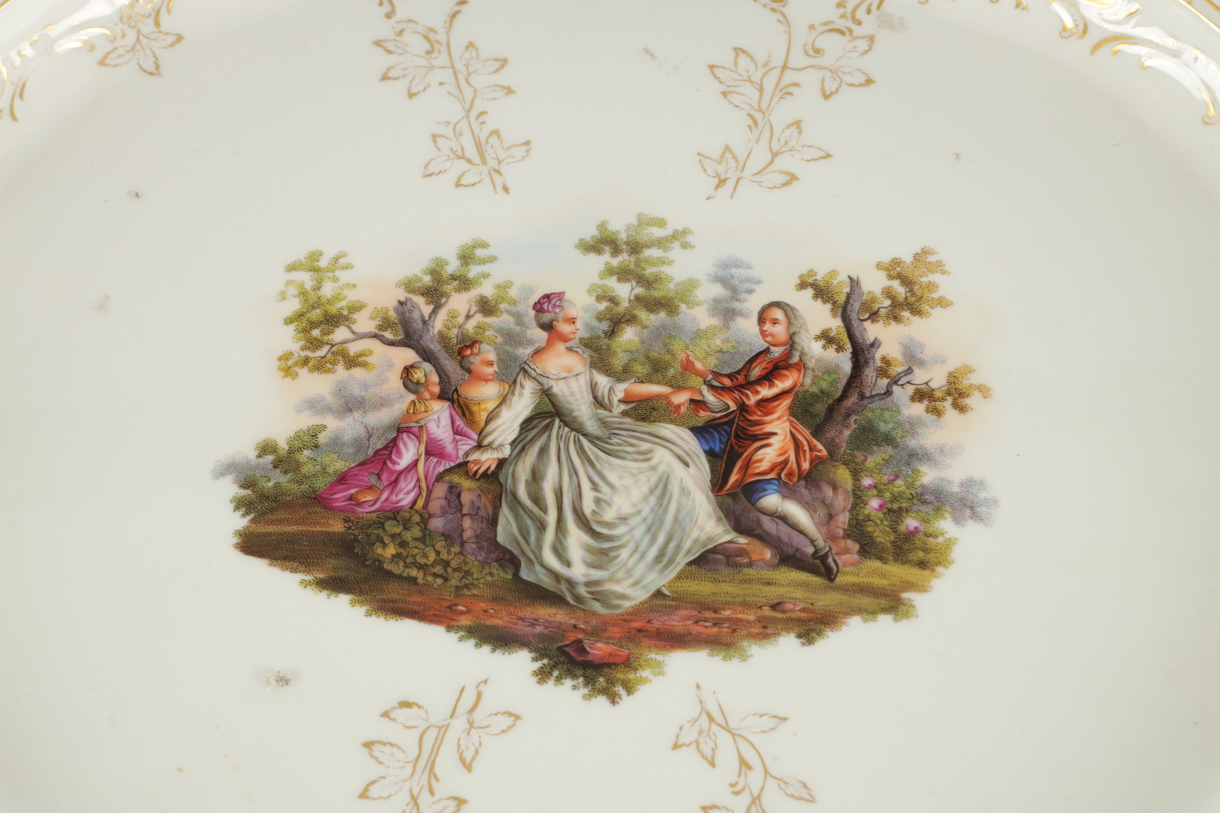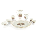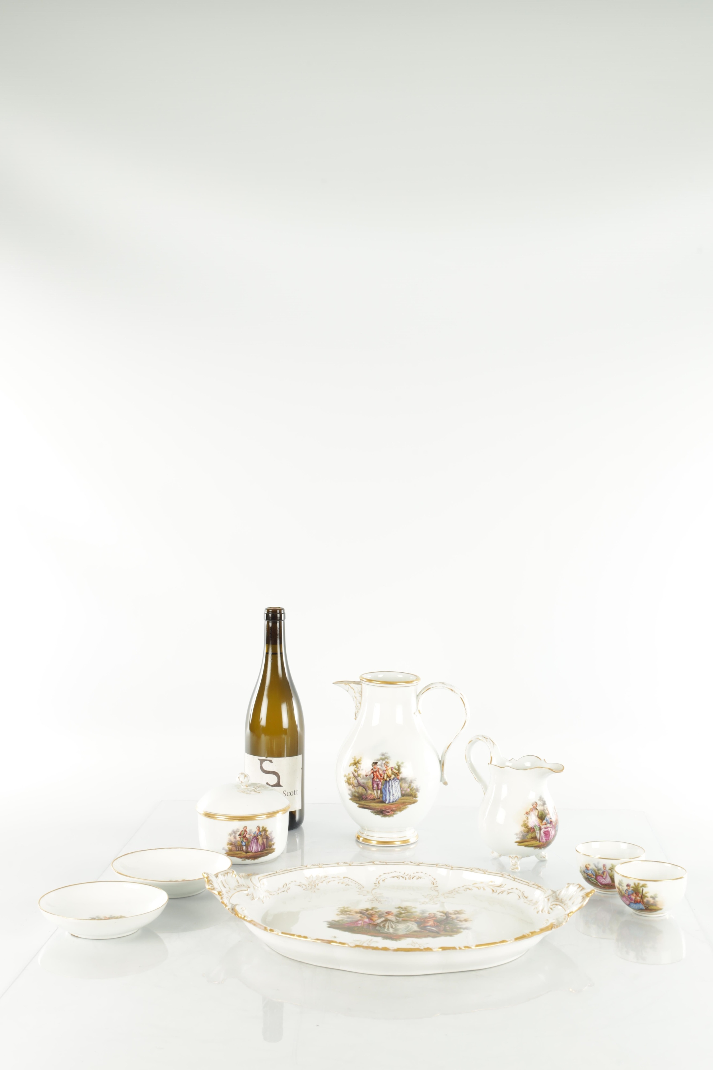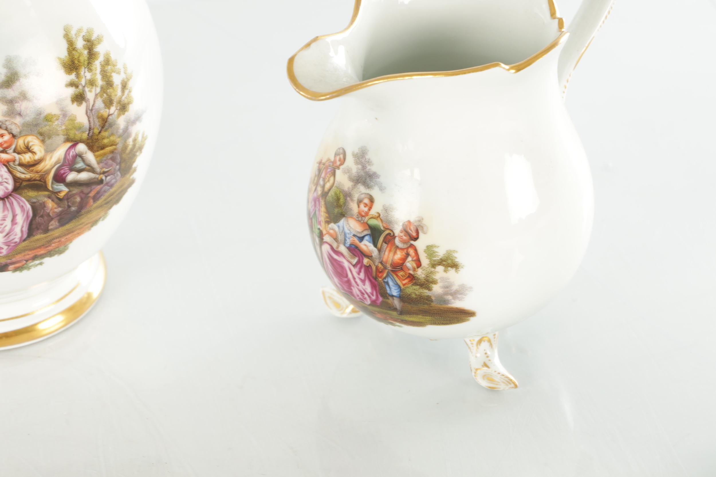 AN EARLY 20TH CENTURY MEISSEN PORCELAIN TETE A TETE SET with classical figural panels and gilt edge decoration comprising of a coffee can, two cups and saucers, milk jug, lidded sugar bowl and tray (tray 43cm wide )
