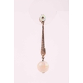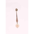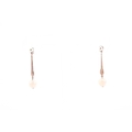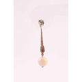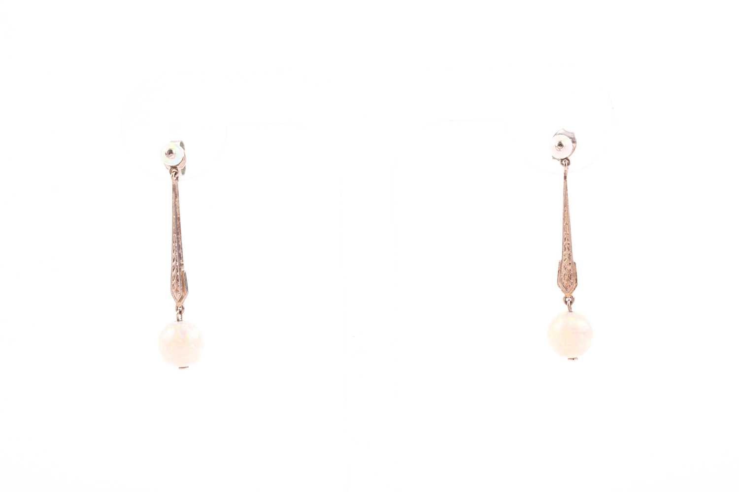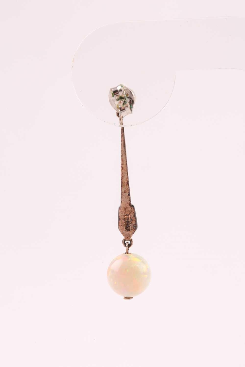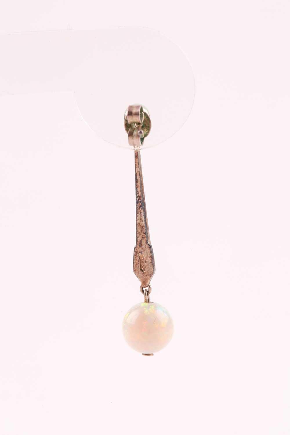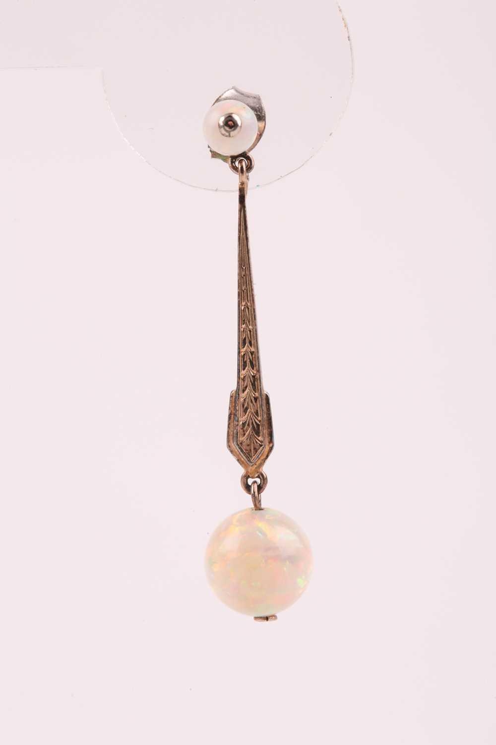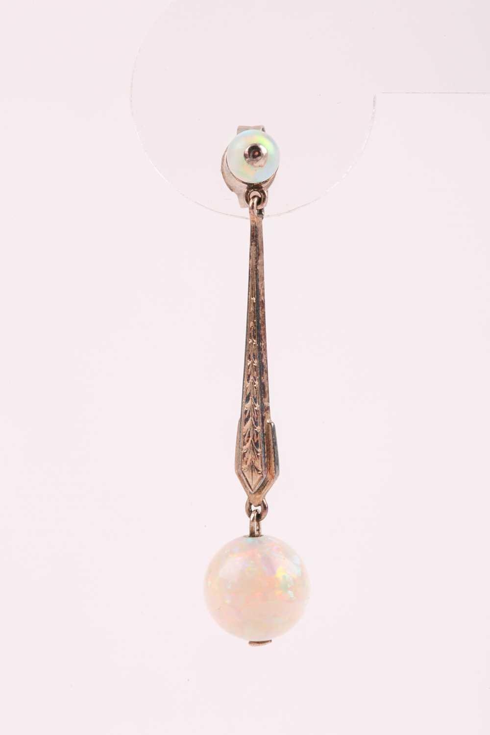 A pair of 18ct gold and opal drop earrings, each suspended with a round opal bead, approximately 8 mm, suspended from a tapered engraved segment, marked 18ct to verso, and surmounted with a drilled opal bead, earrings 3.7 cm long, 3.6 grams.