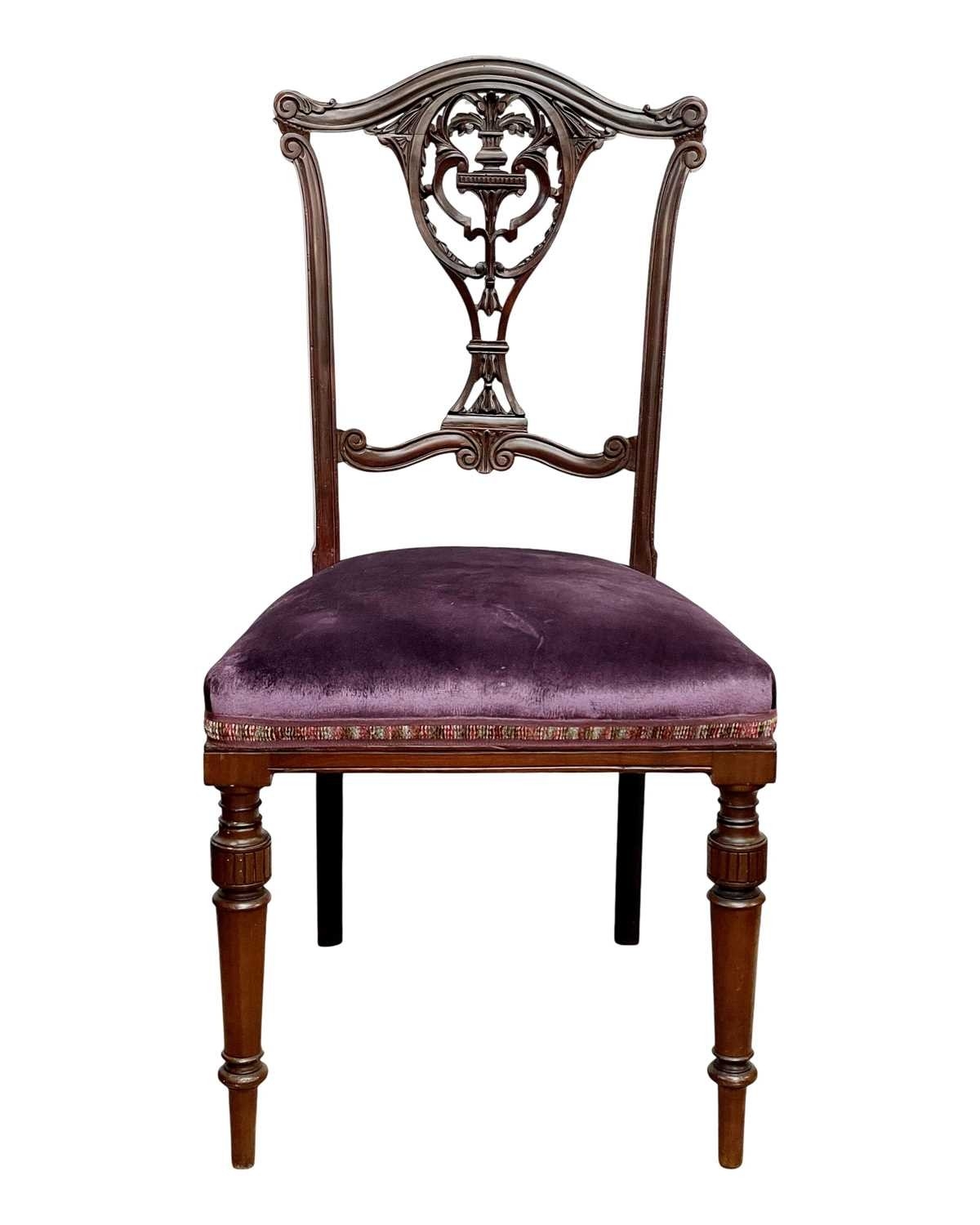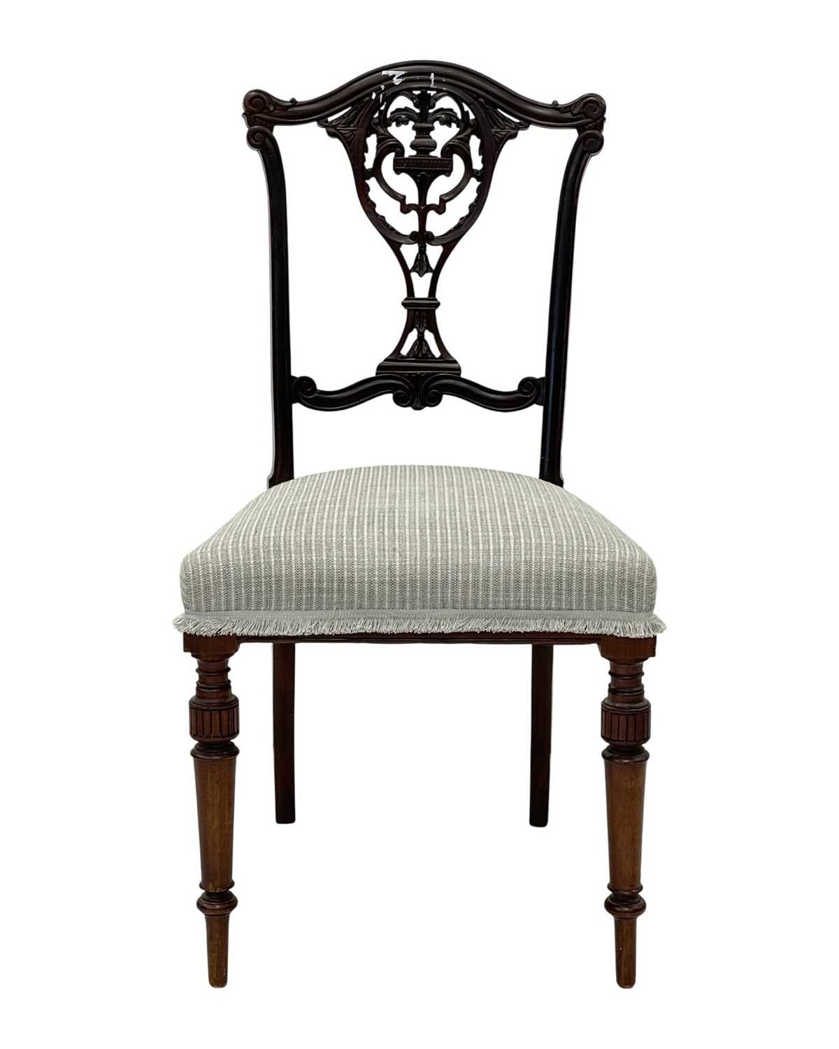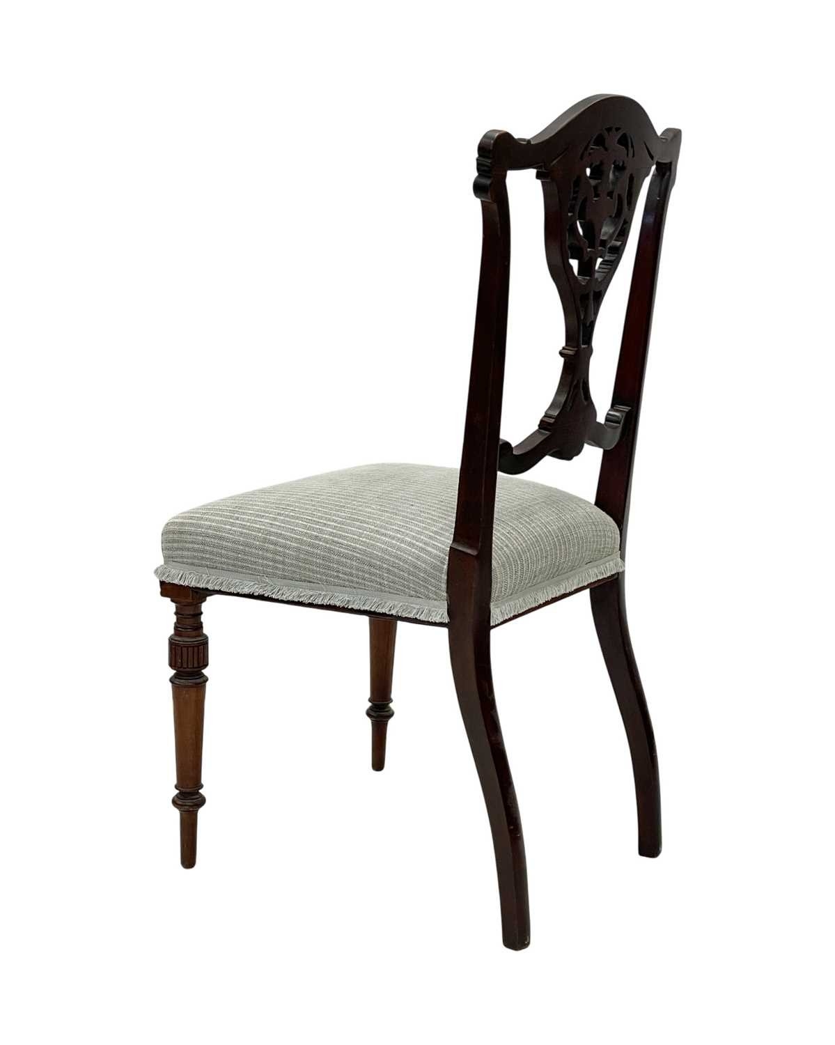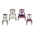 An Edwardian mahogany part salon suite. Comprising two armchairs and two single chairs, with pierced and carved rails, on turned front legs (4).