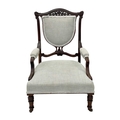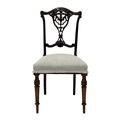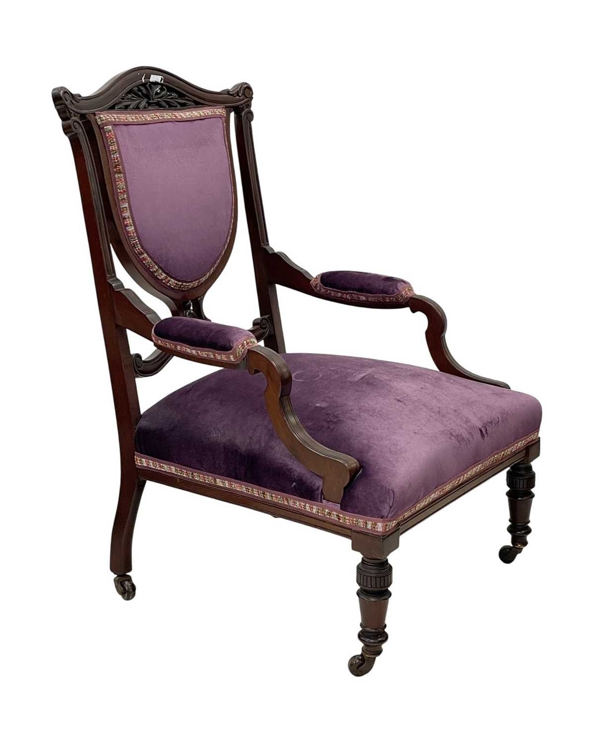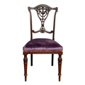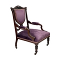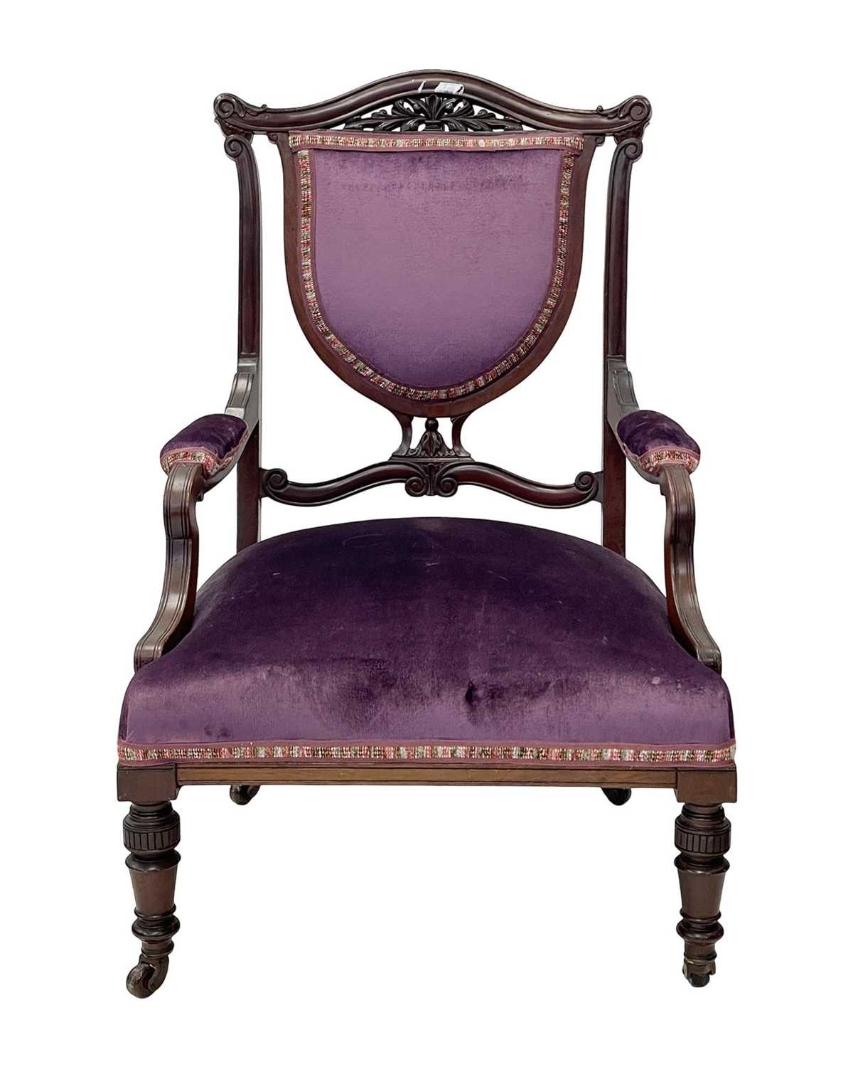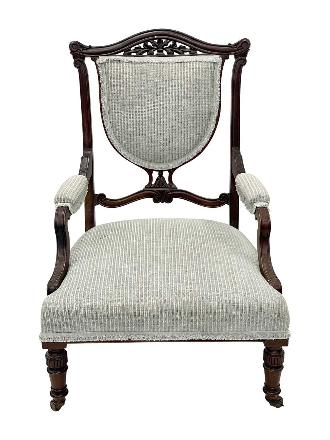 An Edwardian mahogany part salon suite. Comprising two armchairs and two single chairs, with pierced and carved rails, on turned front legs (4).