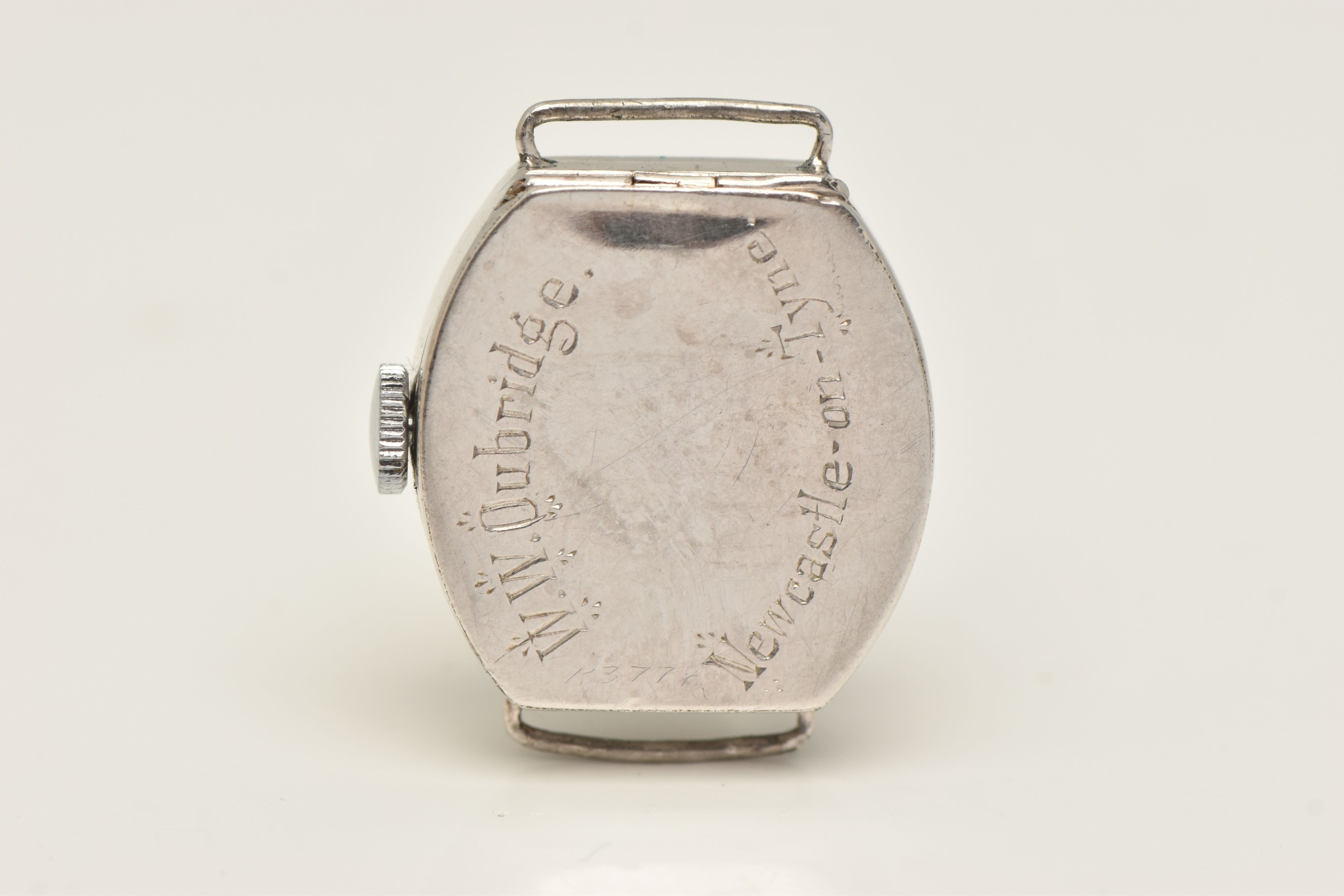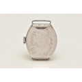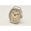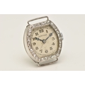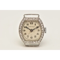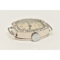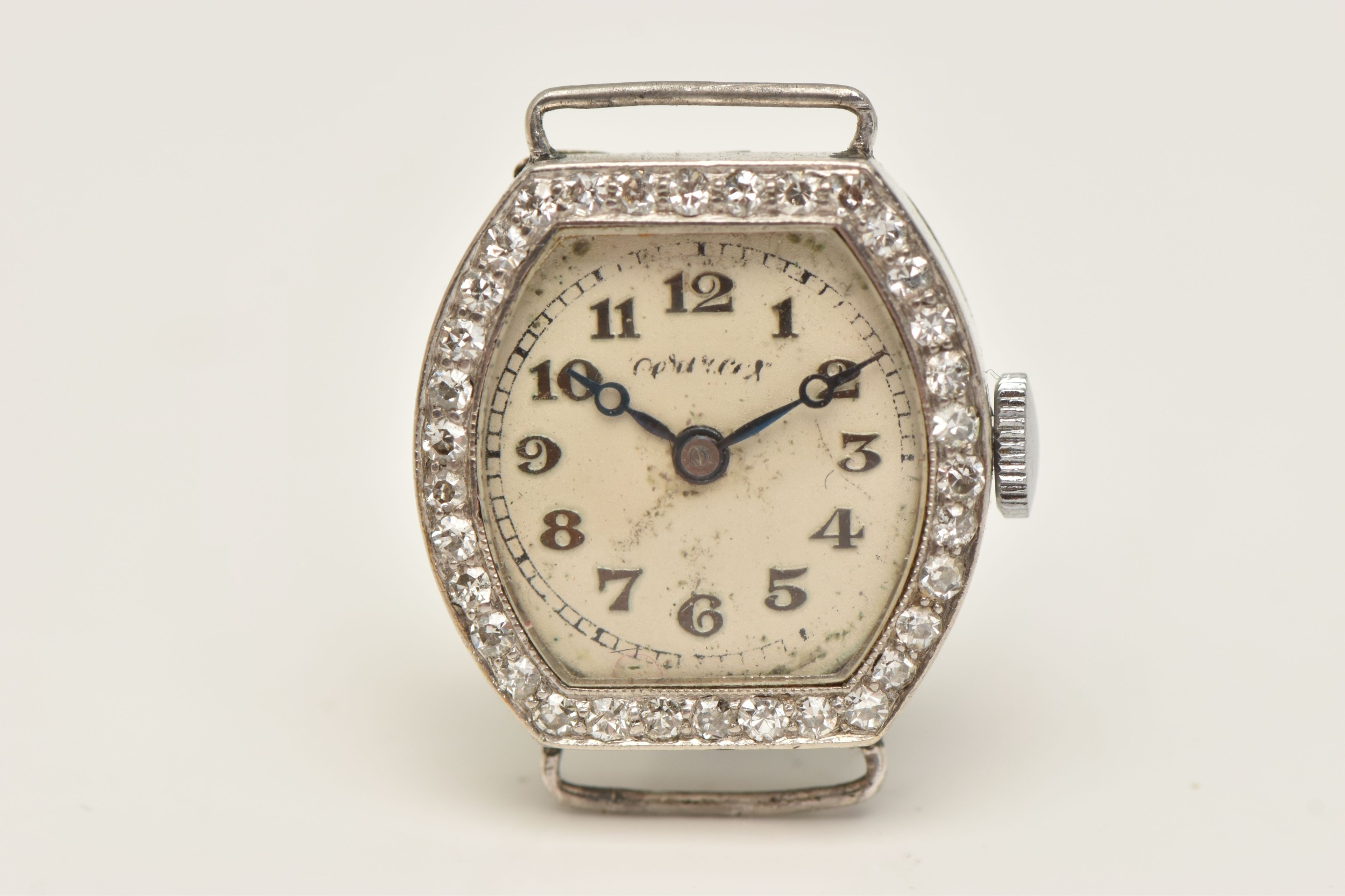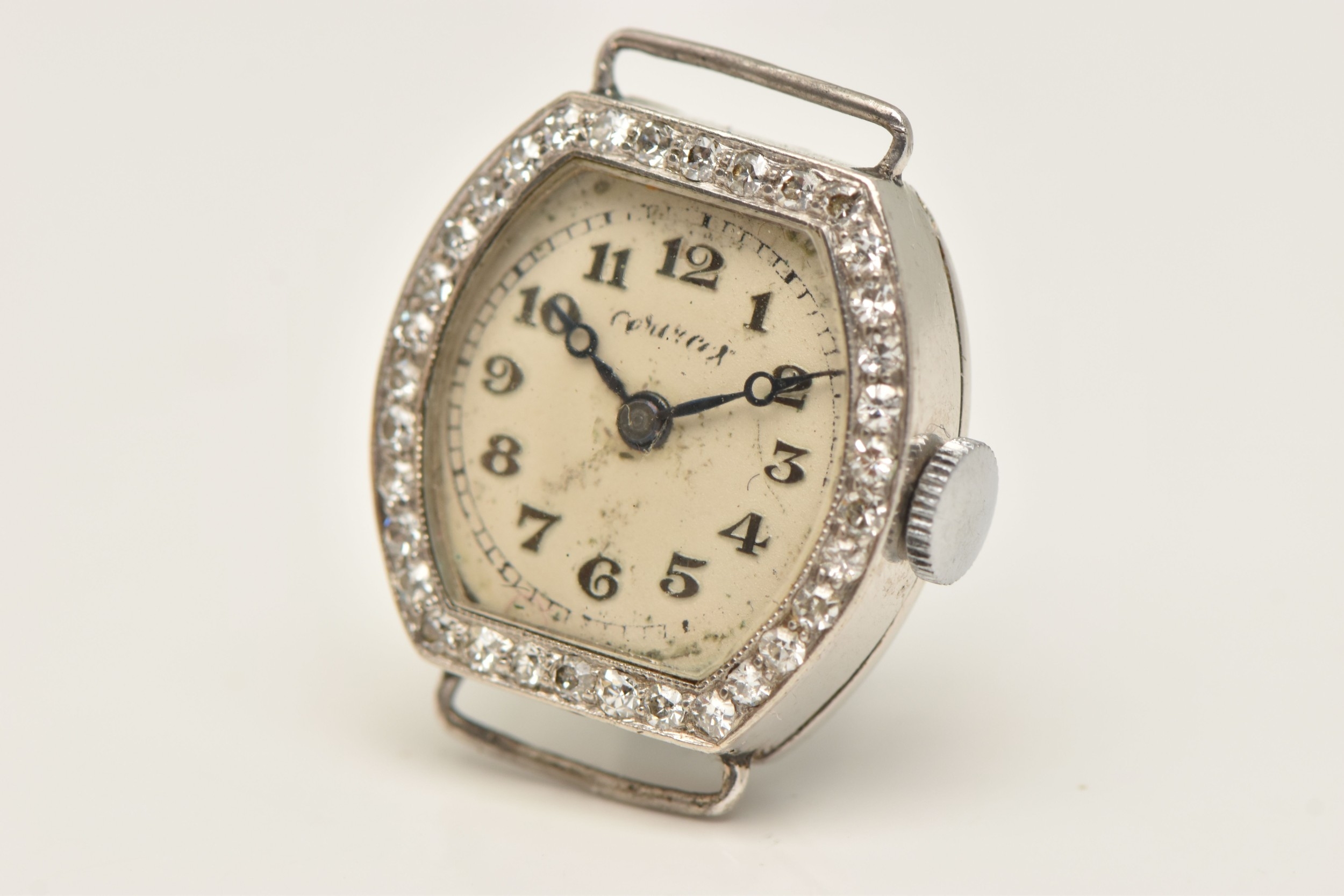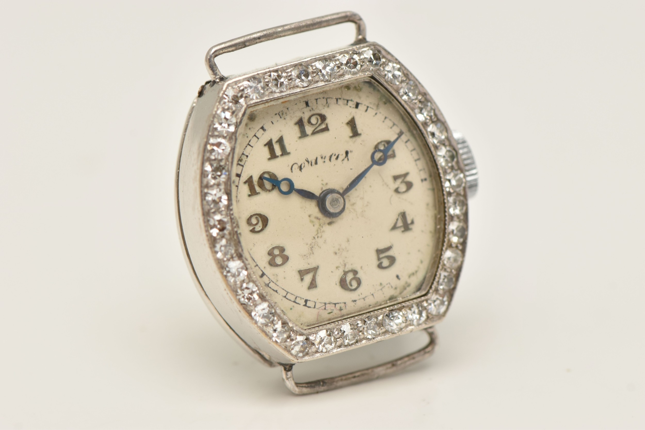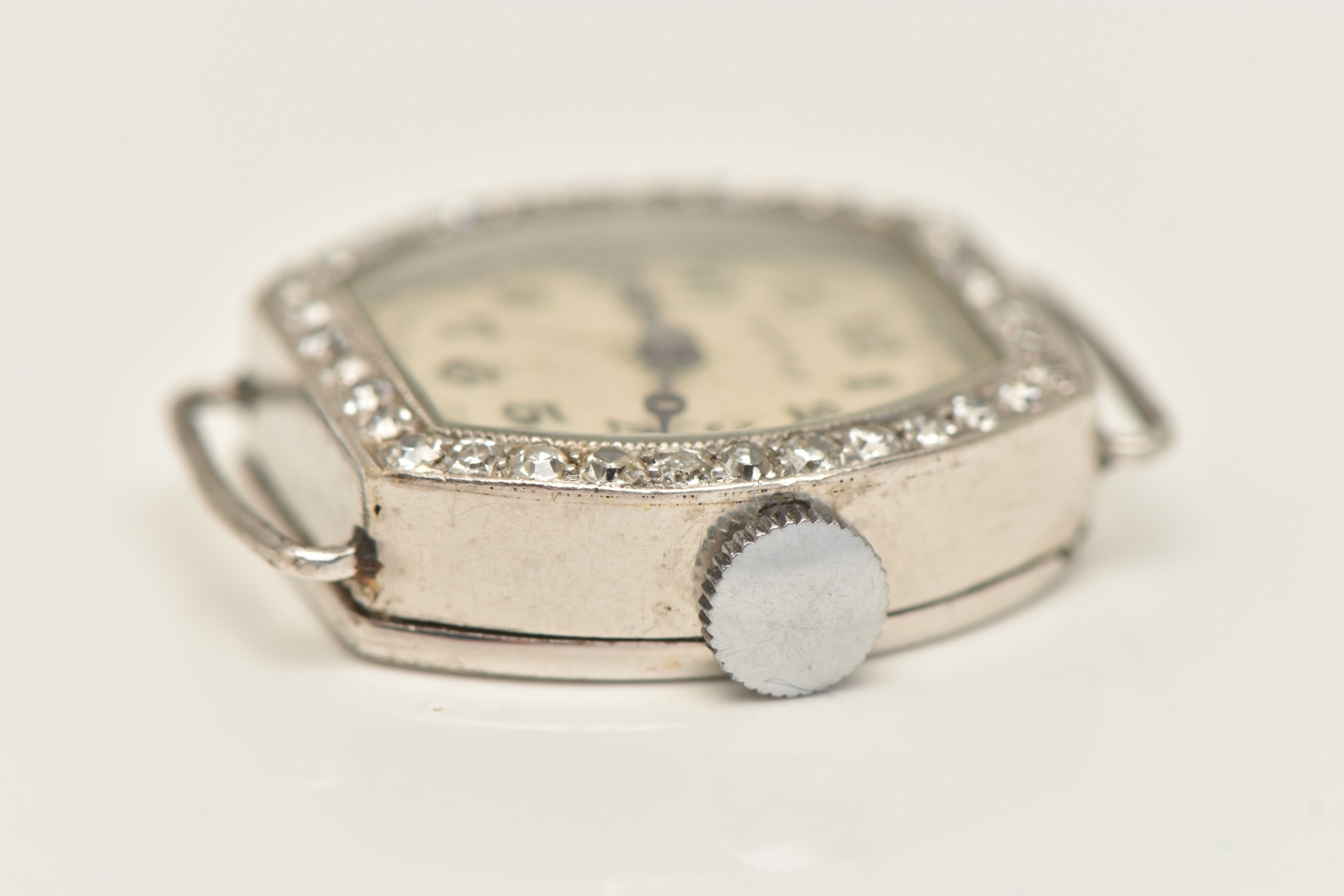 A DIAMOND SET WATCH HEAD, hand wound movement, rounded square dial signed 'Services', Arabic numerals, white metal case, approximate case width 19mm, thirty four single cut diamonds grain set to the bezel with milgrain detail, case back engraved 'W.W. Oxbridge Newcastle on Tyne', inside case back stamped Platine (platinum) with a Swiss control mark, movement signed 'Services Watch Co Ltd' approximate gross weight 11.5 grams, (condition report: general moderate wear, watch winds but does not run, we cannot guarantee the working condition of the watch, all diamonds are intact)