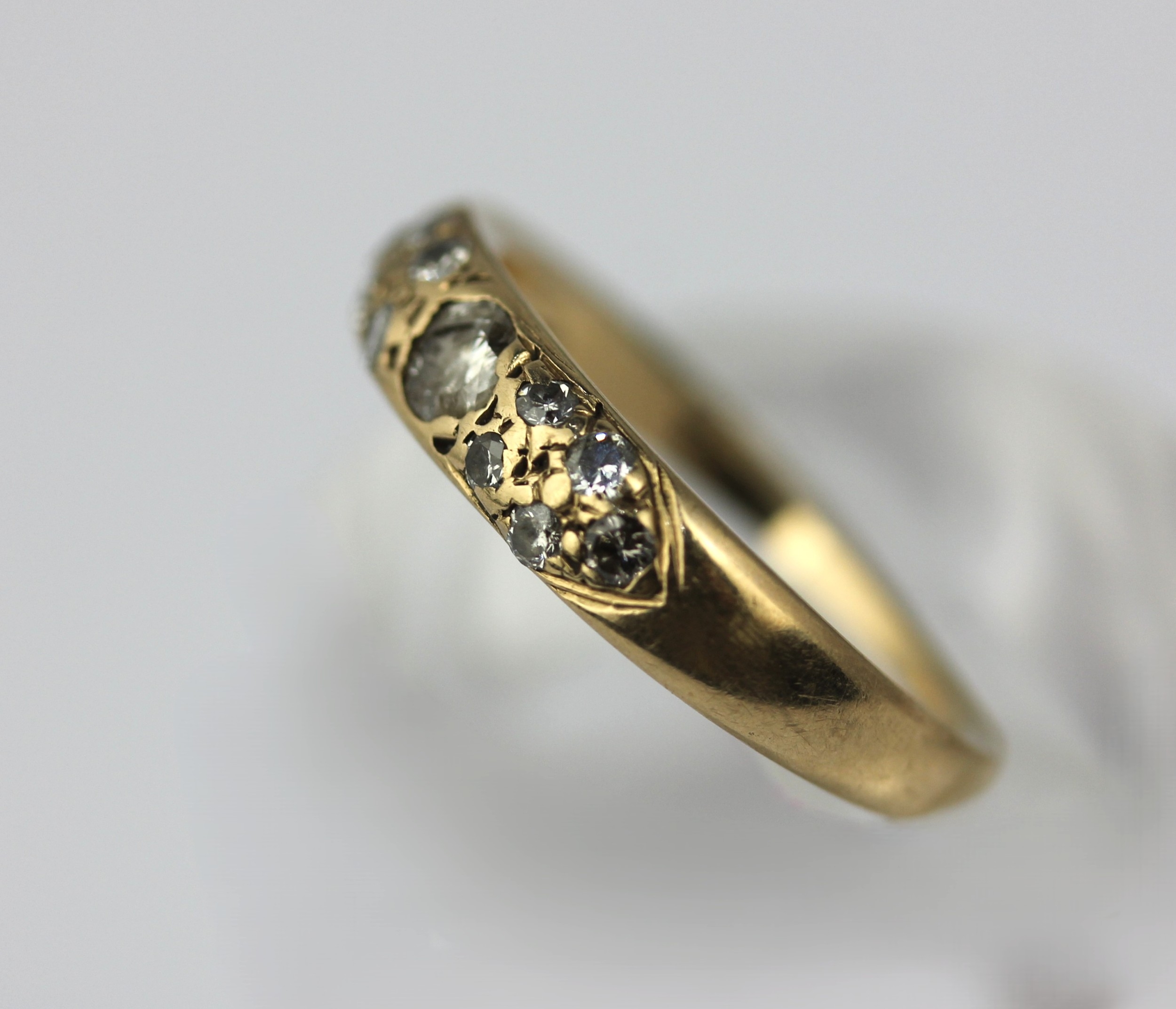 A gold and diamond ring set with the principal circular cut diamond at the centre, detailed '9ct', size K 1/2, gross weight 2.7g