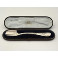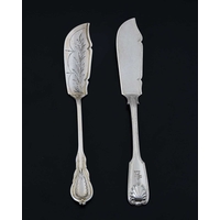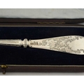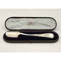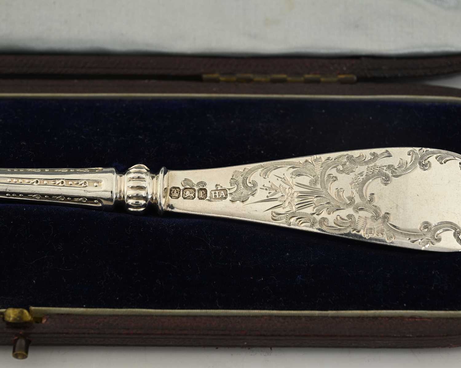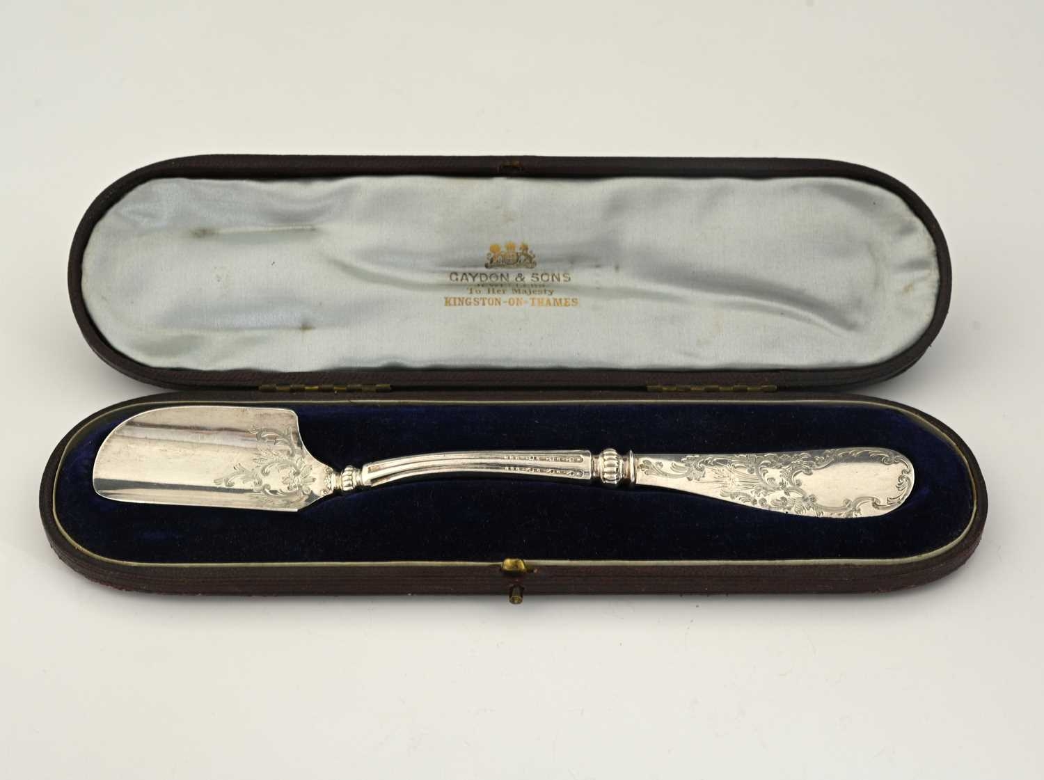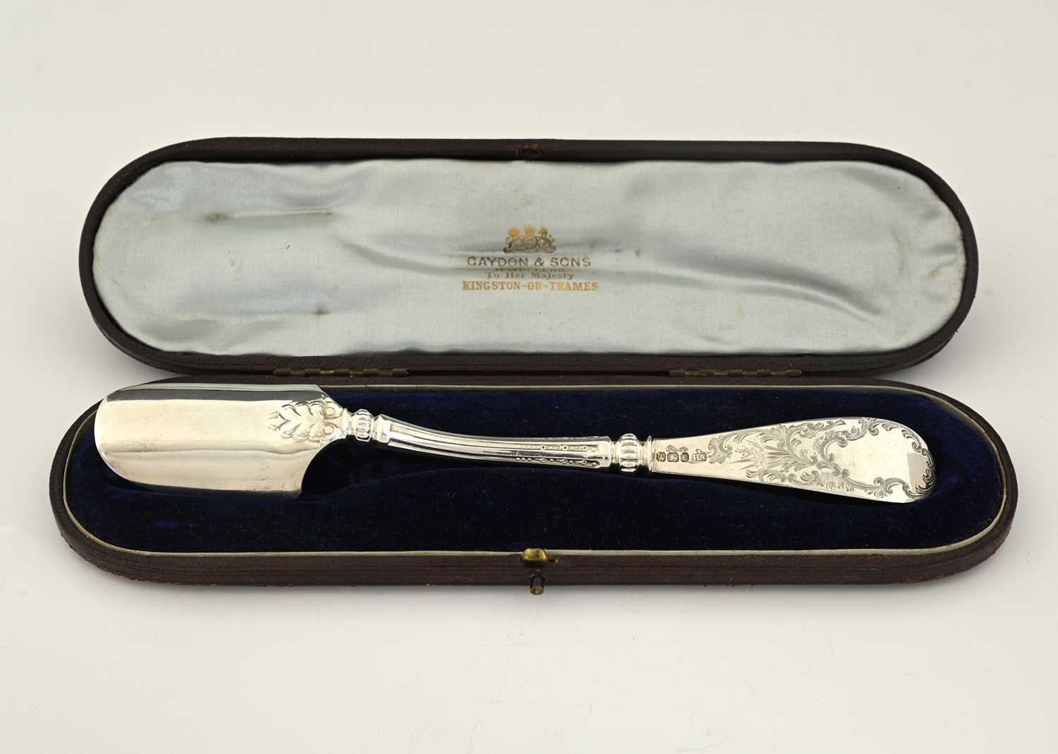 A late Victorian silver cheese scoop, with shaped ribbed stem and foliate engraved decoration, Henry Atkin, Sheffield 1900, fitted in the original case with retailer's name, 'Gaydon & Sons, Jewellers to Her Majesty, Kingston-on-Thames', length 20.2cm, weight (sans case) 75g/2.41ozt approx