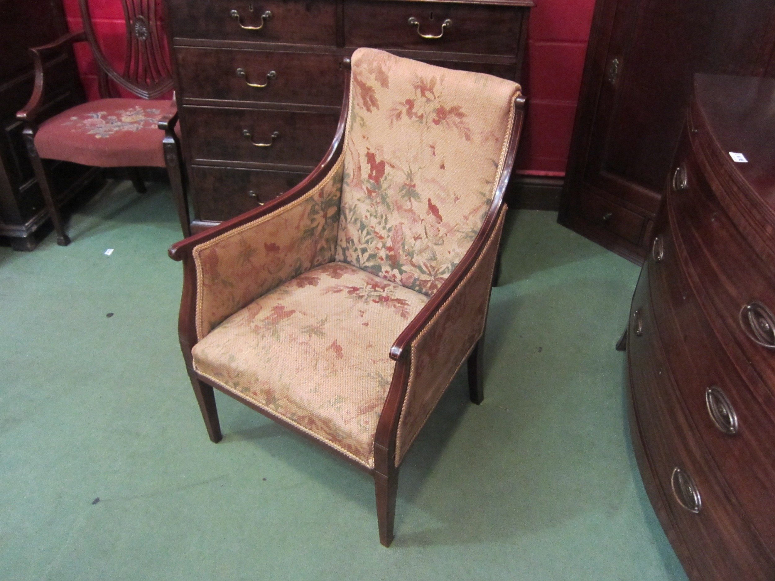 An Edwardian line inlaid mahogany armchair on square tapering fore legs (R) £50