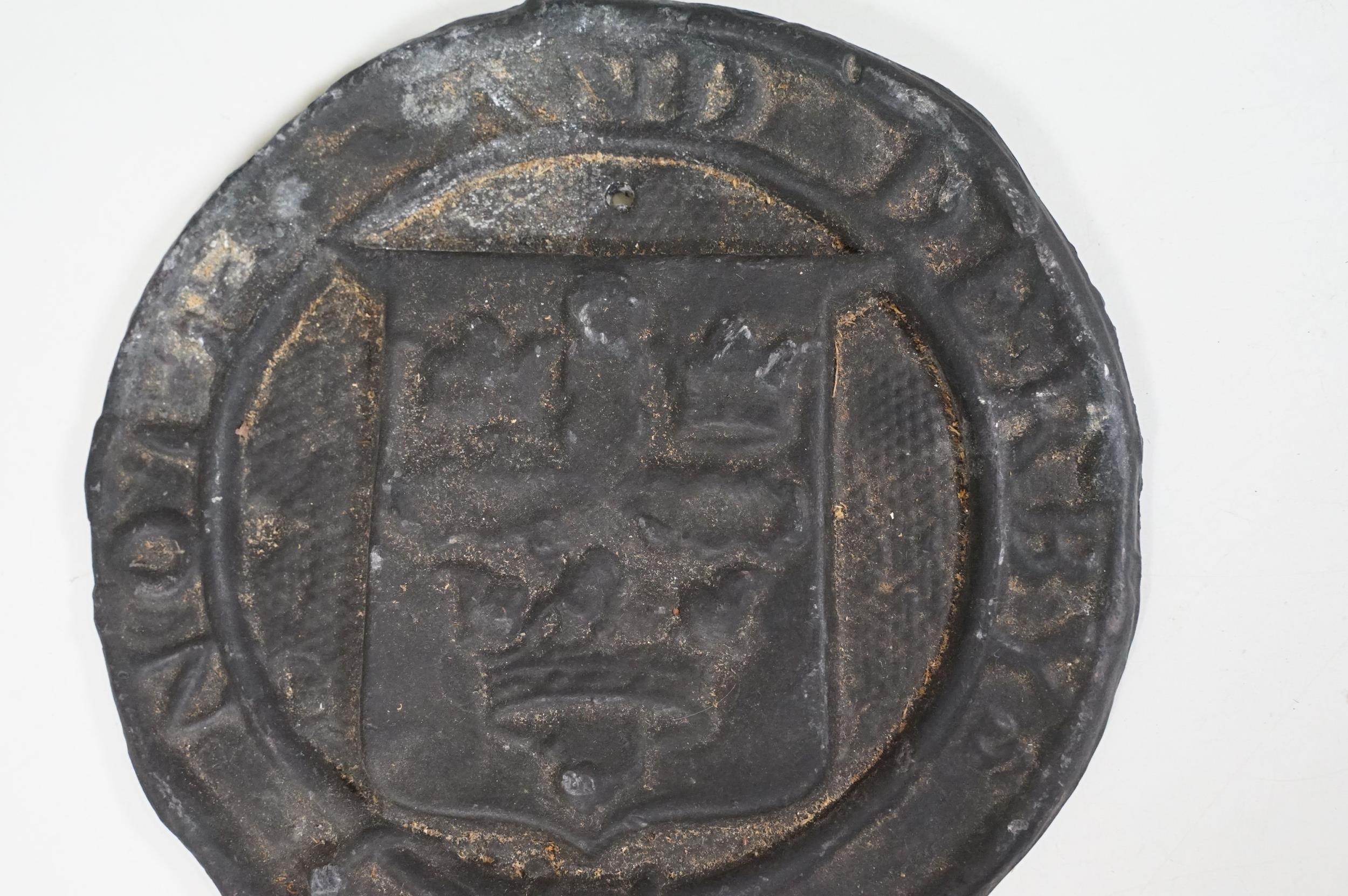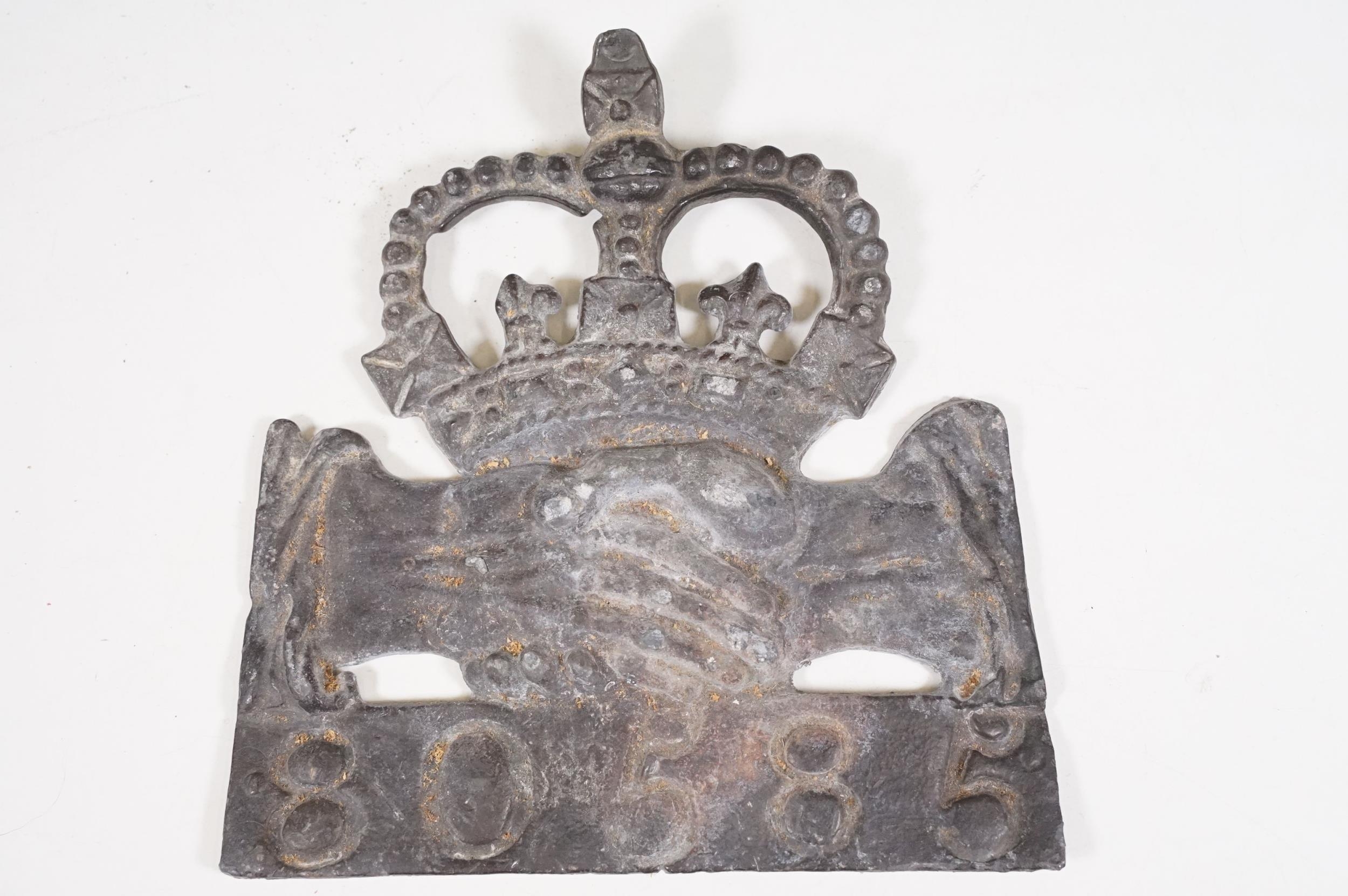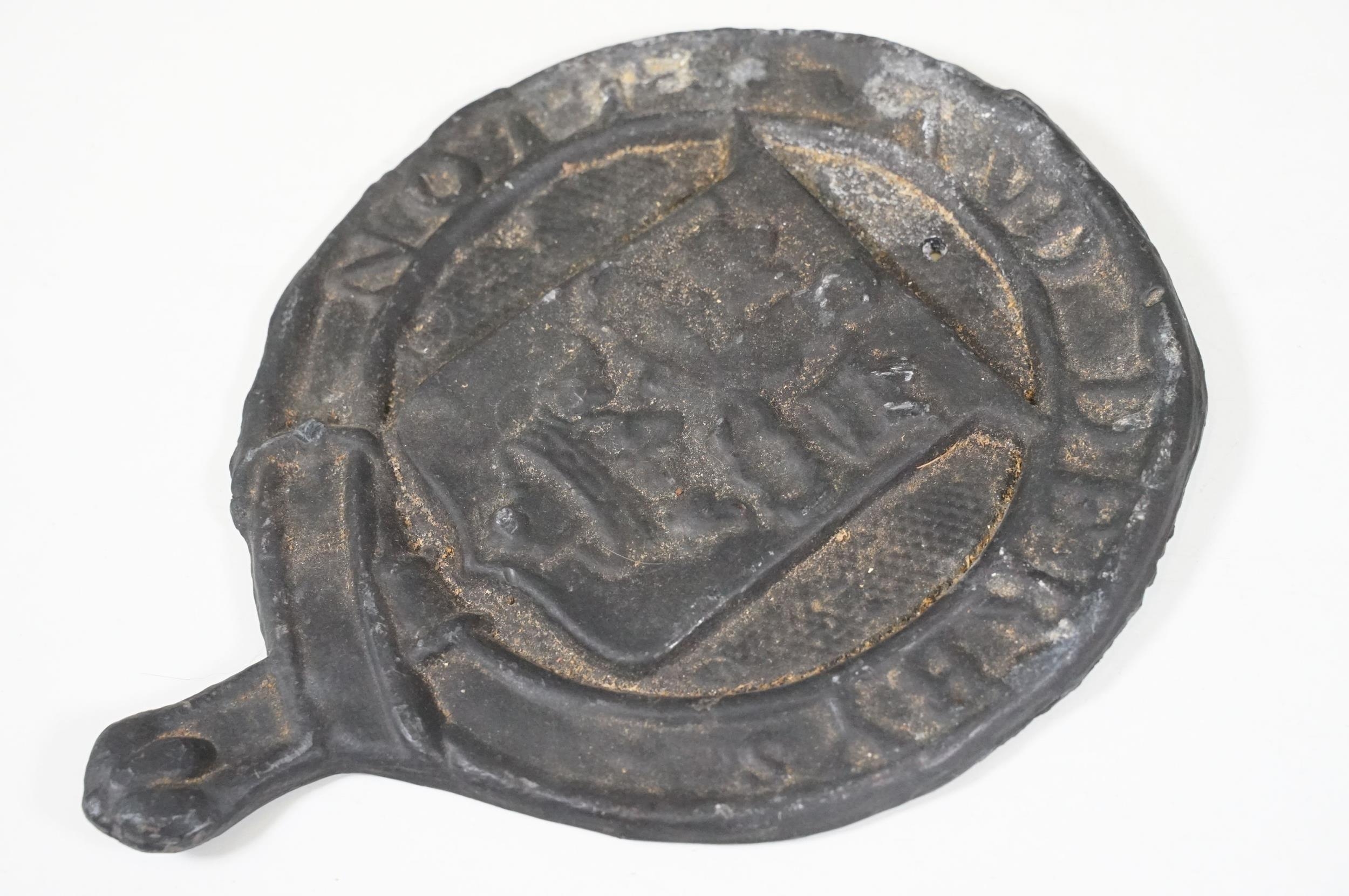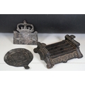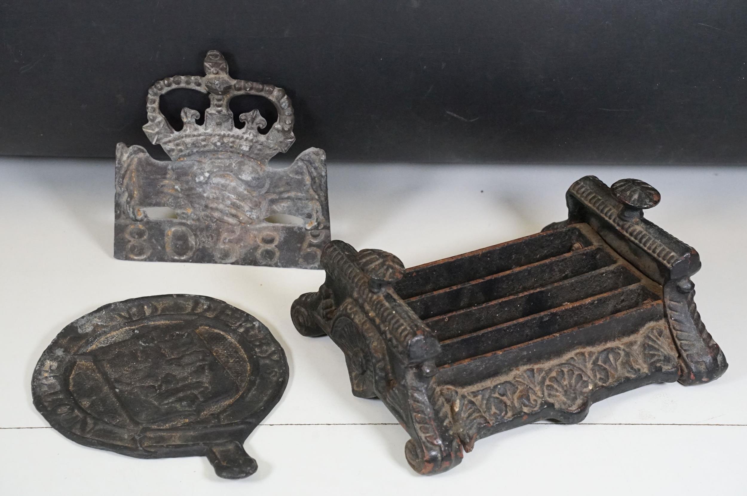 Cast iron collectables to include boot scraper, fire insurance mark plaque '80585' and Notts And Derby fire plaque