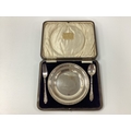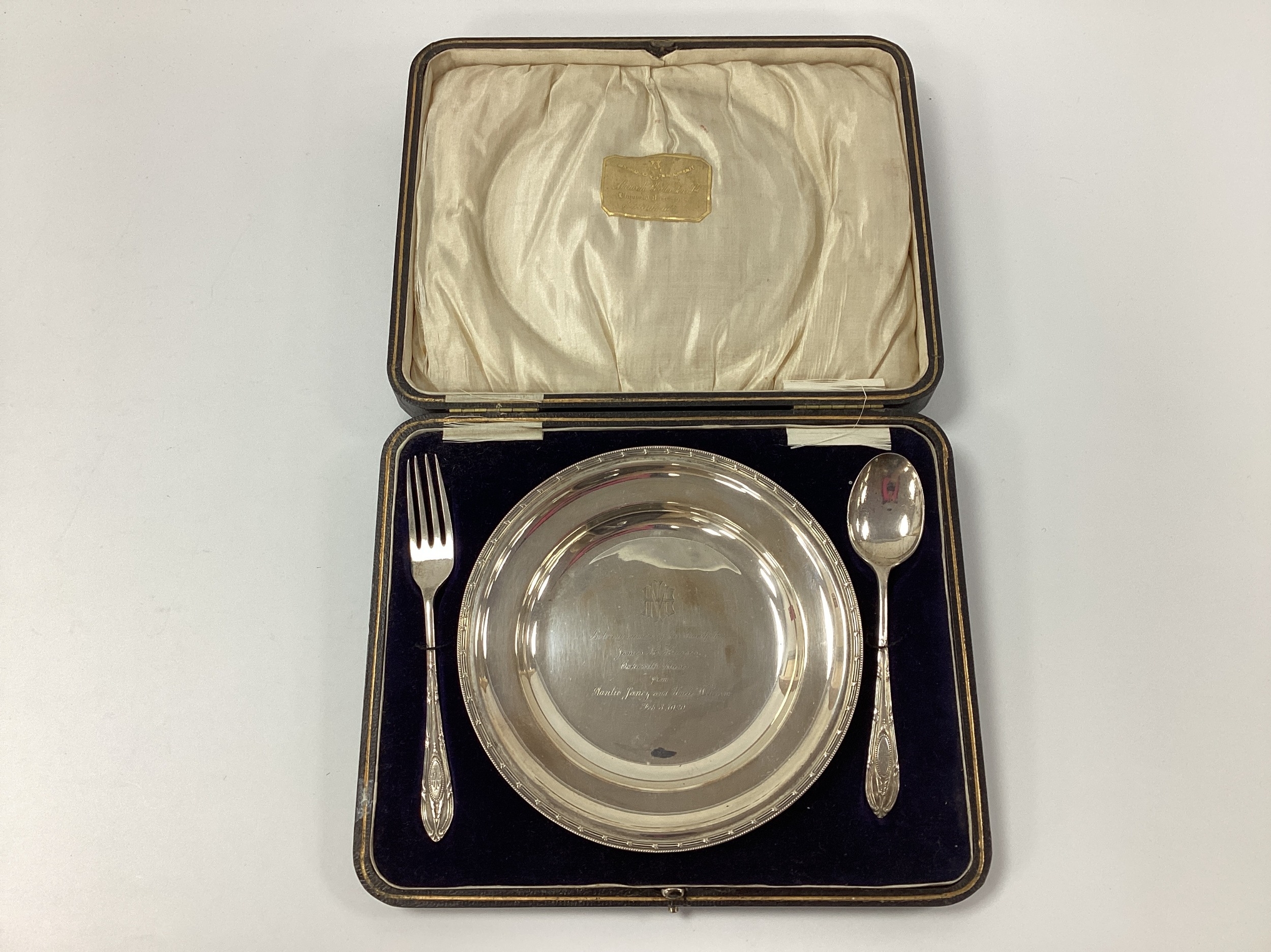 A Hallmarked Silver Presentation Dish, Ackroyd Rhodes, Sheffield 1913, inscribed "In Loving Memory of her Grandfather James H Haggas, Oakworth Manor, from Auntie Jancy and Uncle William Feb 8, 1920", within ribbon and reed border, 16cm diameter, together with a child's hallmarked silver fork and spoon, Roberts & Belk, Sheffield 1917, contined in a Manoah Rhodes Bradford fitted case. Total silver weight 215grams