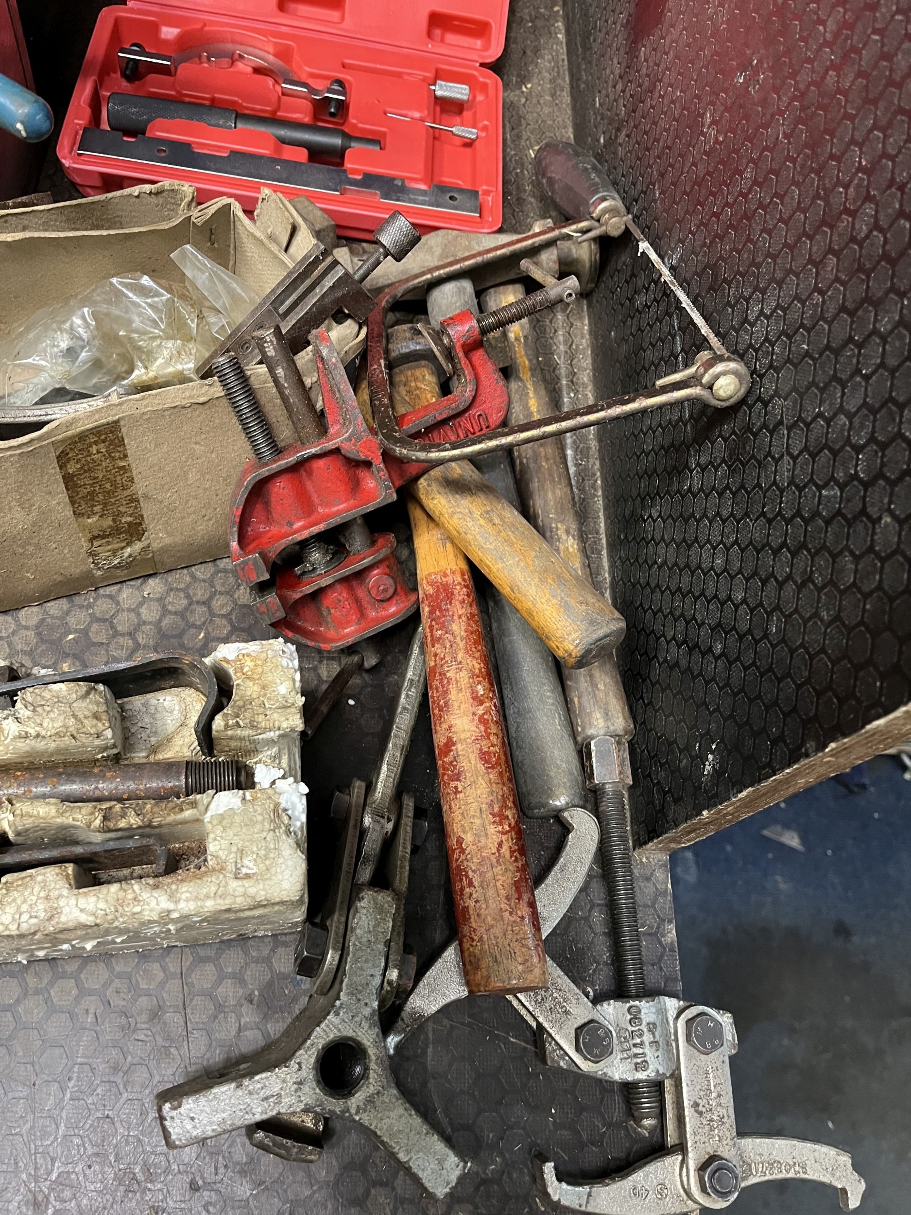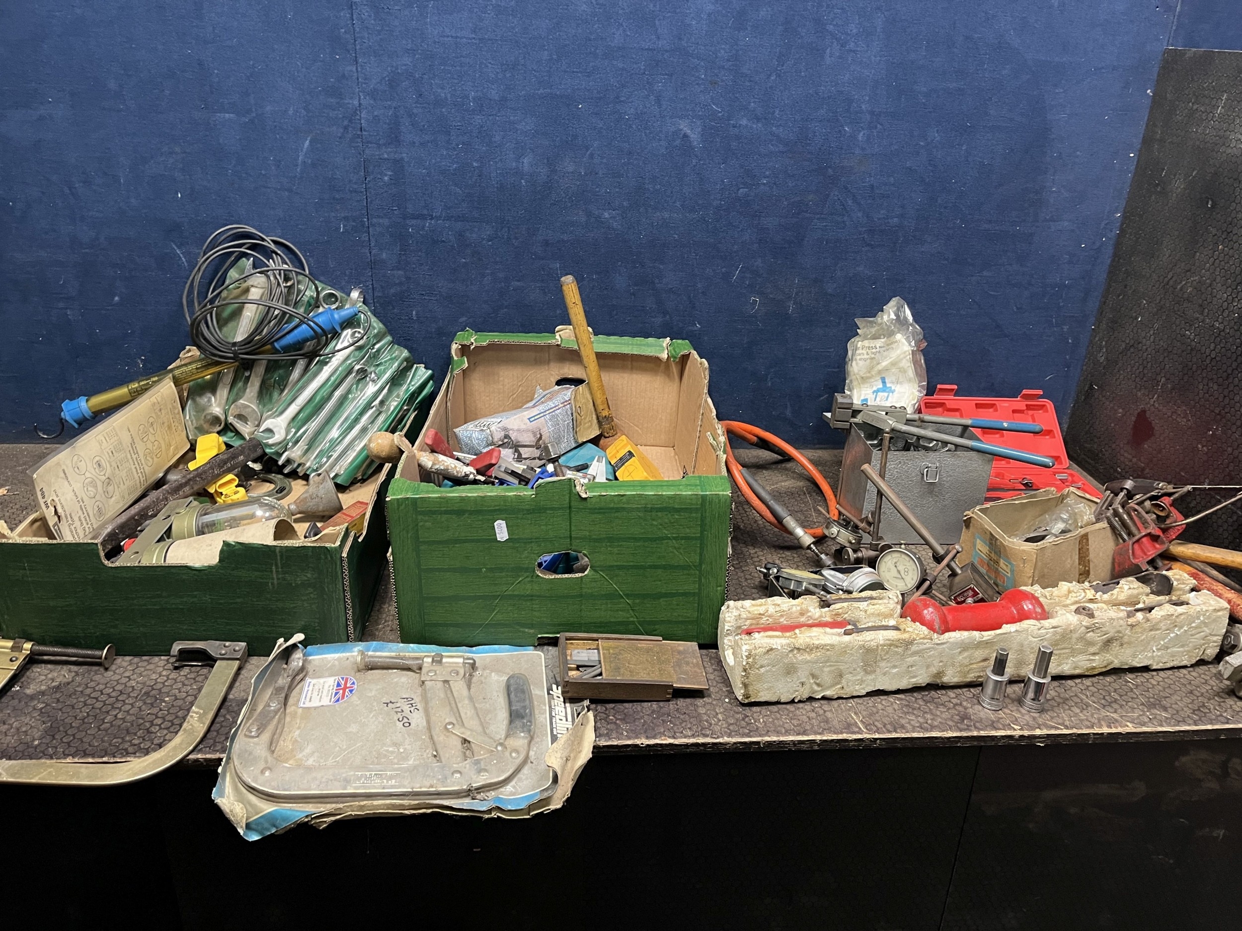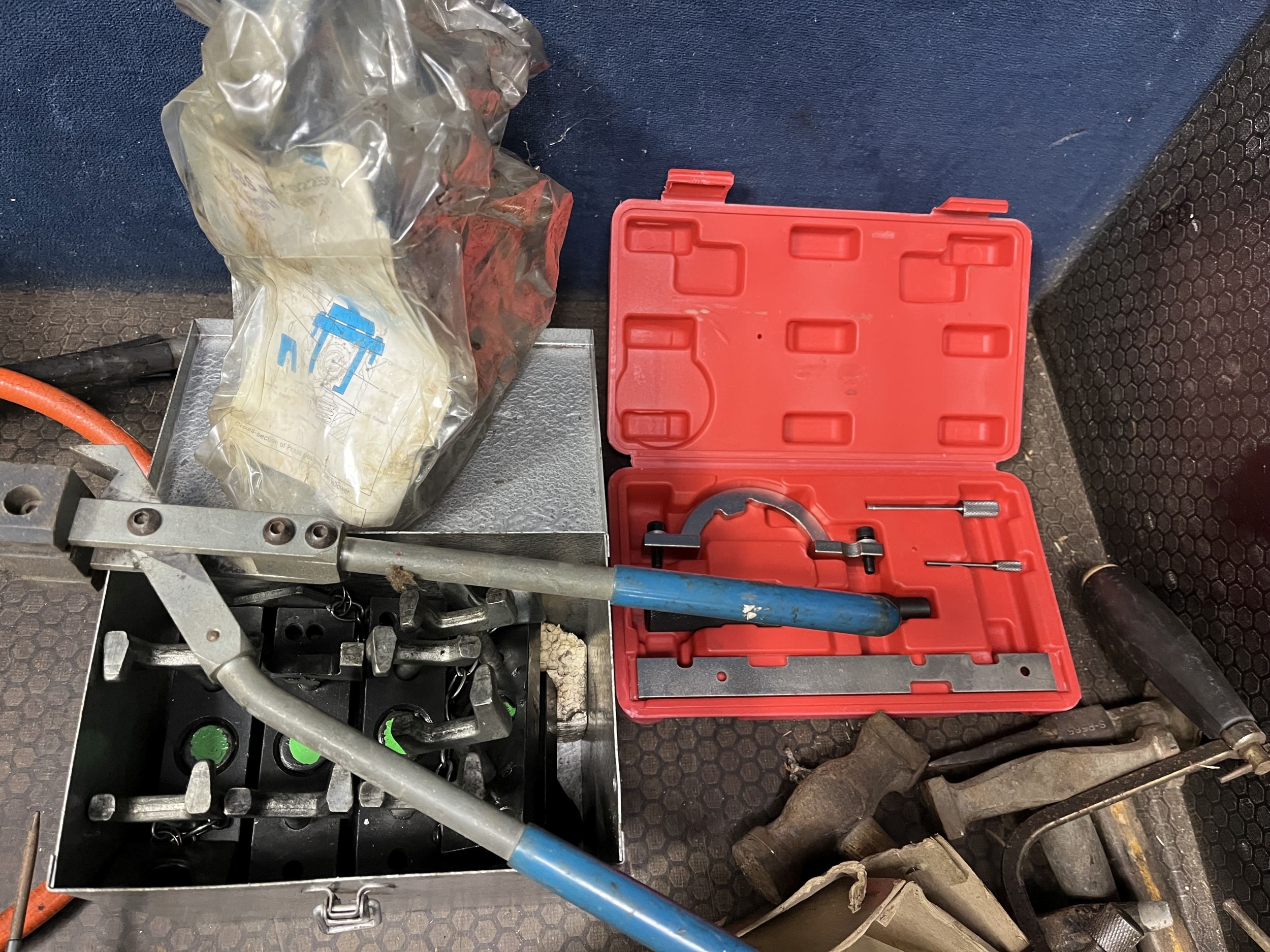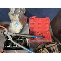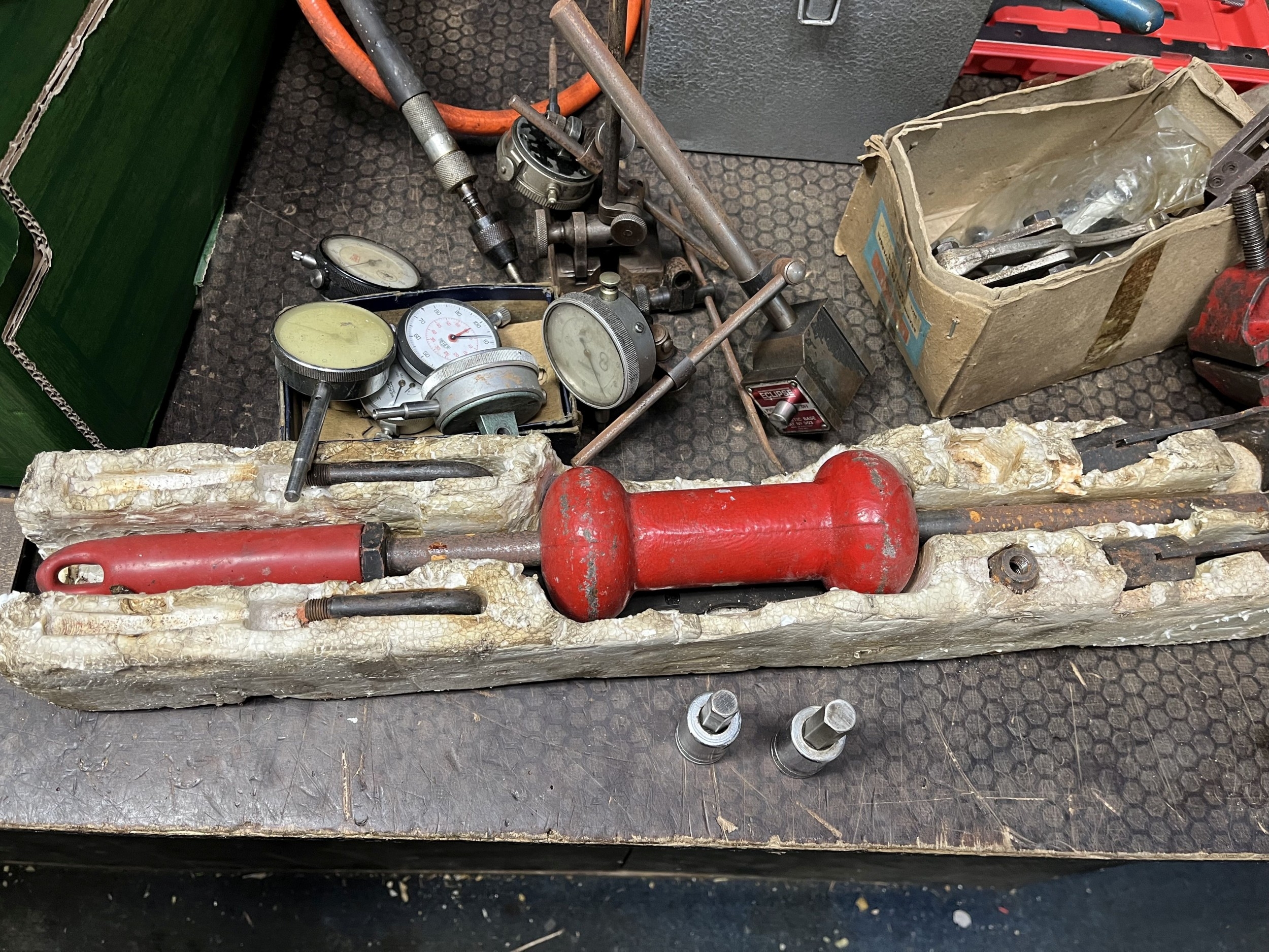 TWO TRAYS CONTAINING AUTOMOTIVE TOOLS, including two Snap-On Imperial Hex sockets, two valve spring compressors, a Pickavant Camshaft follower press set, a slide hammer, various marking stands and dial gauges, various micrometers, etc