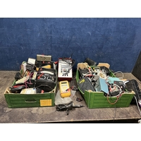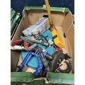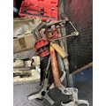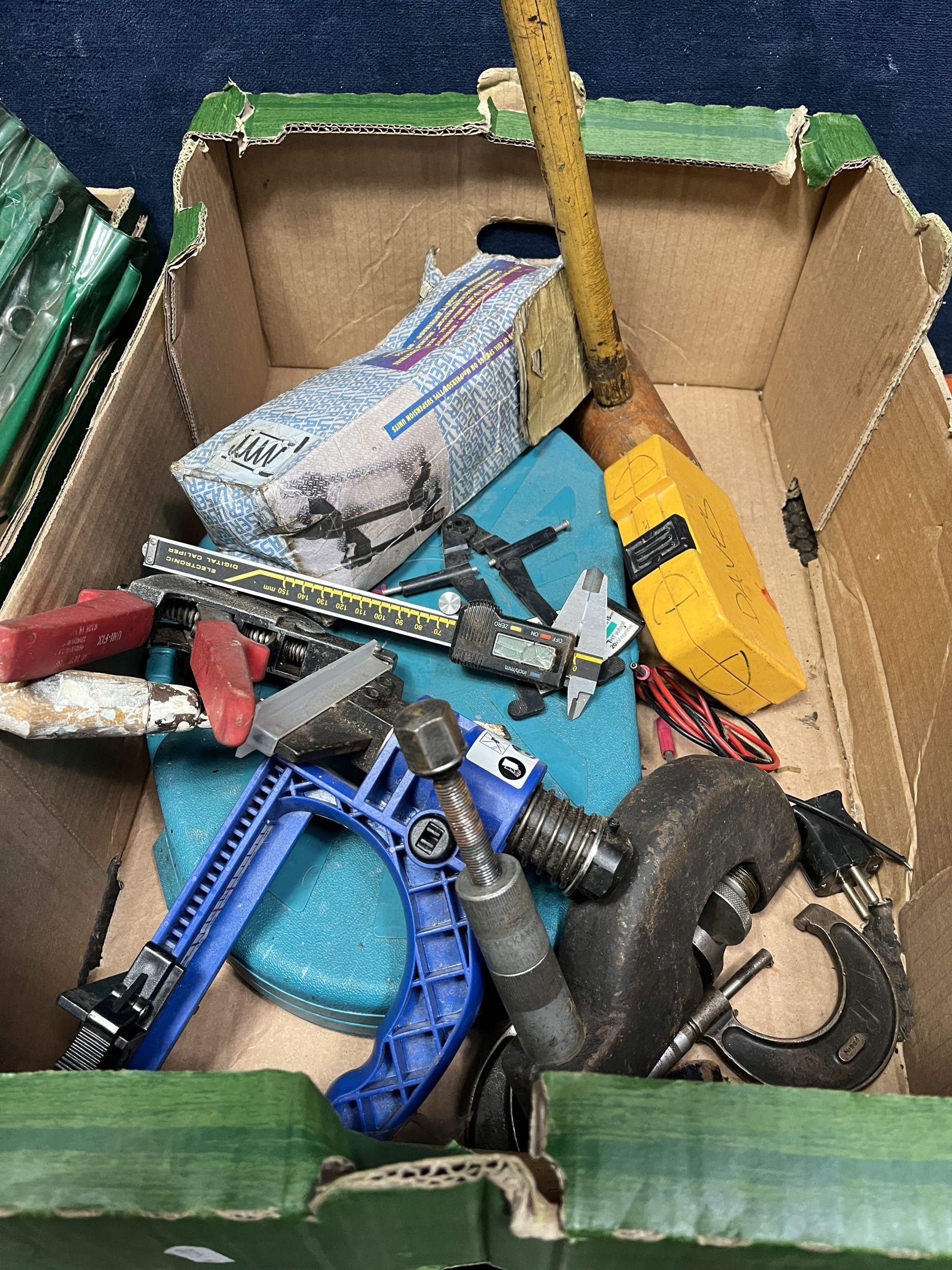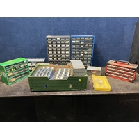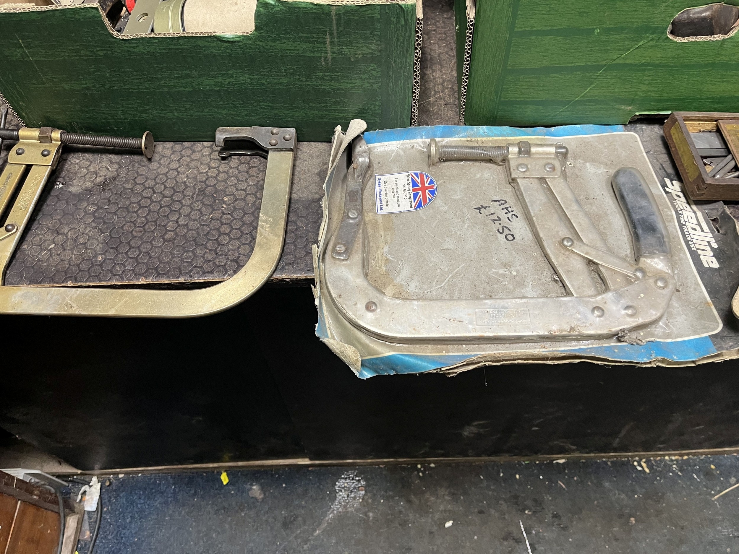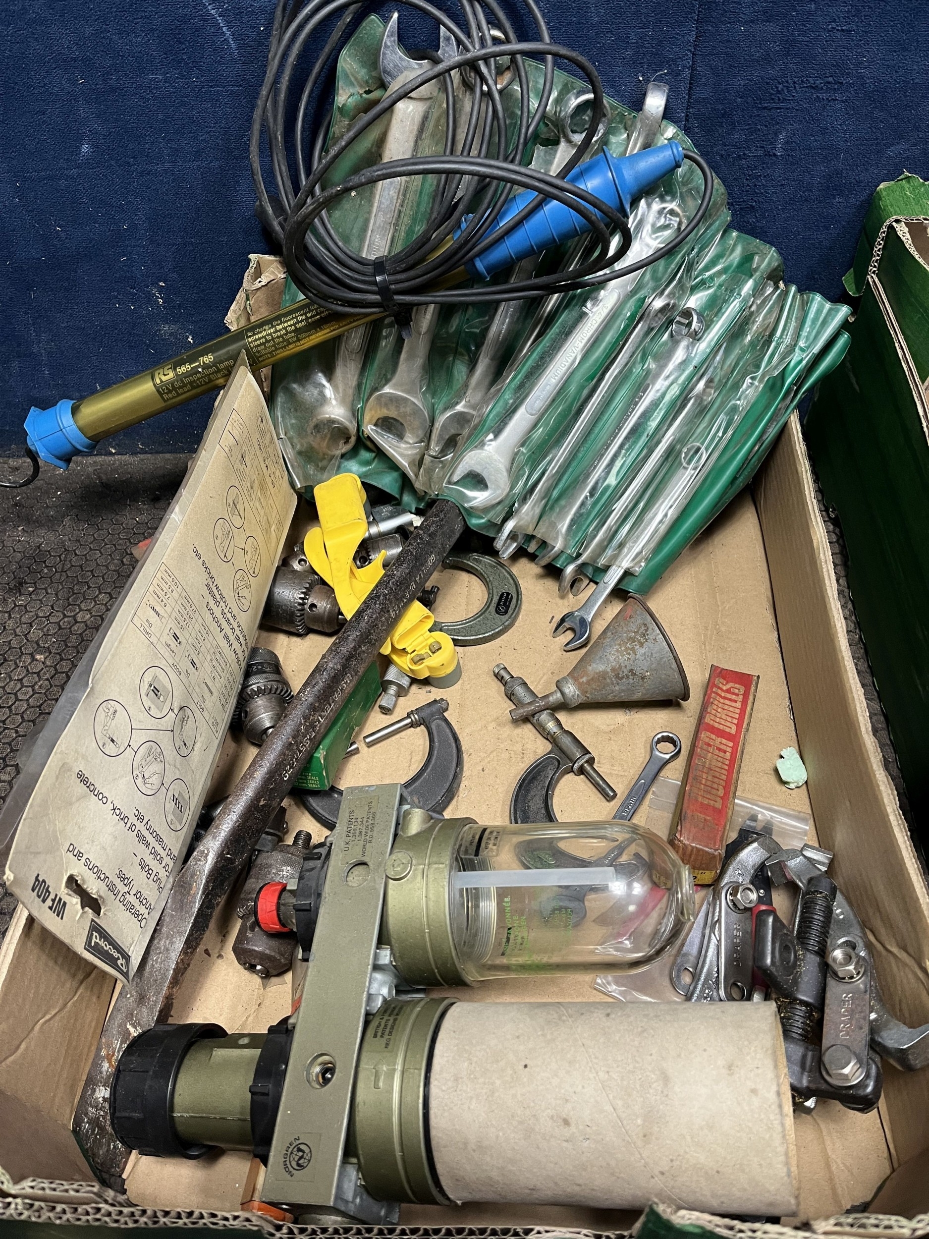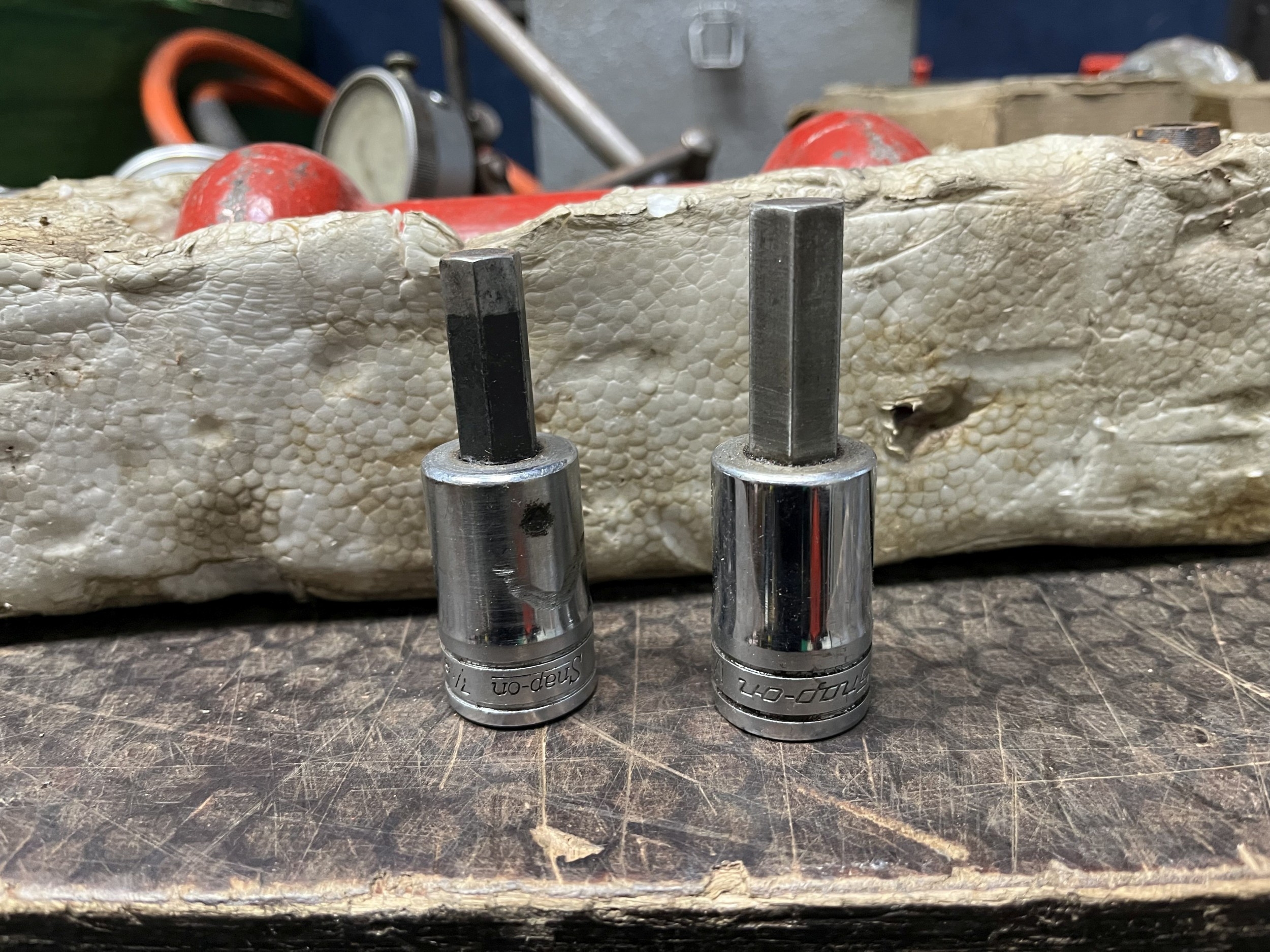 TWO TRAYS CONTAINING AUTOMOTIVE TOOLS, including two Snap-On Imperial Hex sockets, two valve spring compressors, a Pickavant Camshaft follower press set, a slide hammer, various marking stands and dial gauges, various micrometers, etc