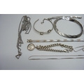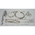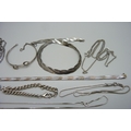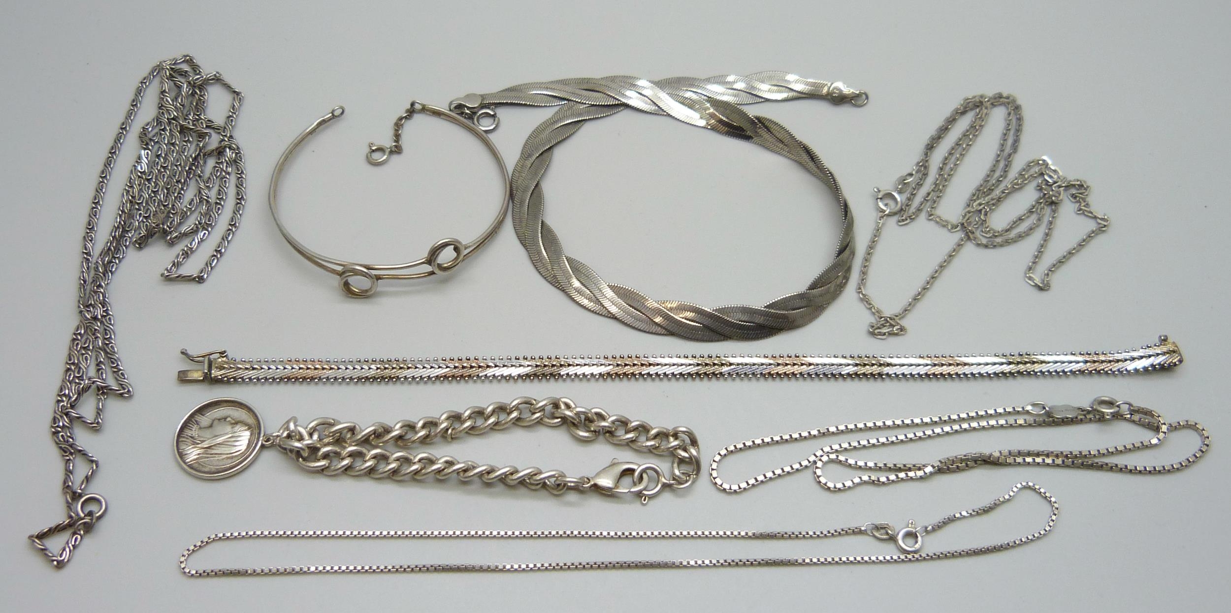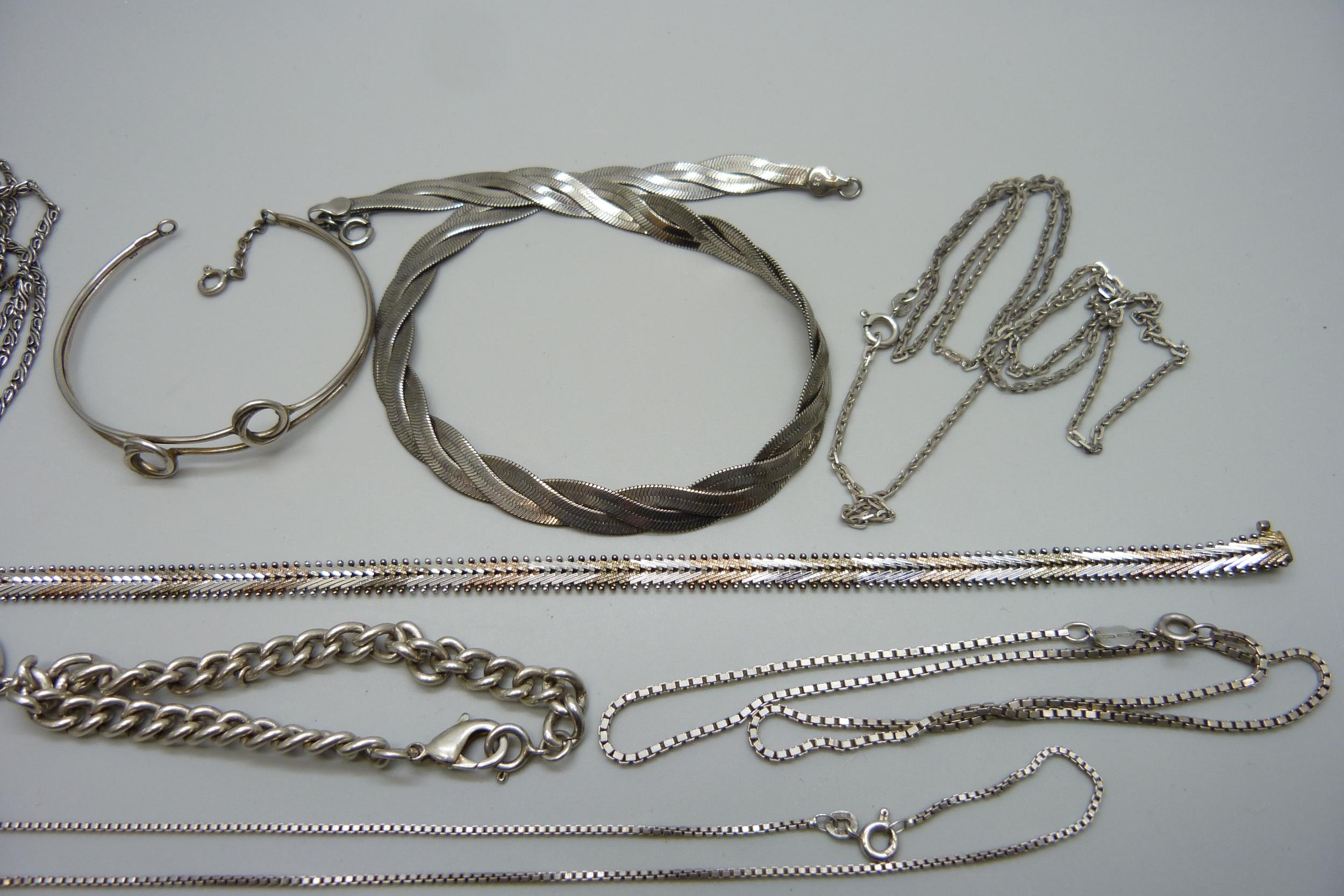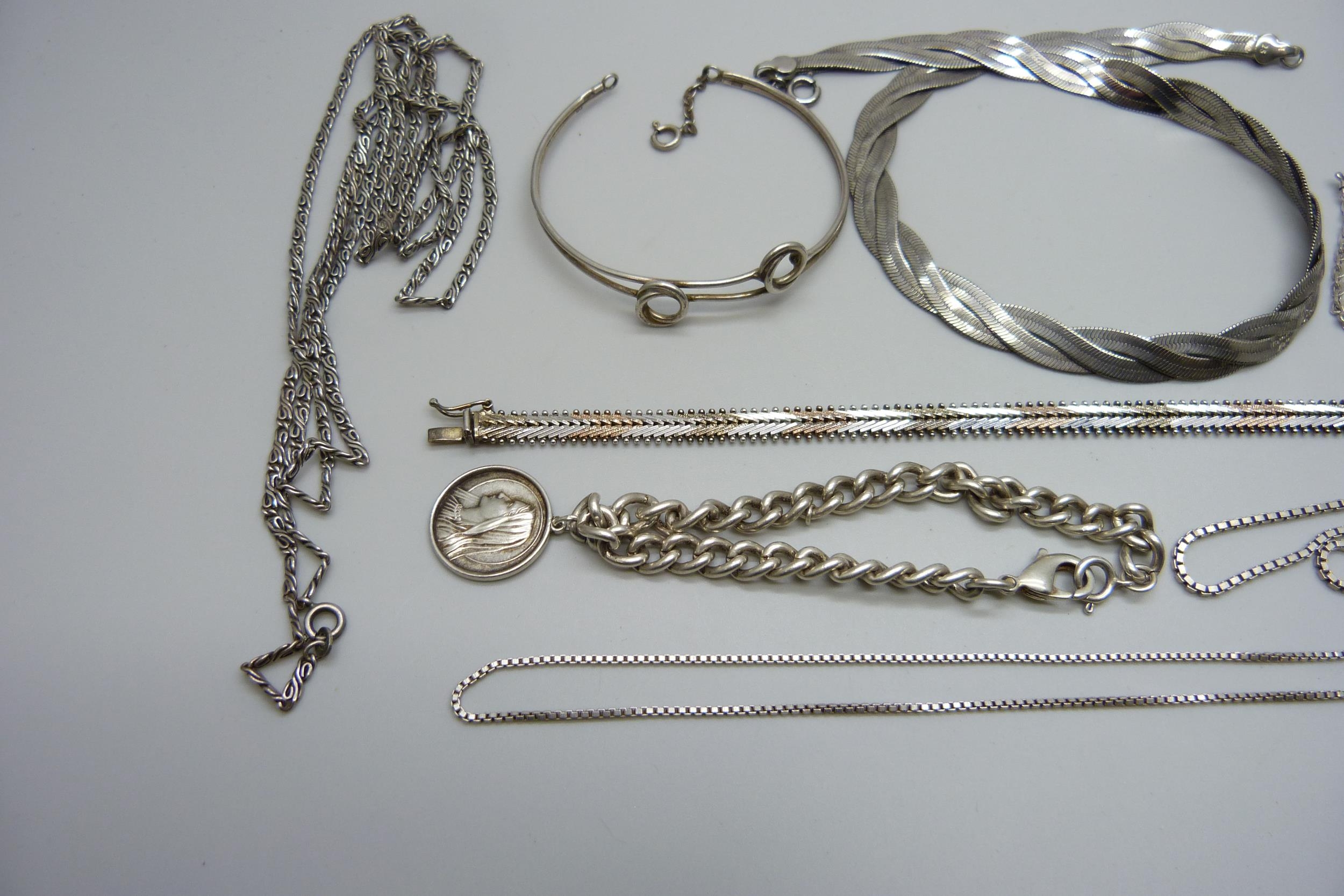 A collection of silver and white metal jewellery and a plated snake chain plait necklace, 70g