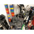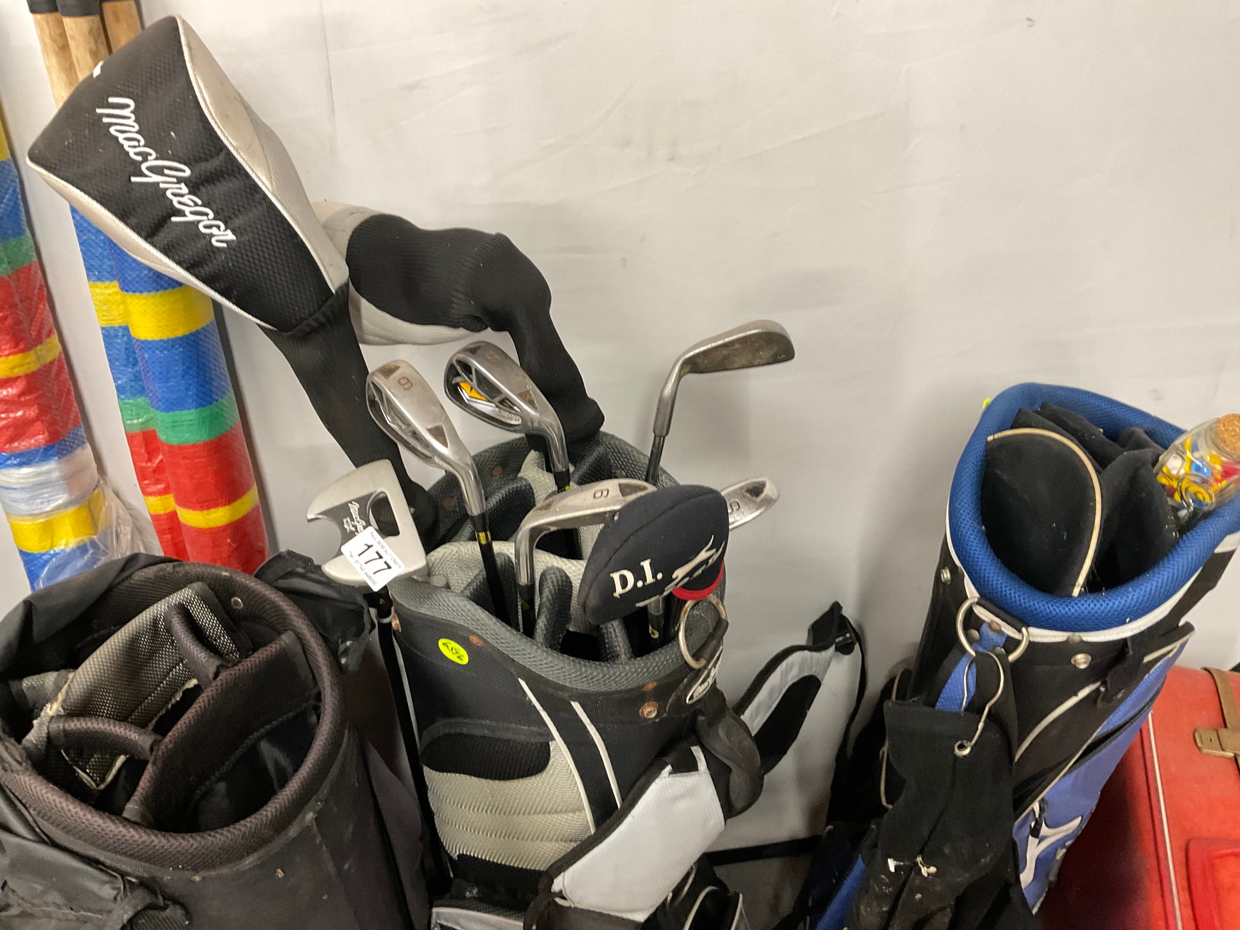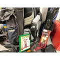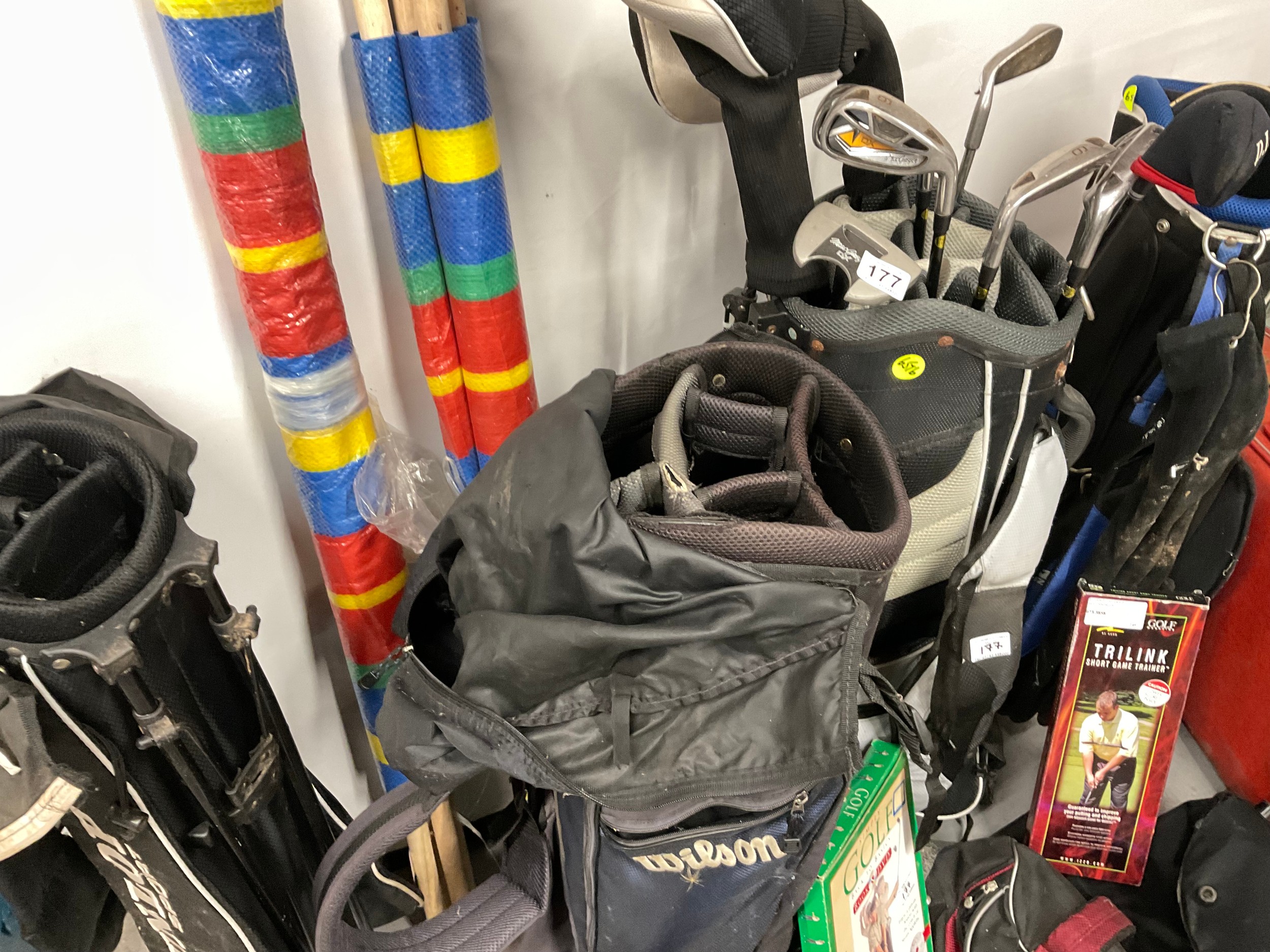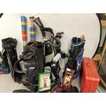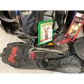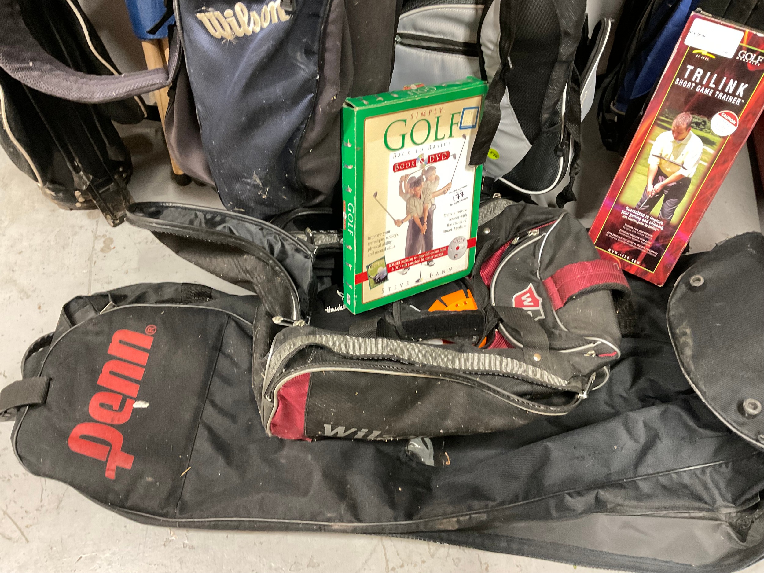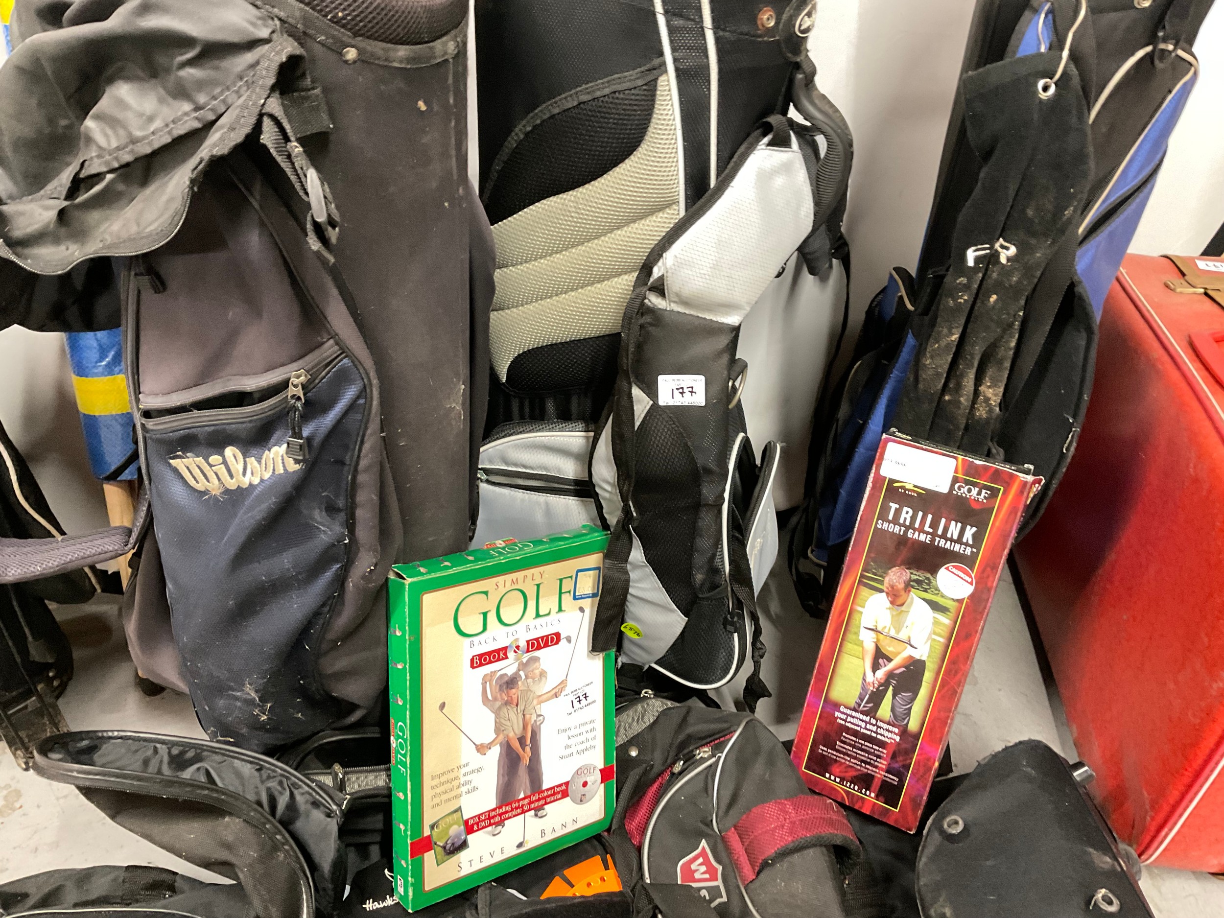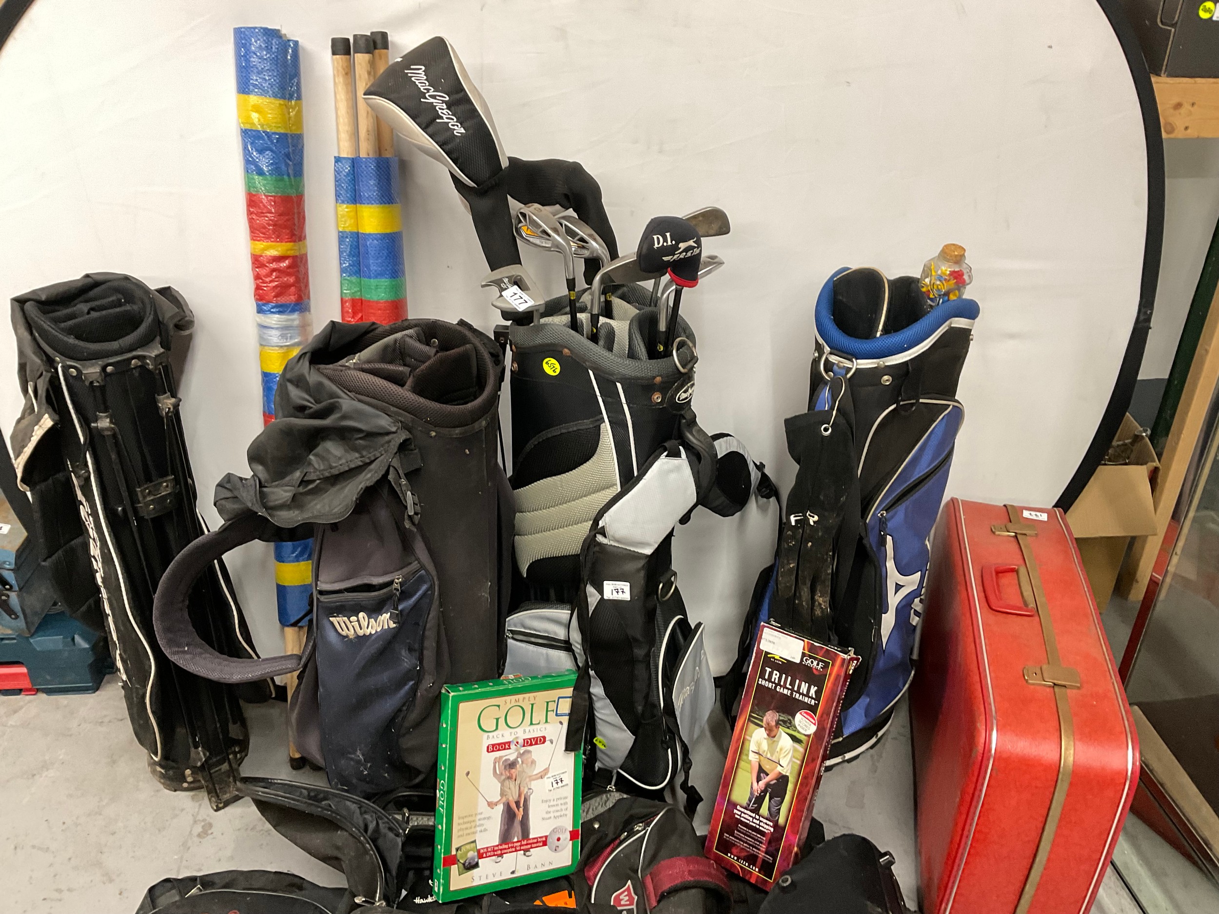 2 GOLF BAGS AND CLUBS, VINTAGE SUITCASE, WINDBREAKS BAGS, BACKPACKS ETC